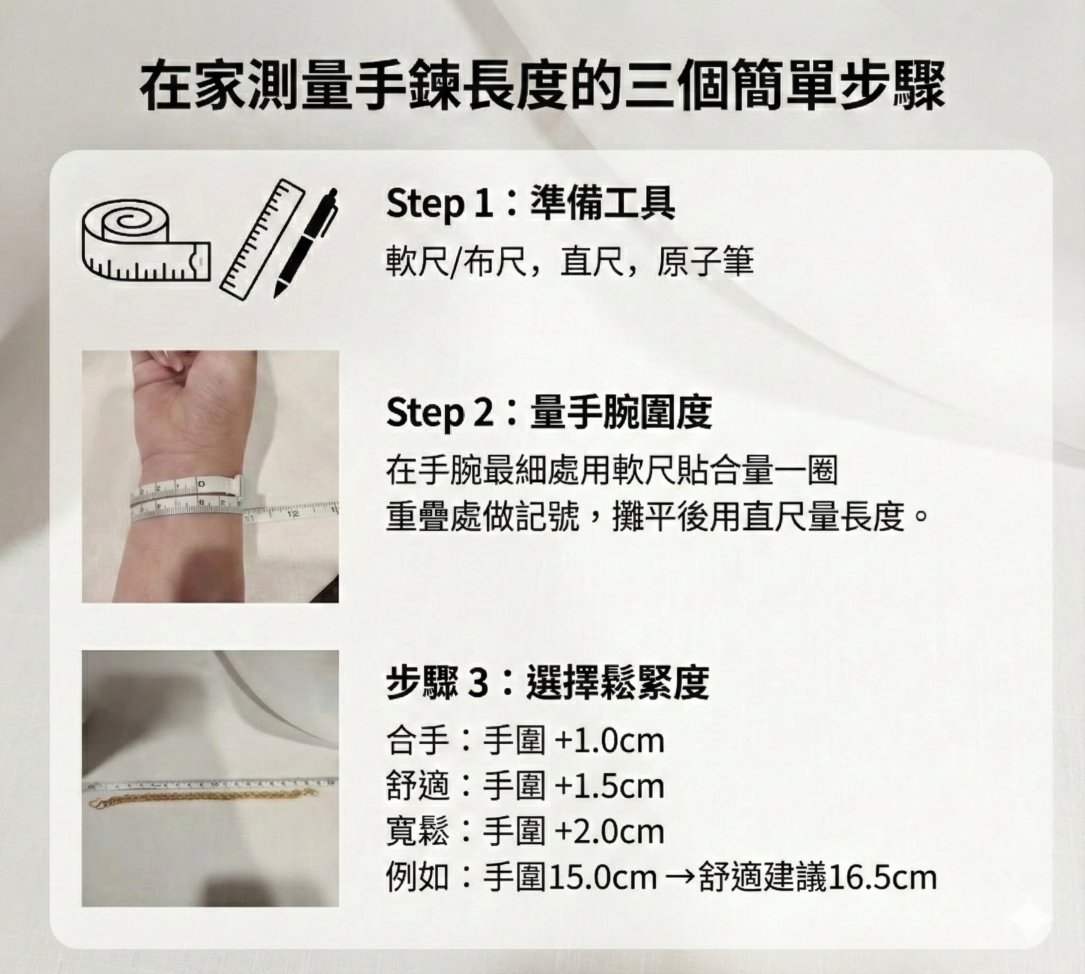 本文手把手教你量測手圍、換算手鍊長度與常見迷思,讓你下單前就找準自己的手鍊尺寸。
