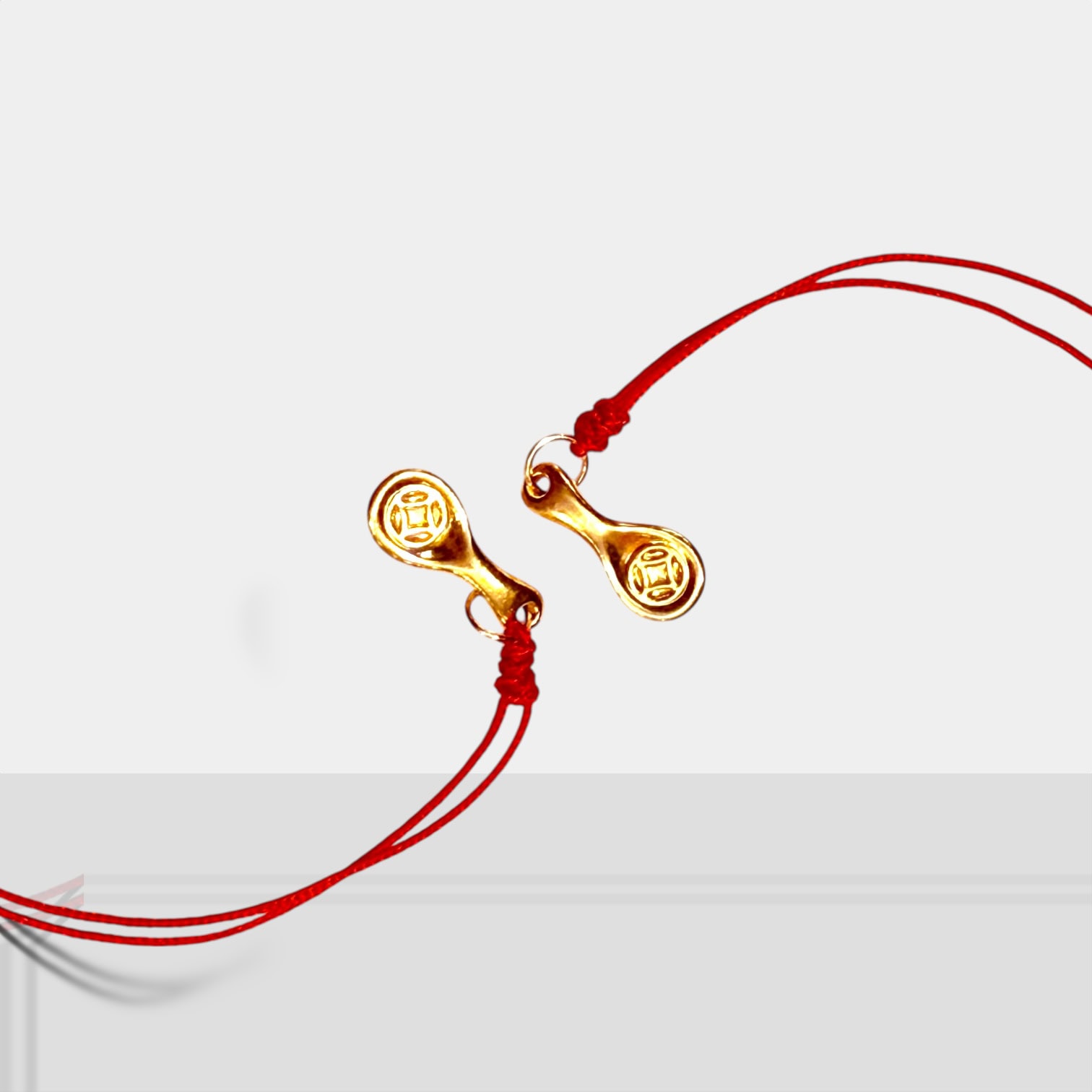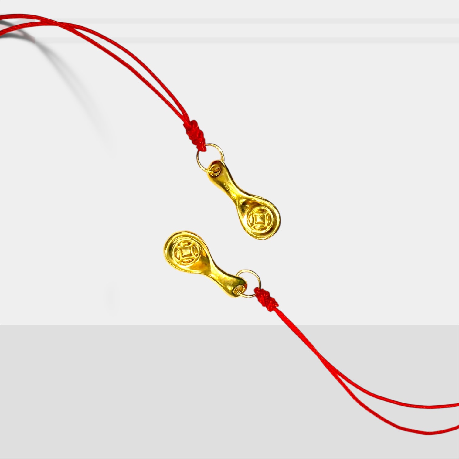 金湯匙造型的 9999 純金小墜,勺面浮雕吉字,搭配紅繩輕盈好戴;寓意一匙好運、衣食無缺,單戴或成對配戴都別緻。