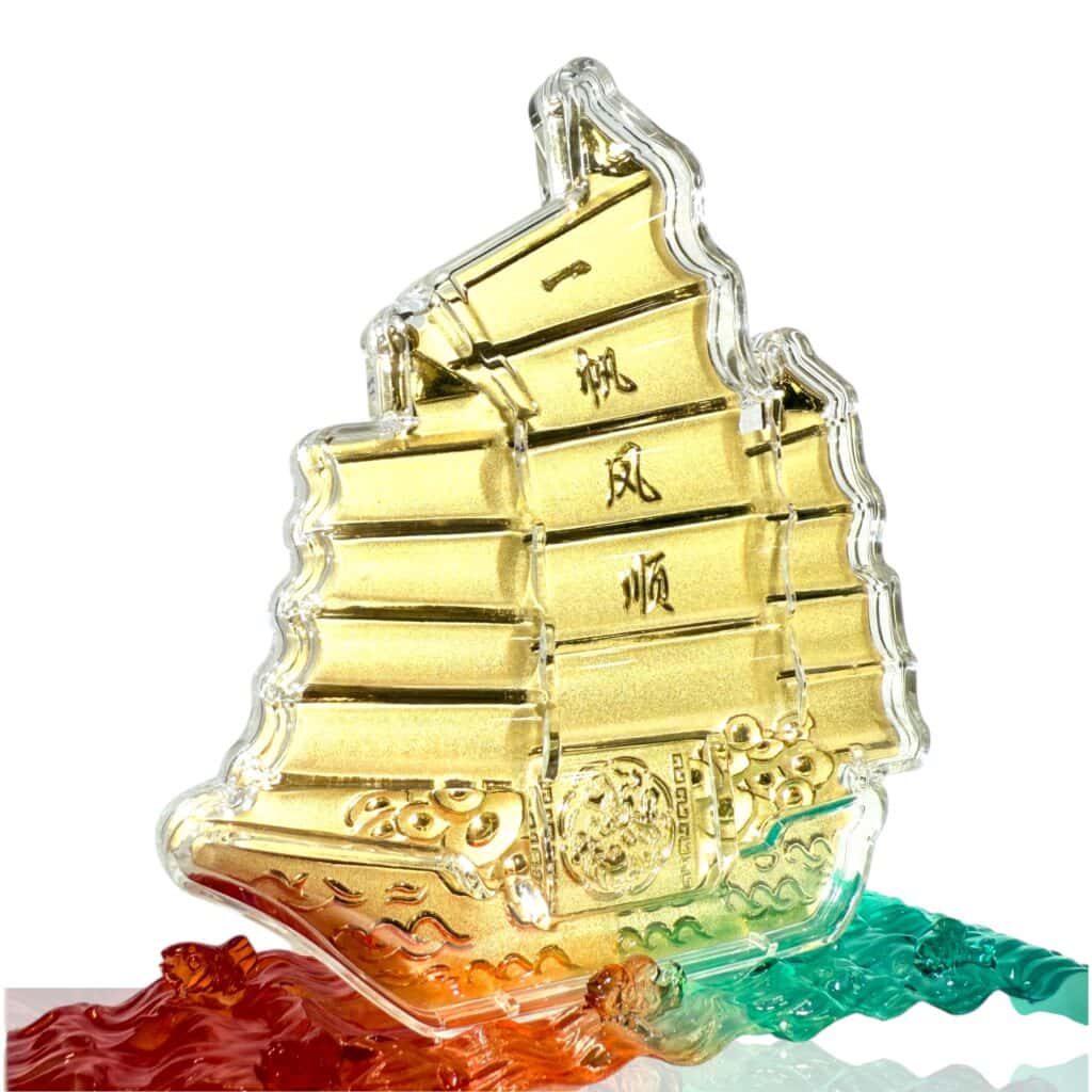 一帆風順金箔帆船,結合琉璃底座與紅色福禮盒,象徵乘風順遂、財源廣進。適合喬遷、開幕、升遷與企業贈禮,居家/辦公室皆宜的開運擺件,質感典藏、祝福滿分。