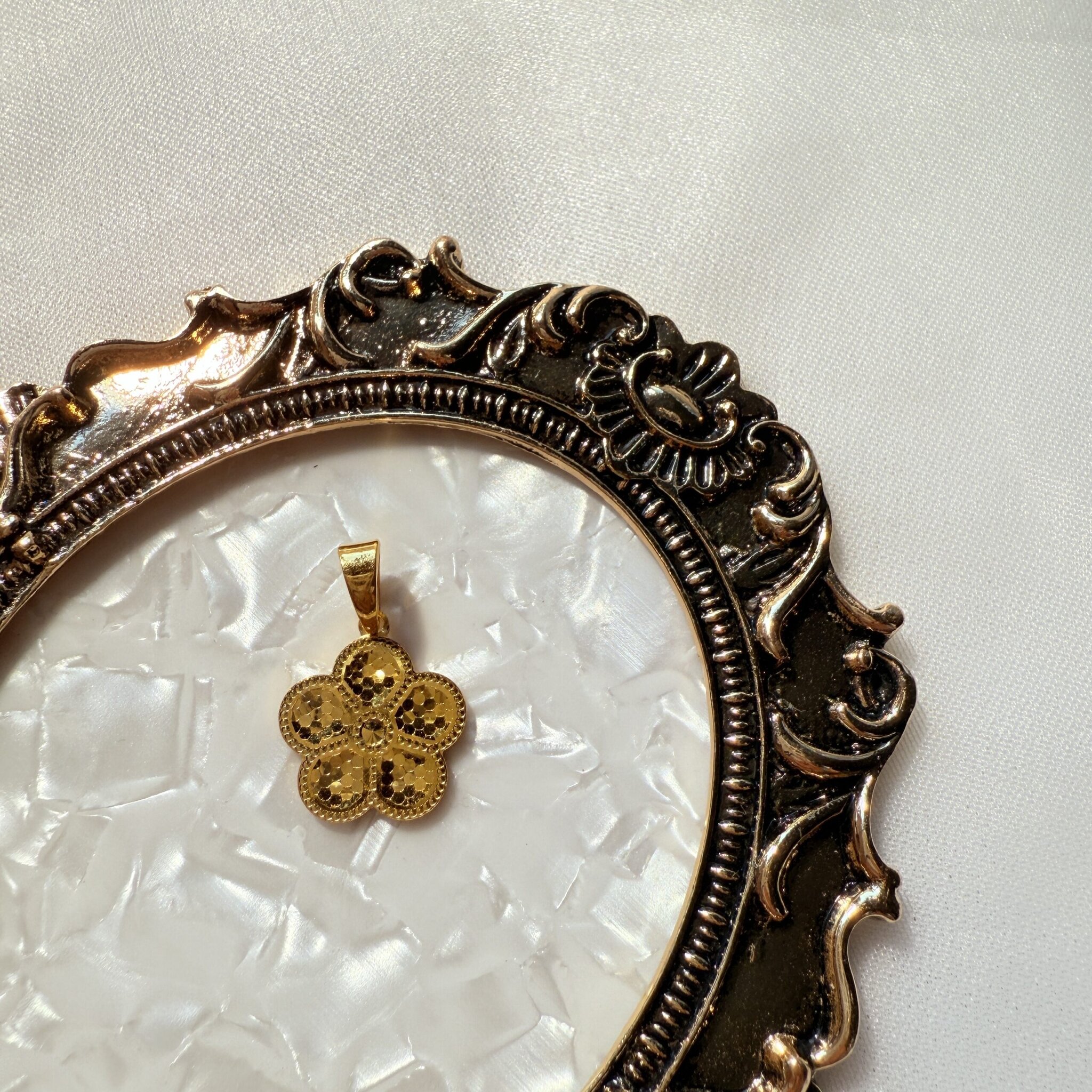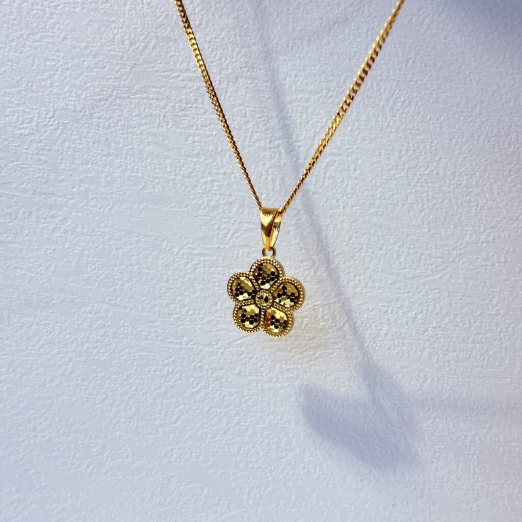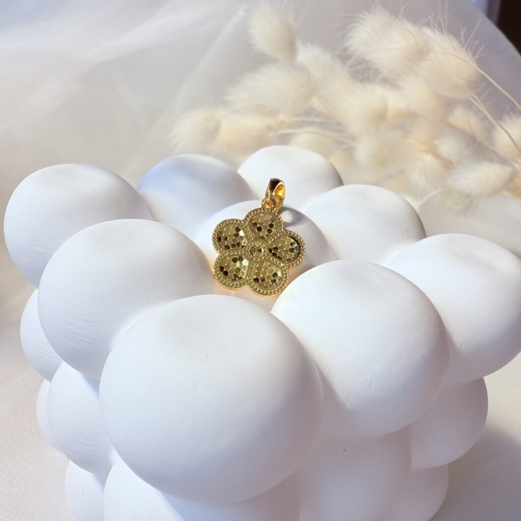 24K黃金精工雕琢,五瓣花造型寓意五福臨門,細膩雕紋映照光影,五福花影墜典雅耐看,適合日常配戴與贈禮。