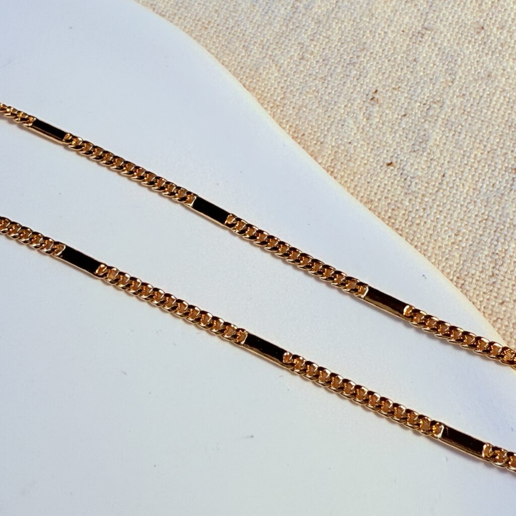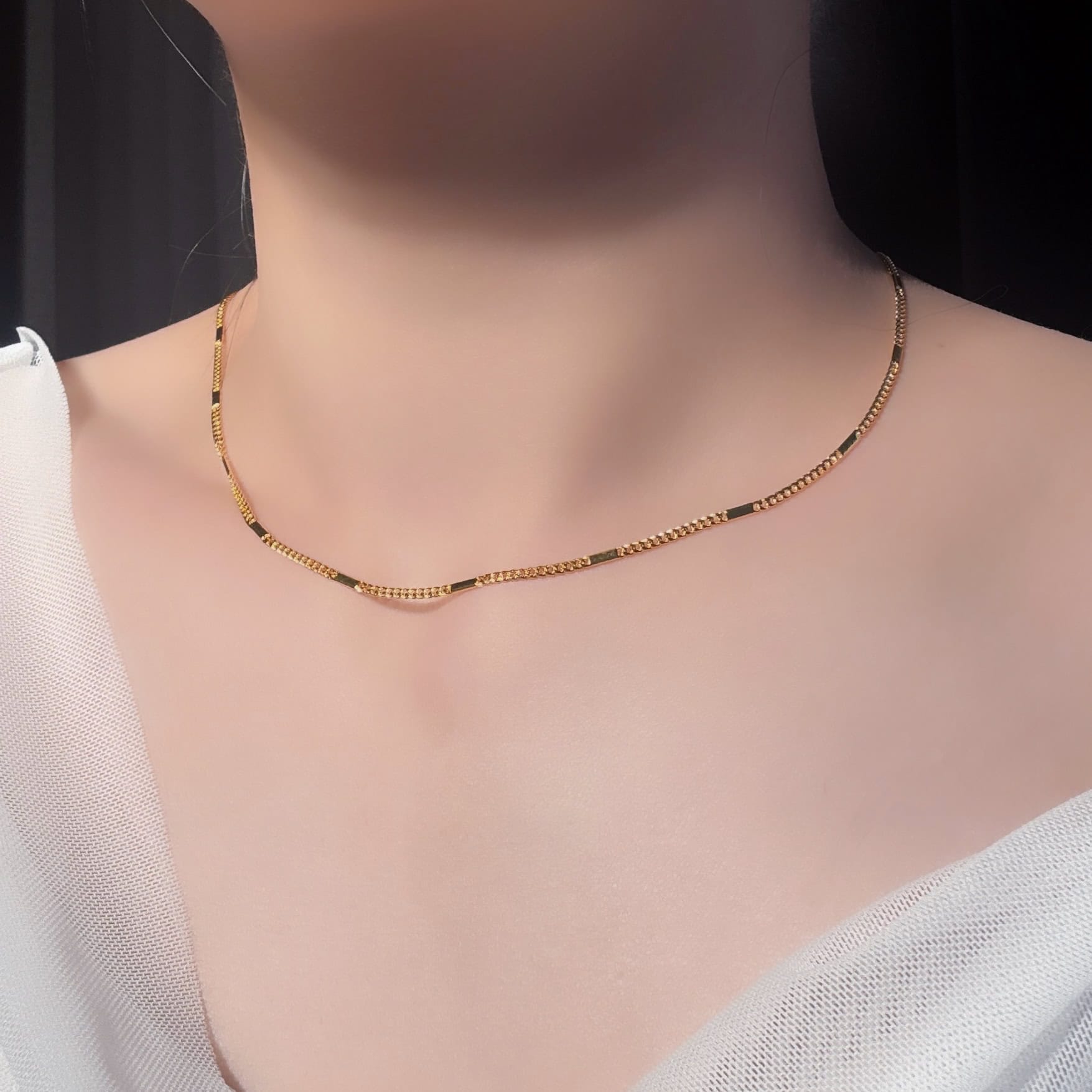 純金打造的間隔平片項鍊,鏈節與平片交錯排列,閃耀出獨特的光影節奏。造型俐落百搭,單戴展現極簡時尚感,也能搭配墜飾疊戴,營造更豐富的層次,是日常與正式場合都適合的經典金飾。