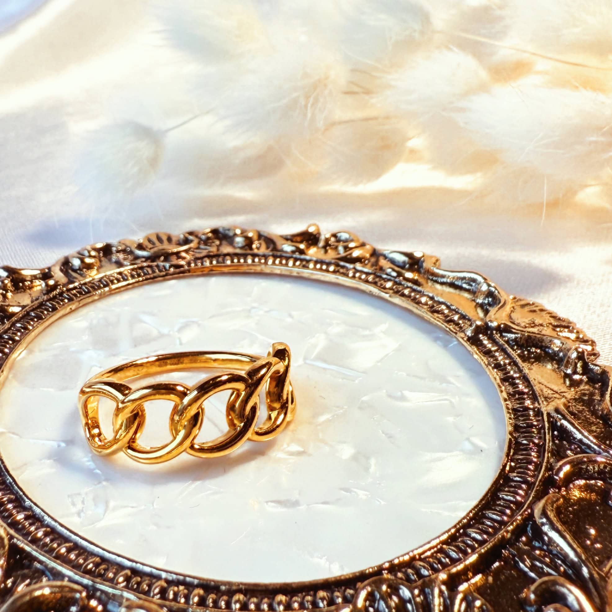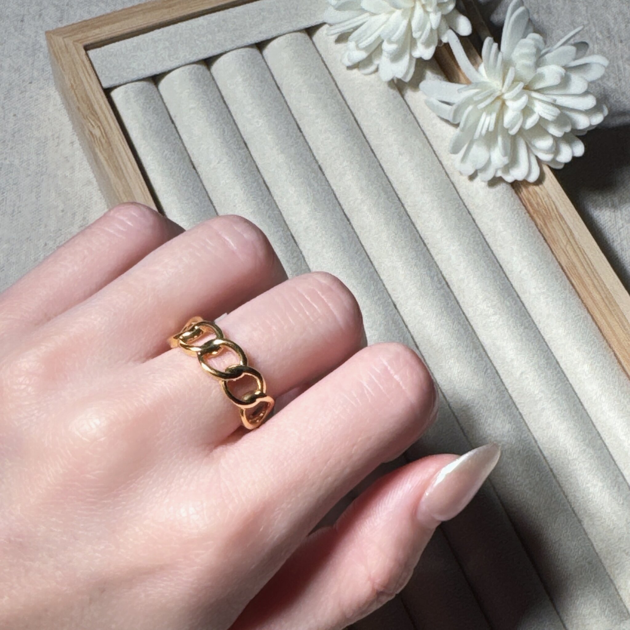 環環相扣的設計,展現優雅與堅定。這款黃金戒指以流暢的鏈扣造型打造,簡約中帶著時尚感,不論單戴或疊戴都能突顯獨特氣質,是日常穿搭與送禮的經典之選。