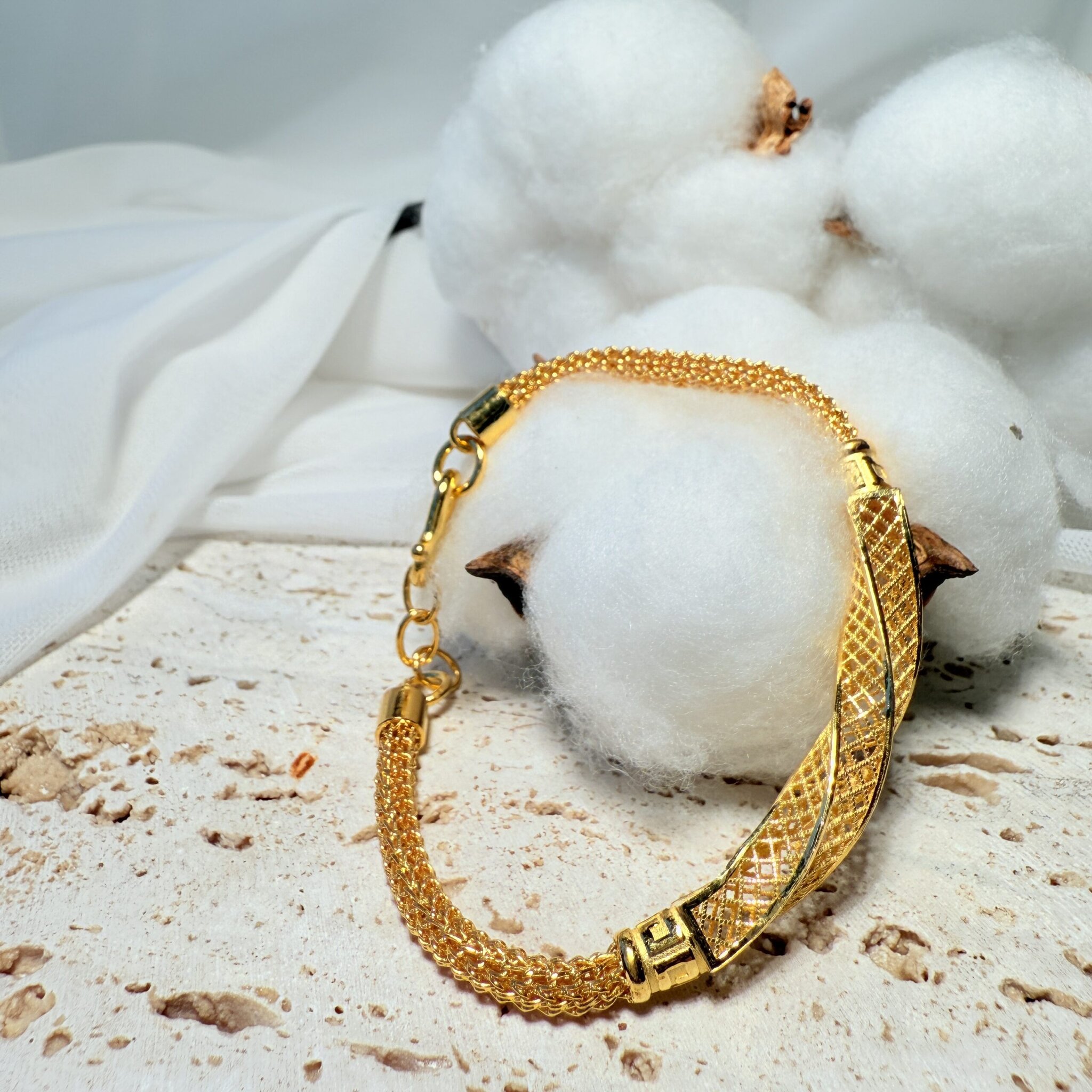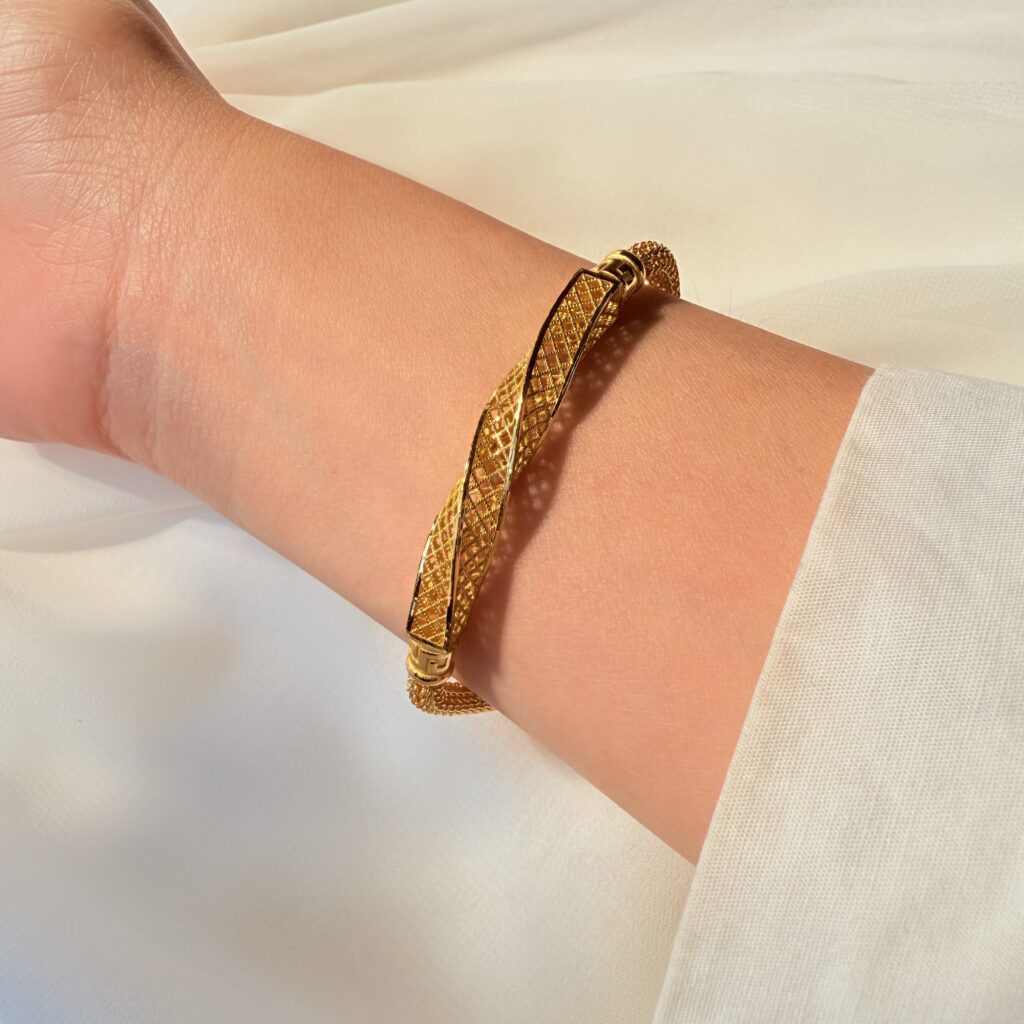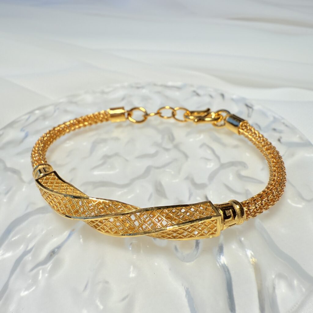 夢語鎖心手鍊。立體交錯設計卻蘊含質感,金紋與扭轉設計展現優雅層次,細膩工藝讓光影隨手腕流轉。