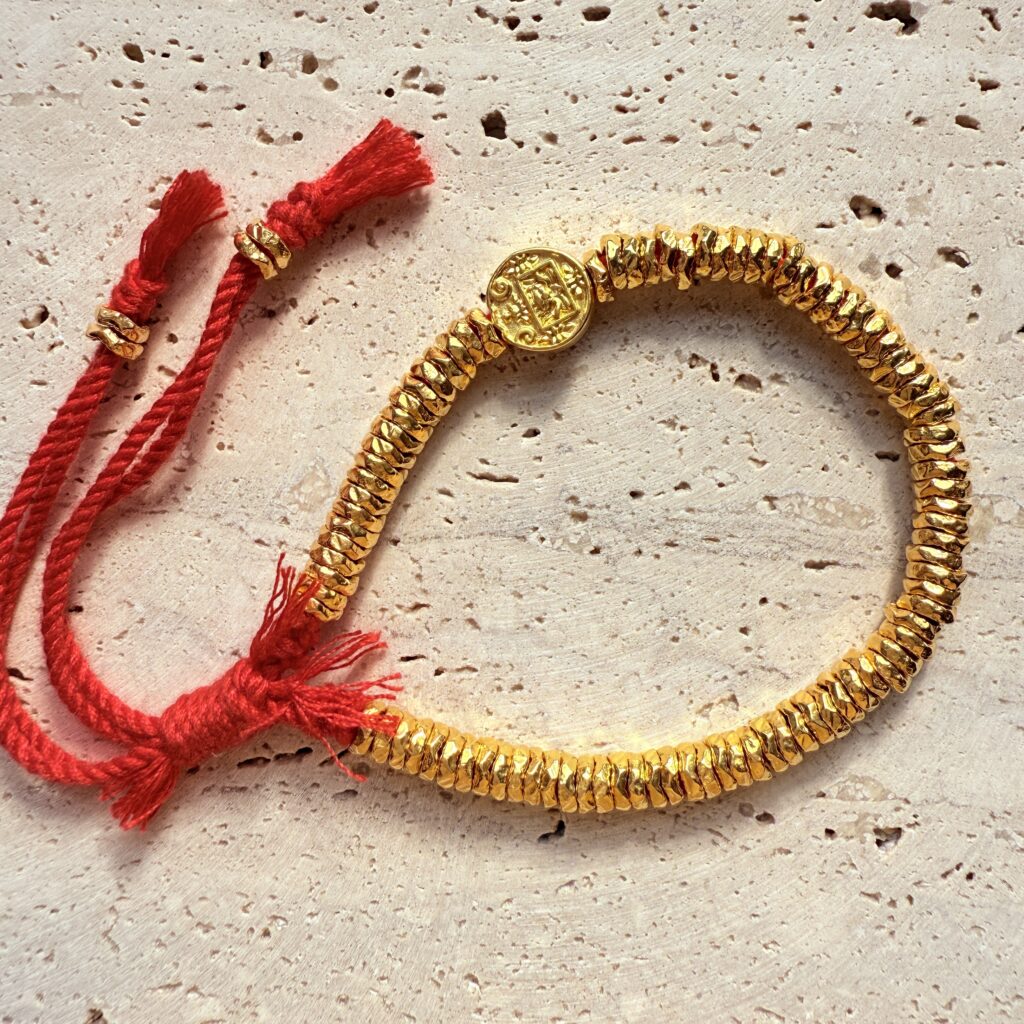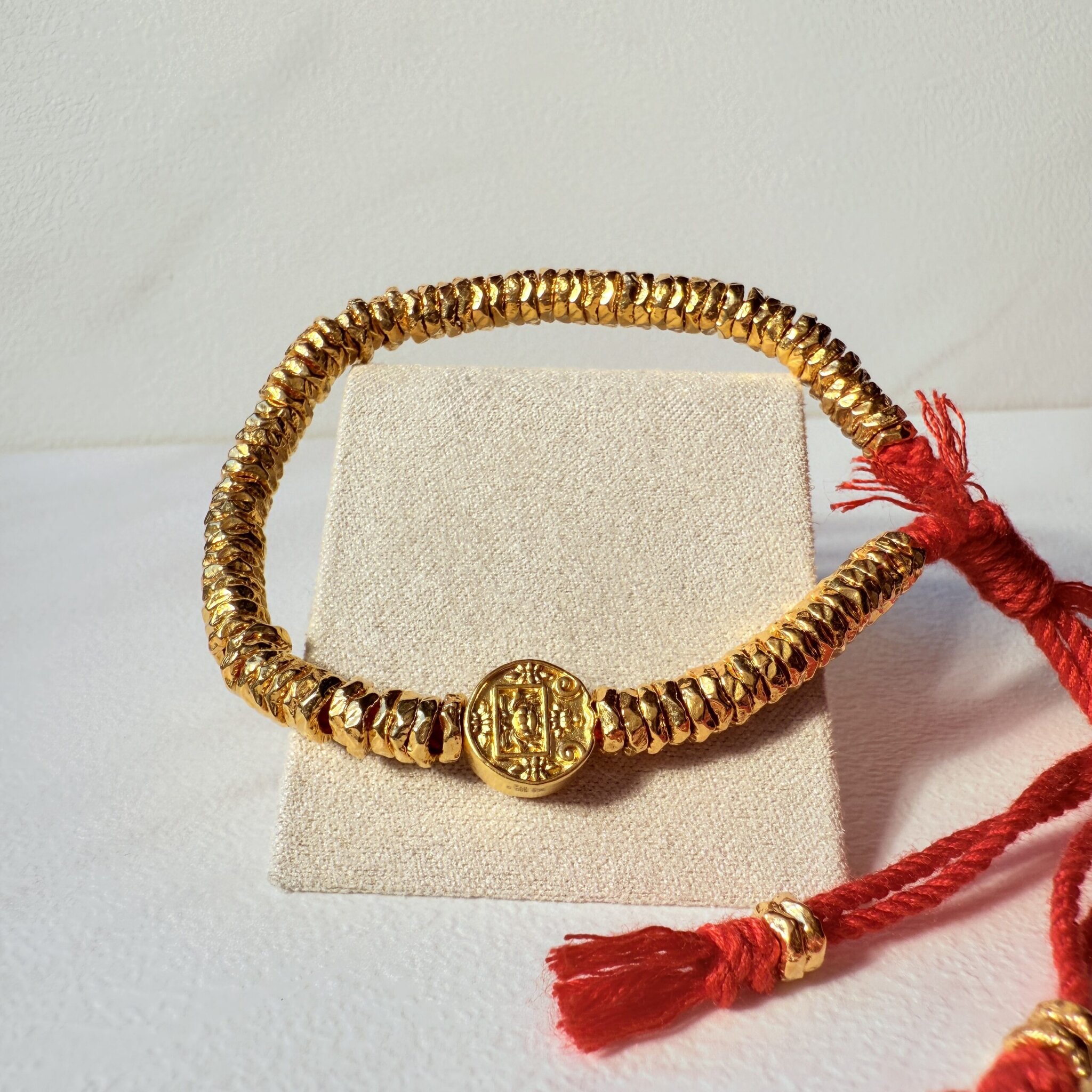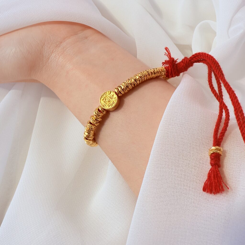 以赤紅手工編繩串起滿排細緻金珠,中央點綴圓形祈福錢章,象徵聚財納福與平安守護。尺寸可調、單戴或疊搭皆亮眼,日常到節慶都能輕鬆駕馭,是送禮自用都體面的招好運必備紅繩手鍊。