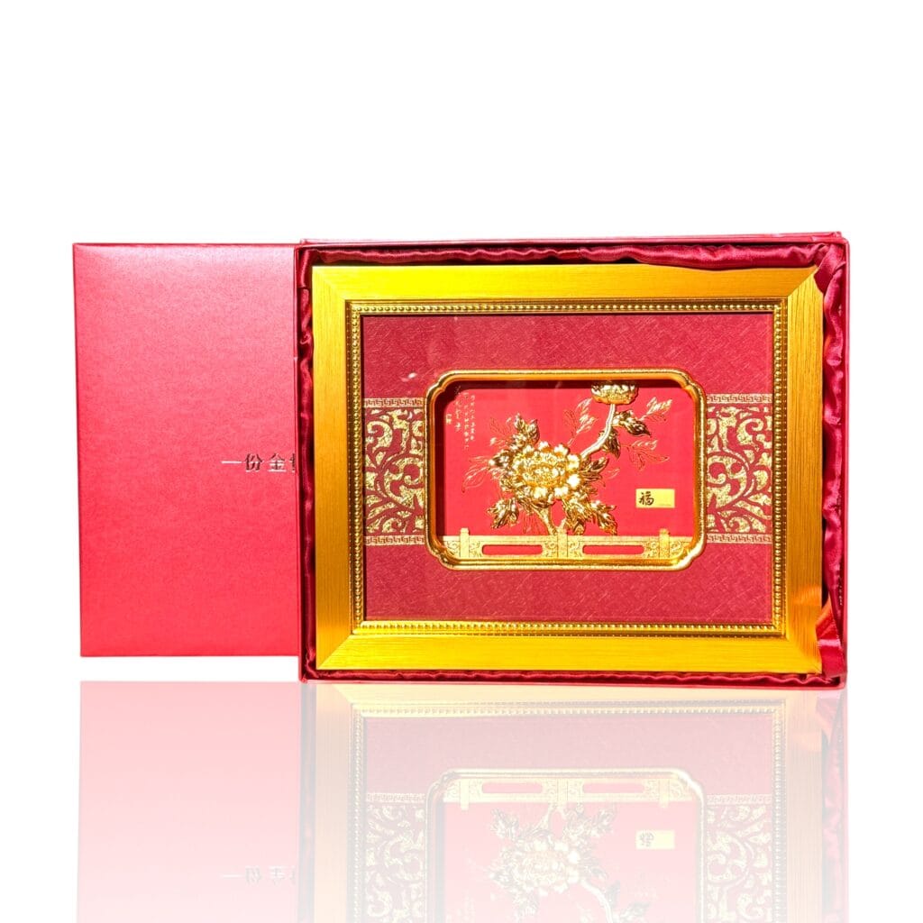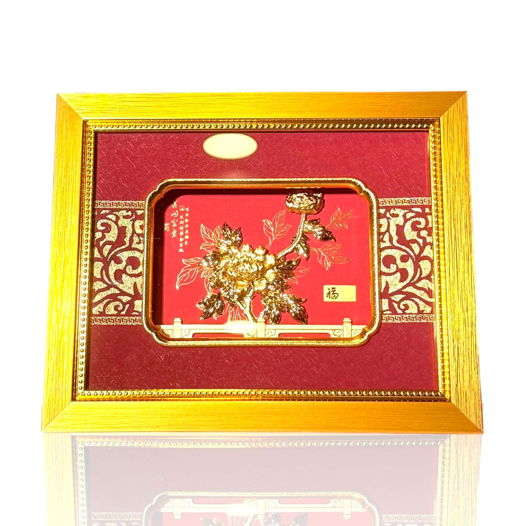 金箔牡丹立體框畫,紅底金雕層次細膩,寓意花開富貴、福運長春。適合客廳玄關與辦公空間陳設,新居落成、婚慶與開幕送禮首選,典雅禮盒包裝即送即擺。