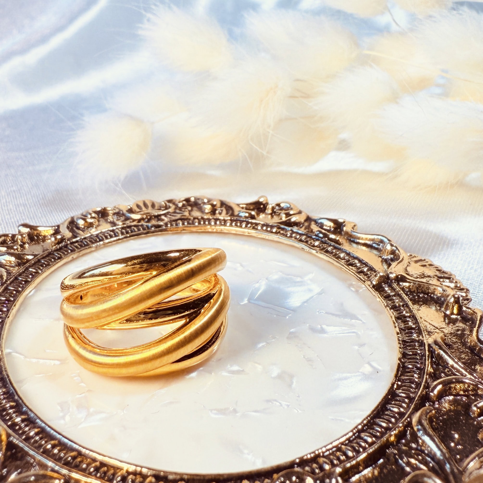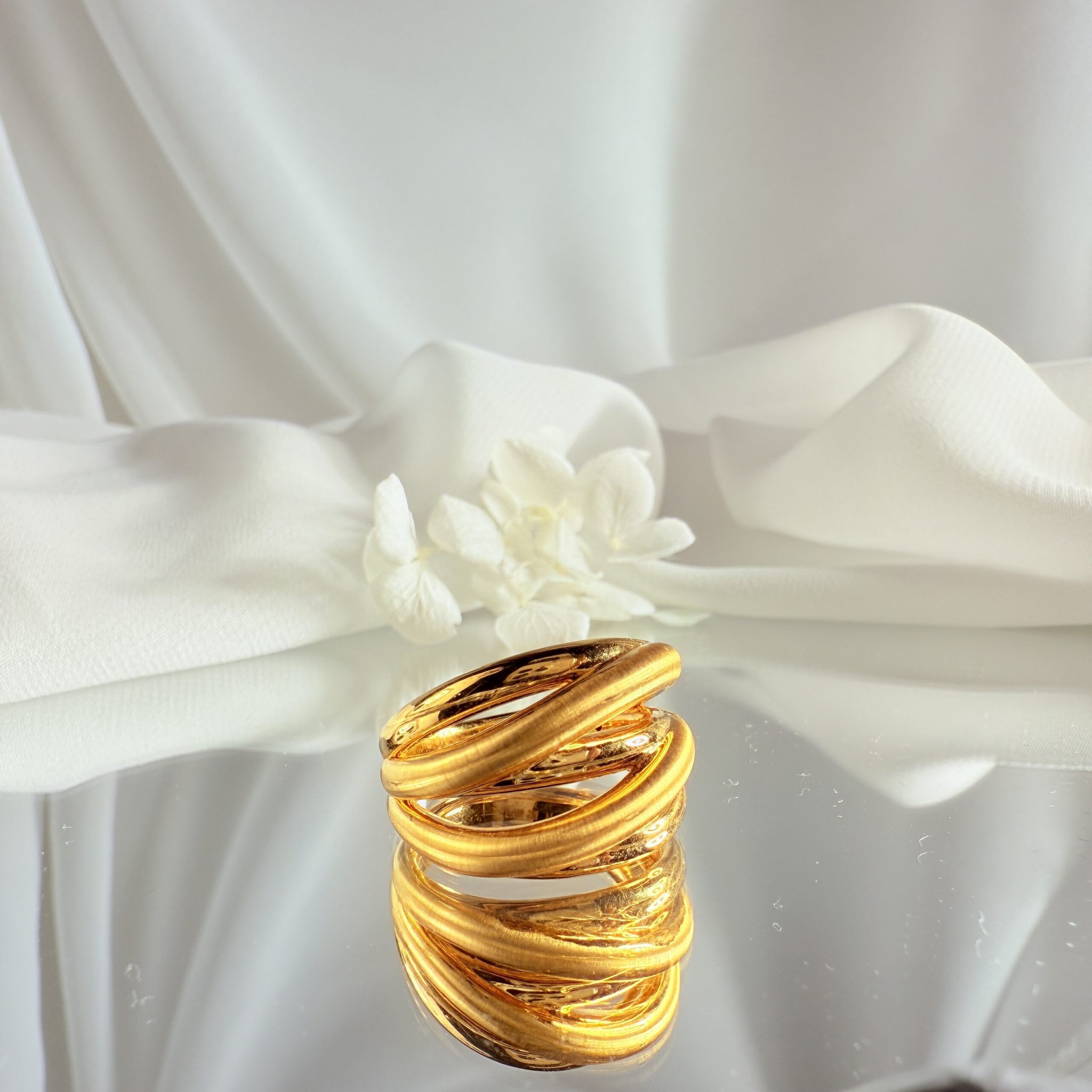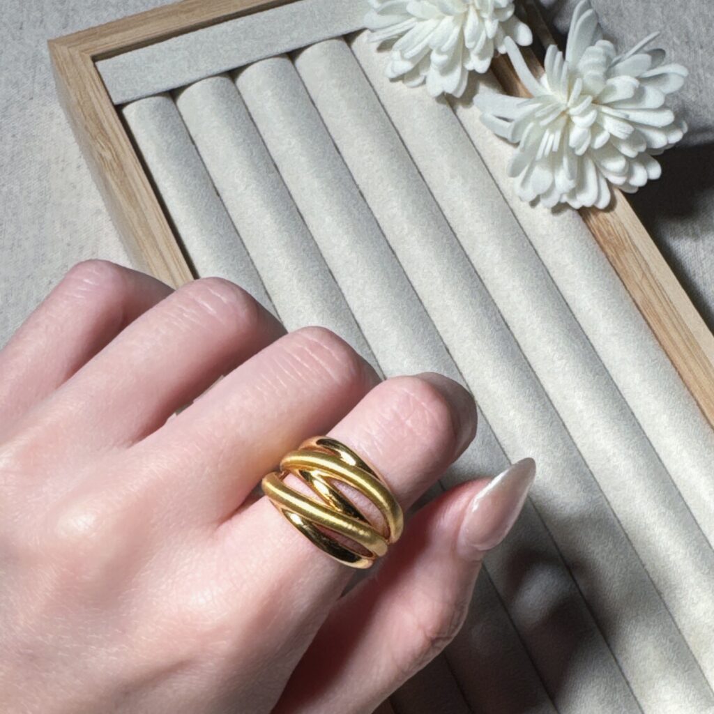 以層疊交錯的立體曲線設計打造,這款黃金寬版戒指展現大氣與質感,佩戴時流露優雅光影律動,無論日常或宴會皆能成為注目焦點。