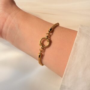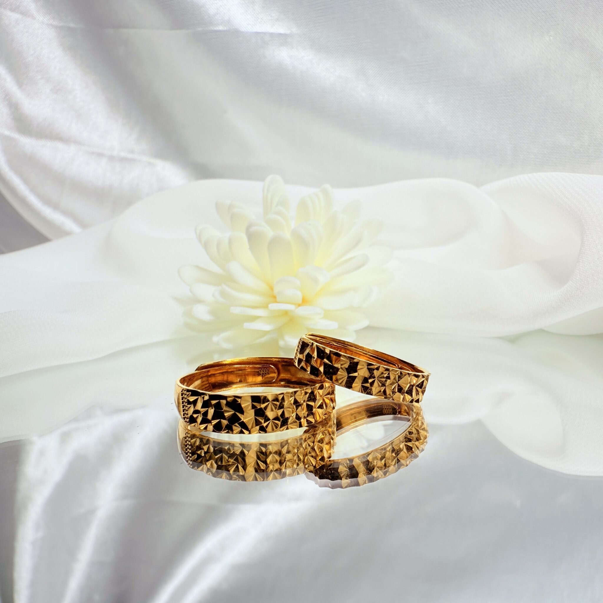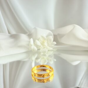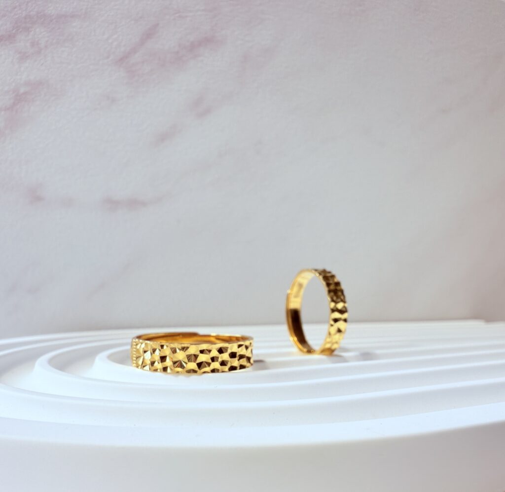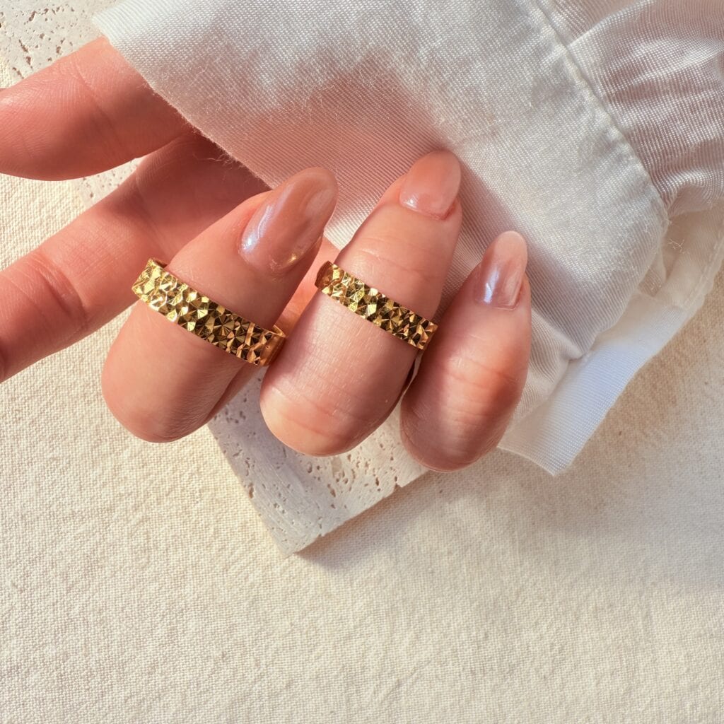 多圈細紋以疊階方式環繞,微霧與亮面在指間交錯成光帶;圓弧內壁滑順好戴,日常耐看,單戴俐落、疊戴更有層次。