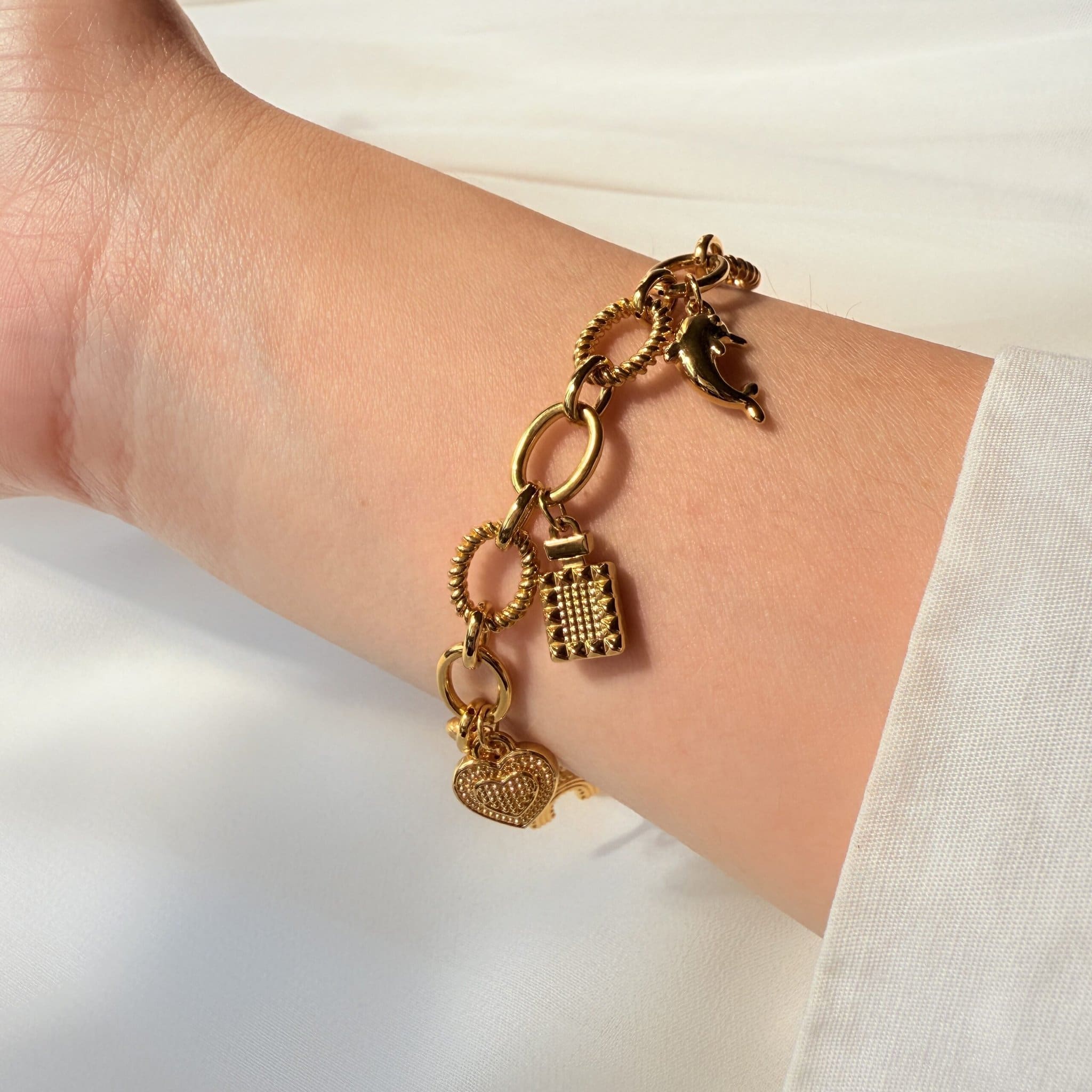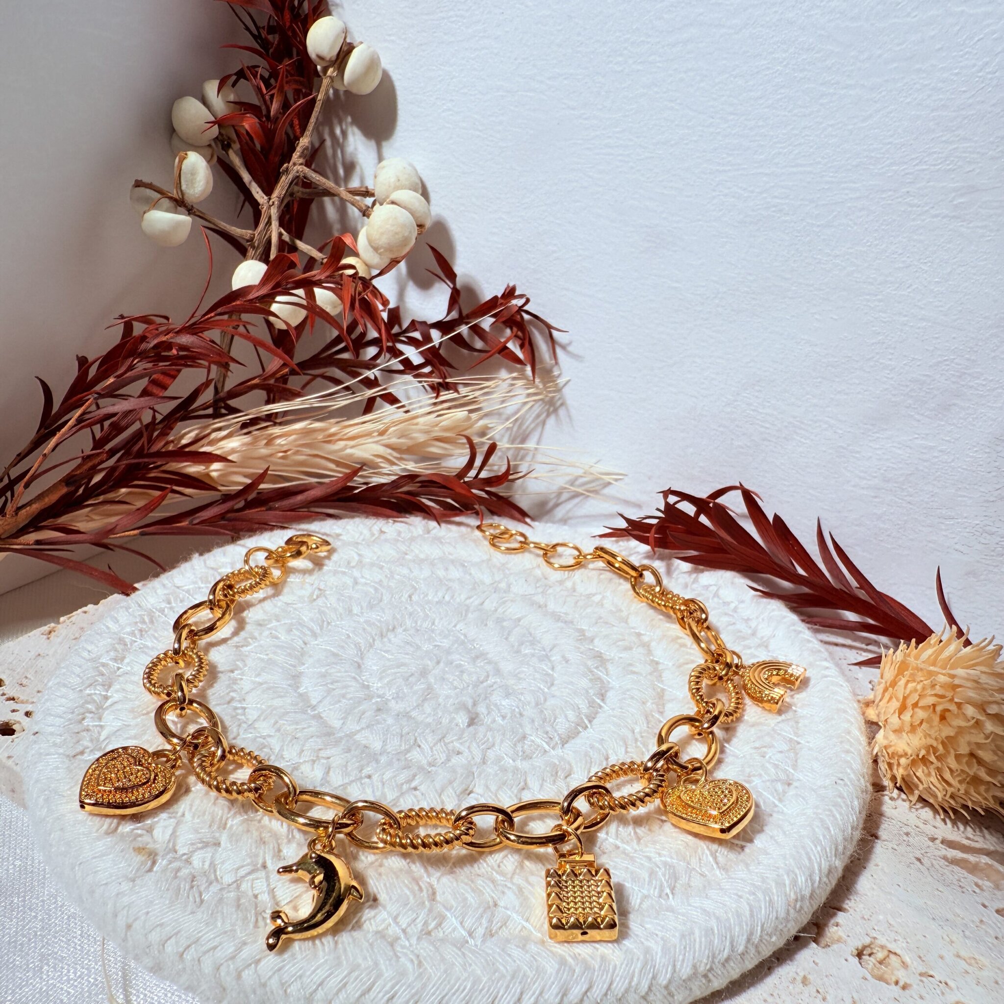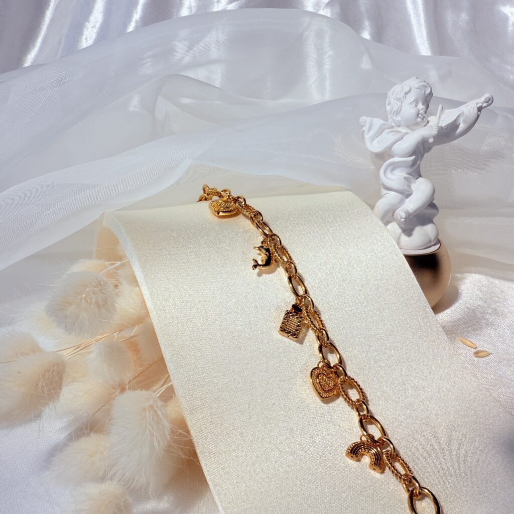 純金串飾手鍊,以愛心、鎖頭、動物等小巧吊墜串聯而成,每個細節都是日常的祝福印記,適合隨身佩戴,展現獨特風格與溫柔浪漫。