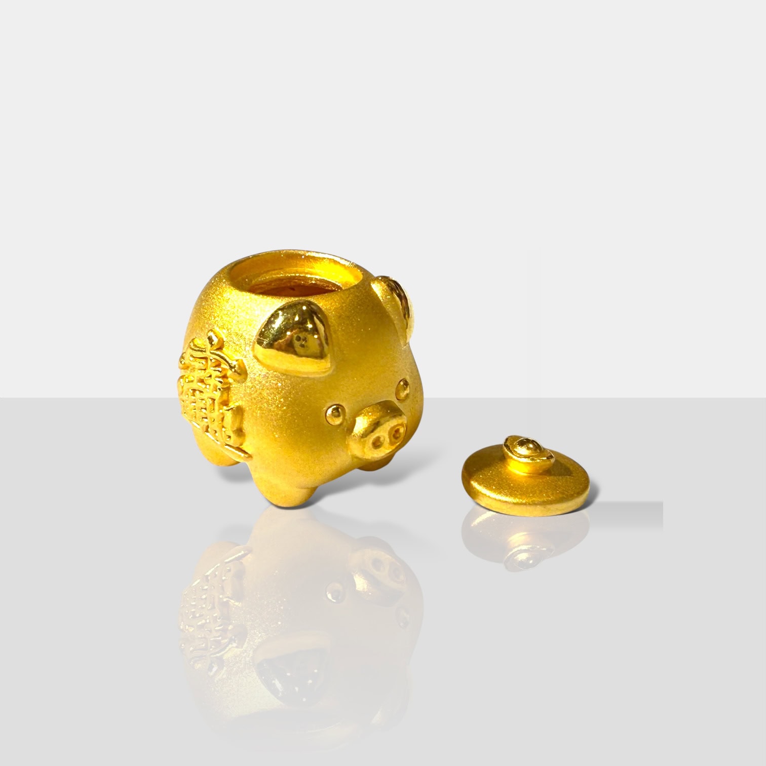 可開蓋的 9999 純金小金豬,頂部元寶造型、側身吉字浮雕;圓潤可愛又具儀式感,寓意聚財納福,尺寸小巧,收藏與擺設皆宜。