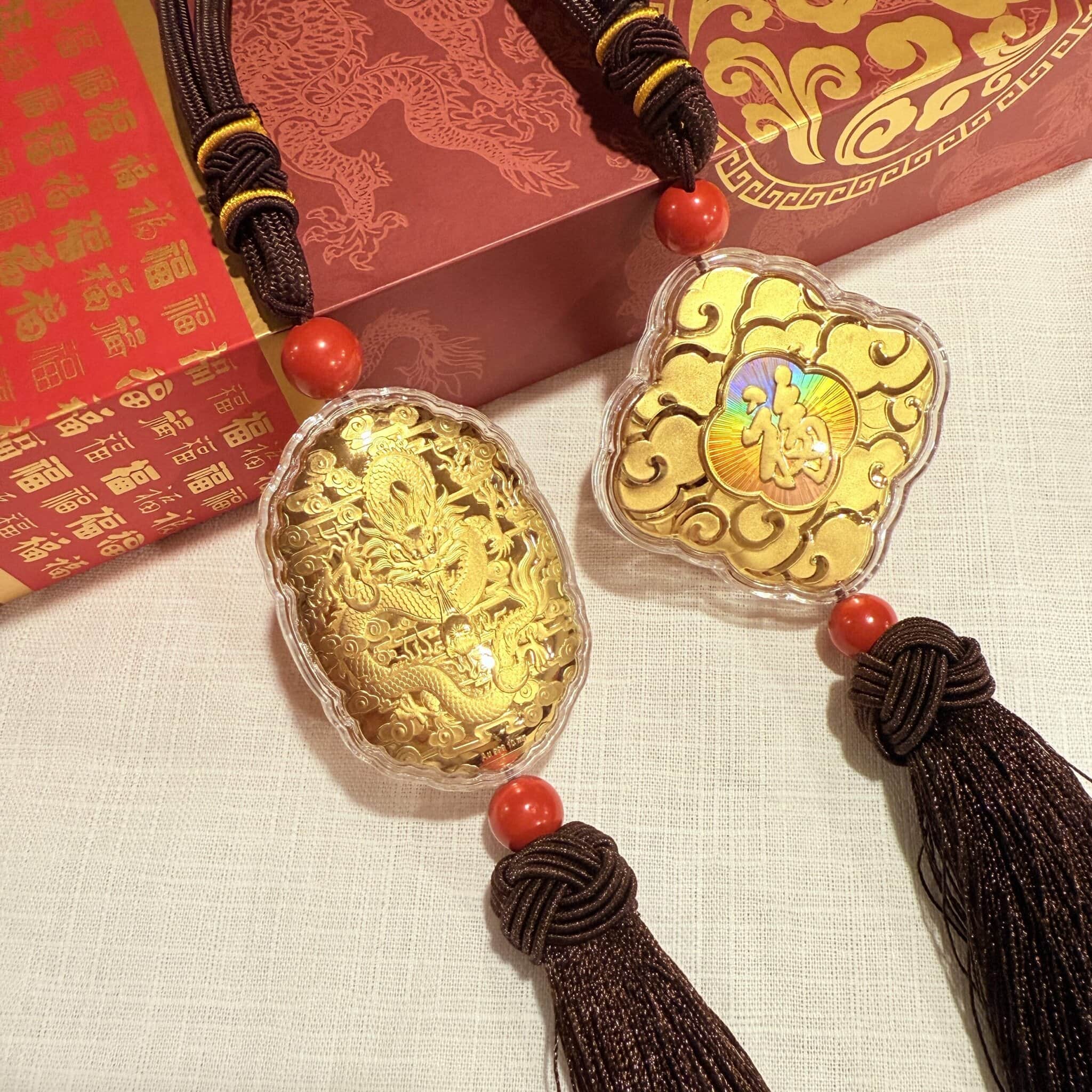 結合「福字」與「祥雲」圖騰,搭配質感流蘇與紅珠點綴;可掛車內、居家或店鋪門口,寓意平安納福、招財添運,送禮自用皆相宜。