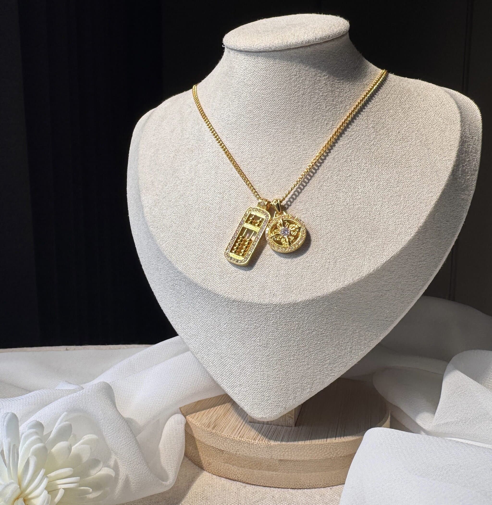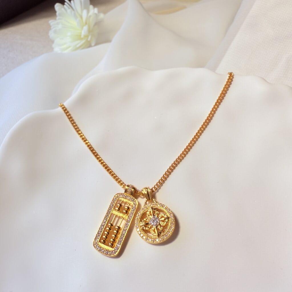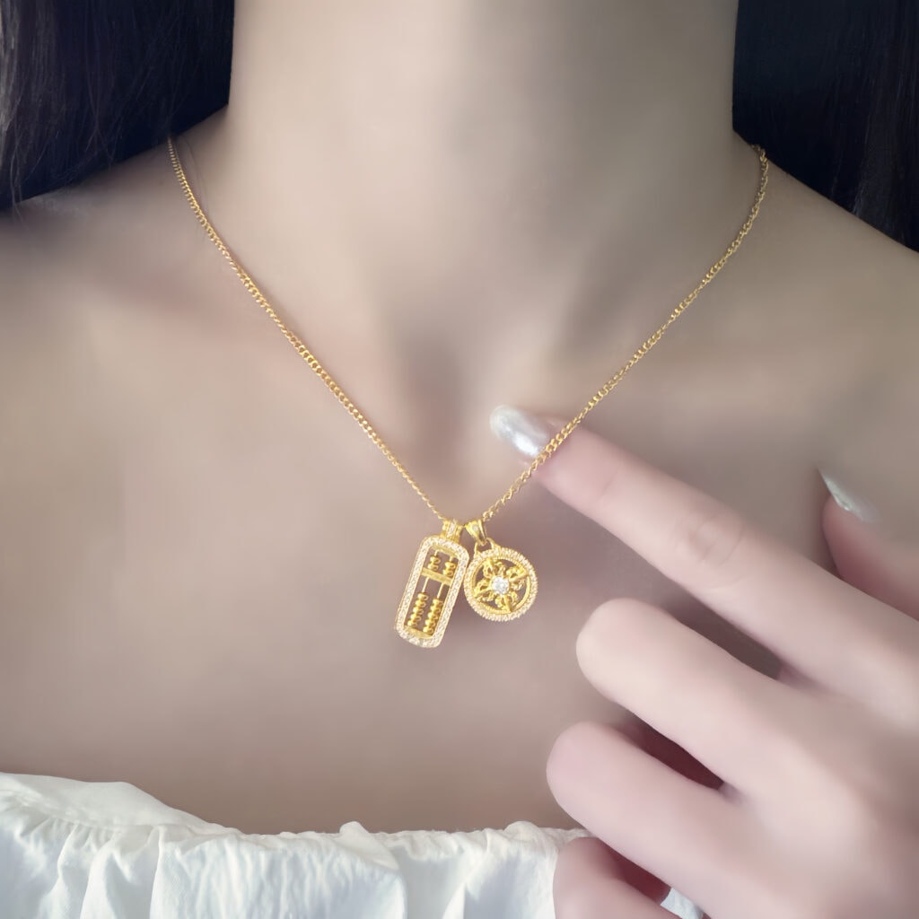 黃金算盤與金幣雙墜項鍊,象徵招財聚富與事業順遂。設計大方寓意吉祥,適合送禮或自戴,為日常添上財運守護與質感。
