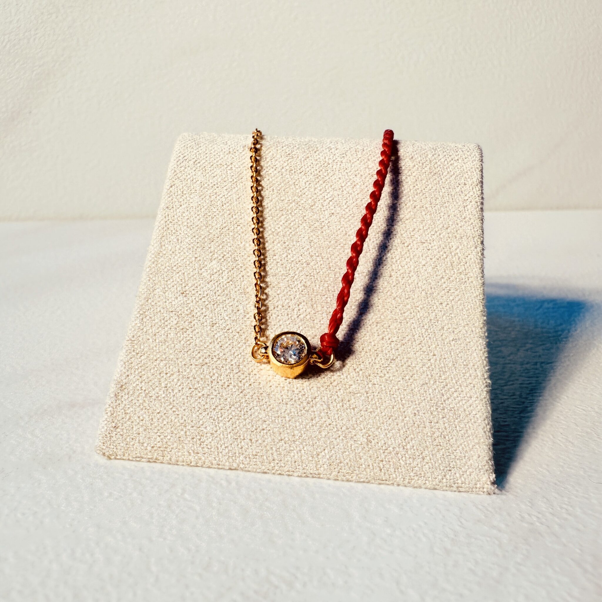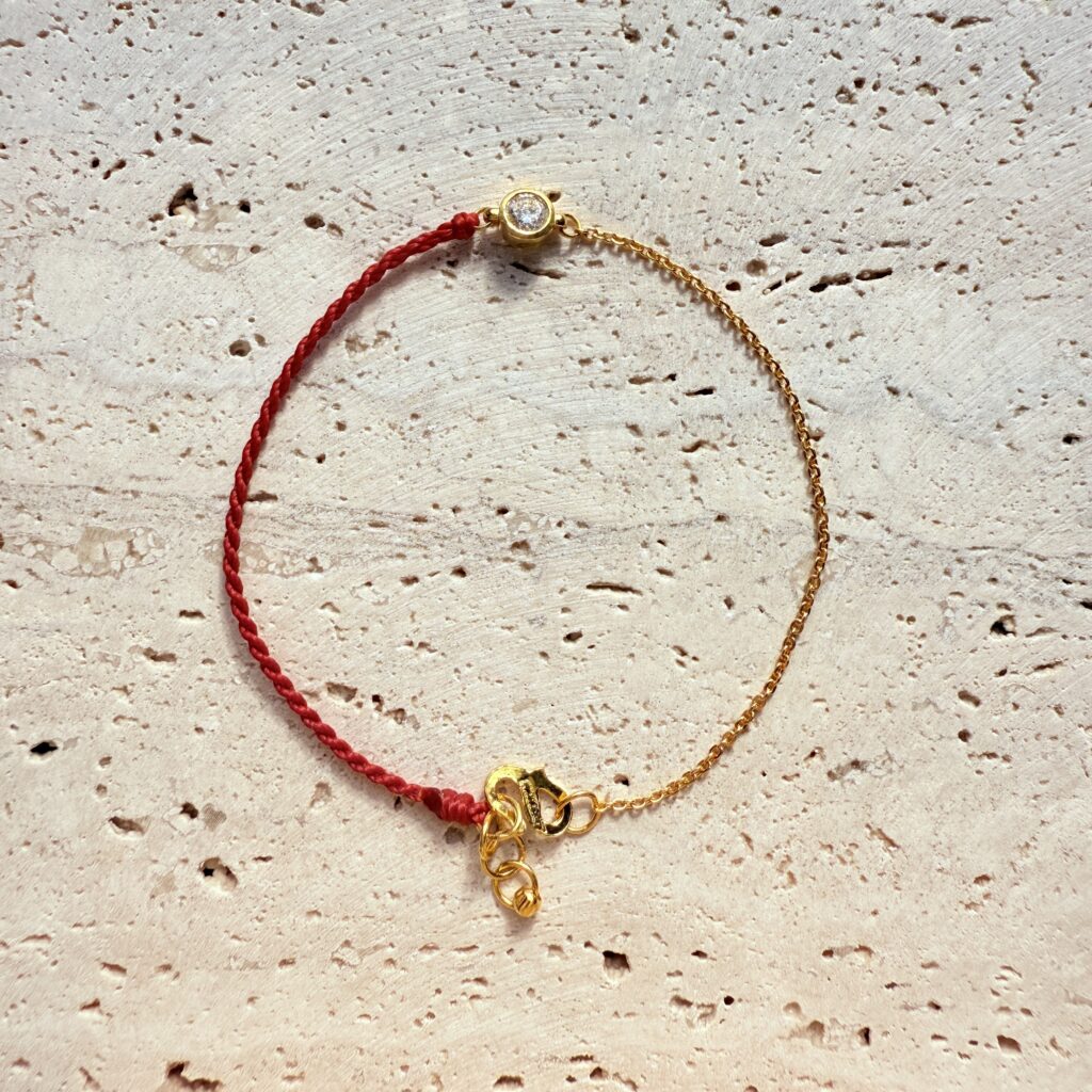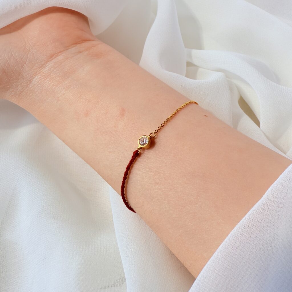 半繩半鍊的輕奢設計,中央圓形鋯石細緻閃耀;紅繩寓意好運守護,可調節尺寸,清爽百搭,單戴疊戴皆出色,是日常與送禮的心動選擇。