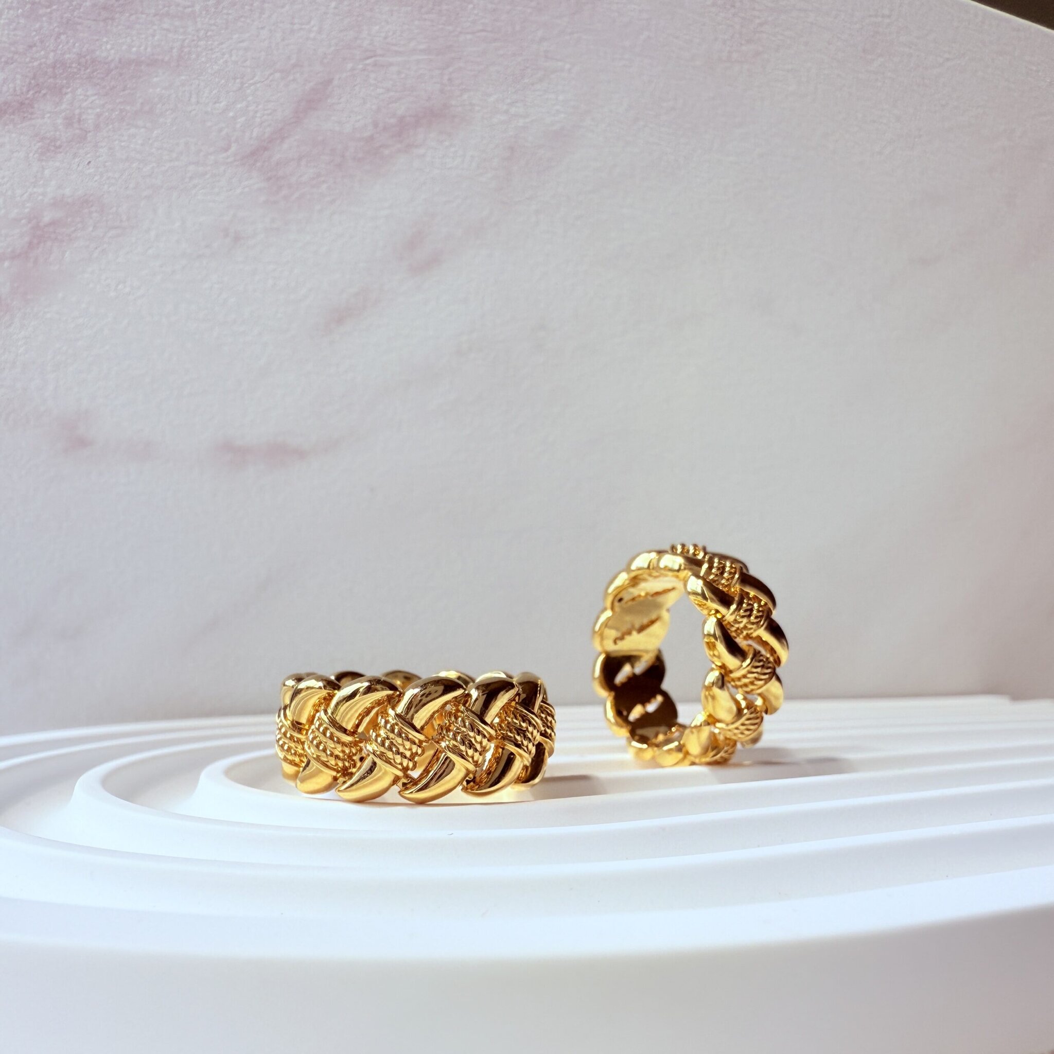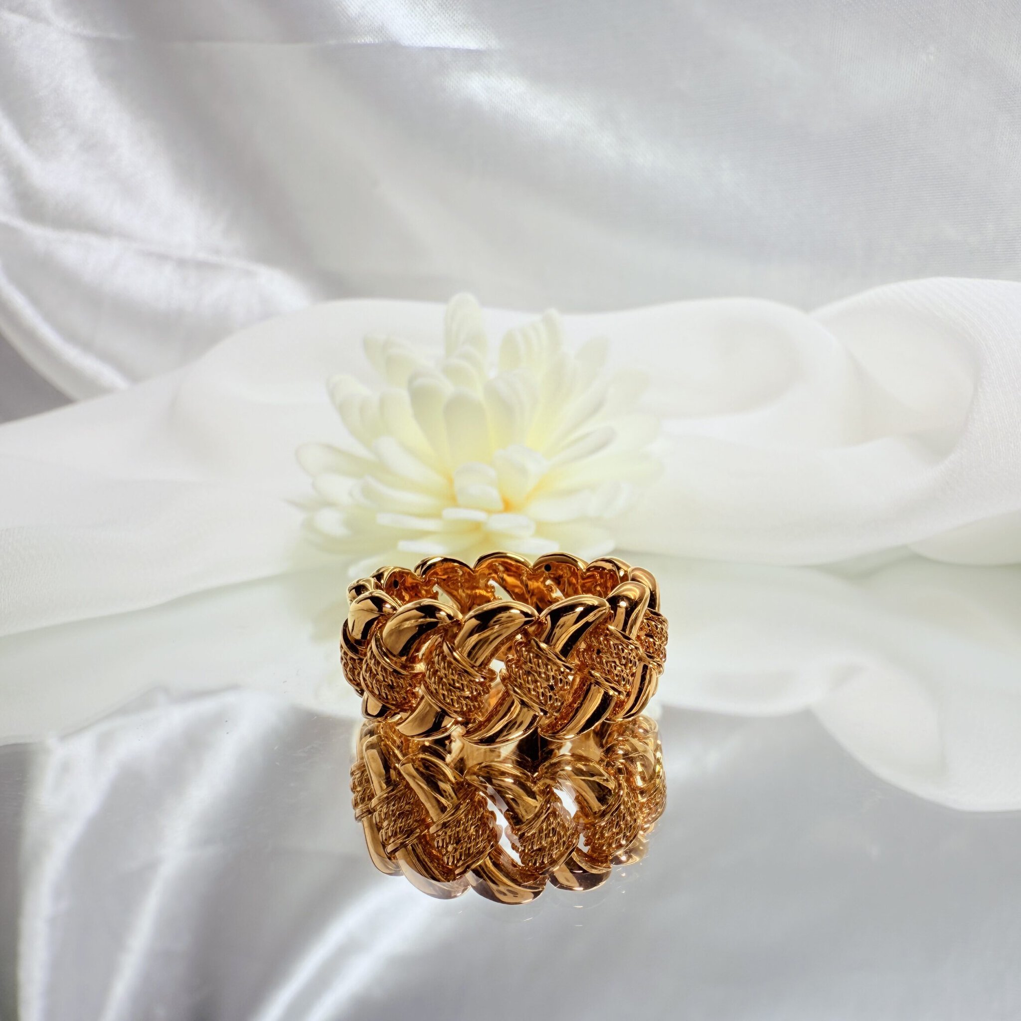 滿圈編織如柔緞花辮,鏡面與細紋交錯映出細亮光澤;立體層次修飾手指線條,份量感剛好,單戴優雅、疊戴更吸睛。