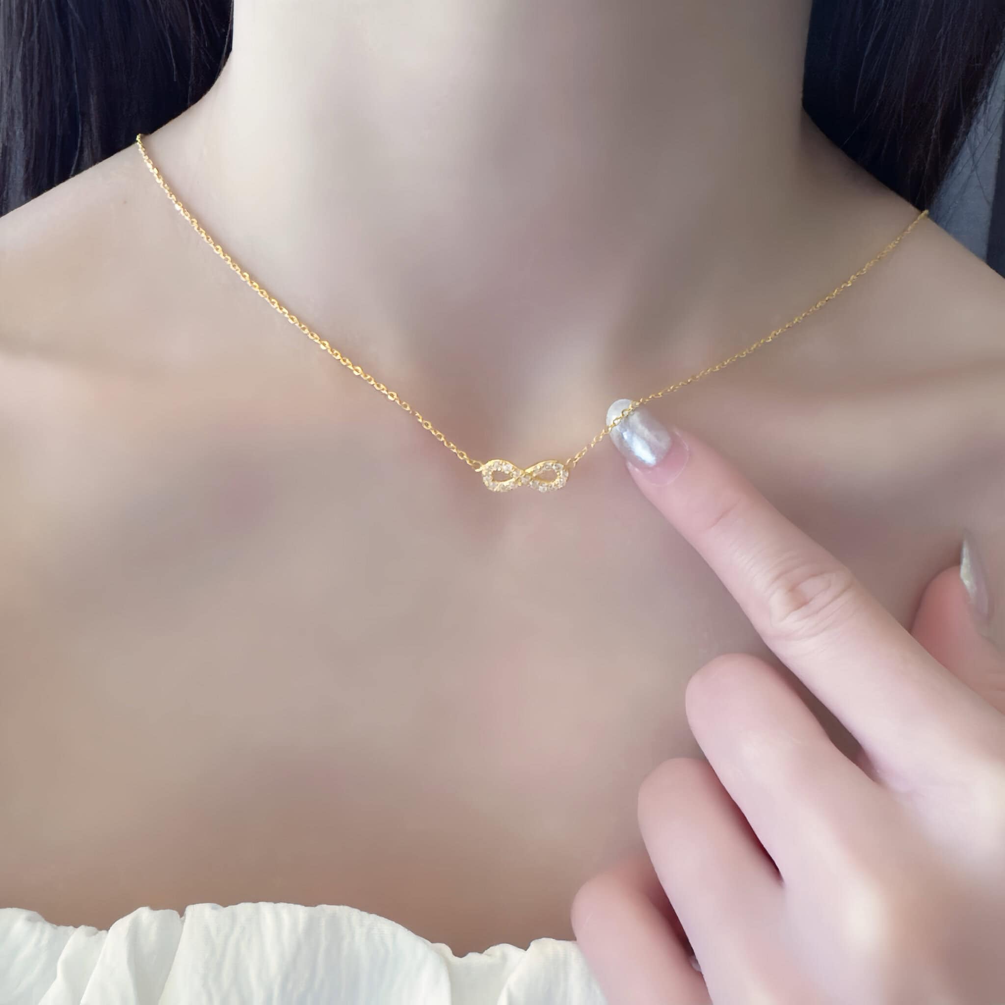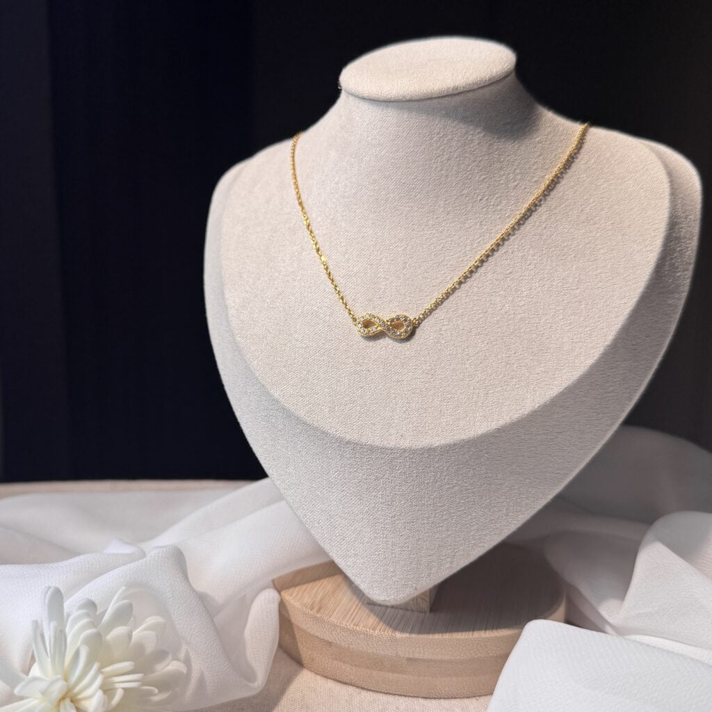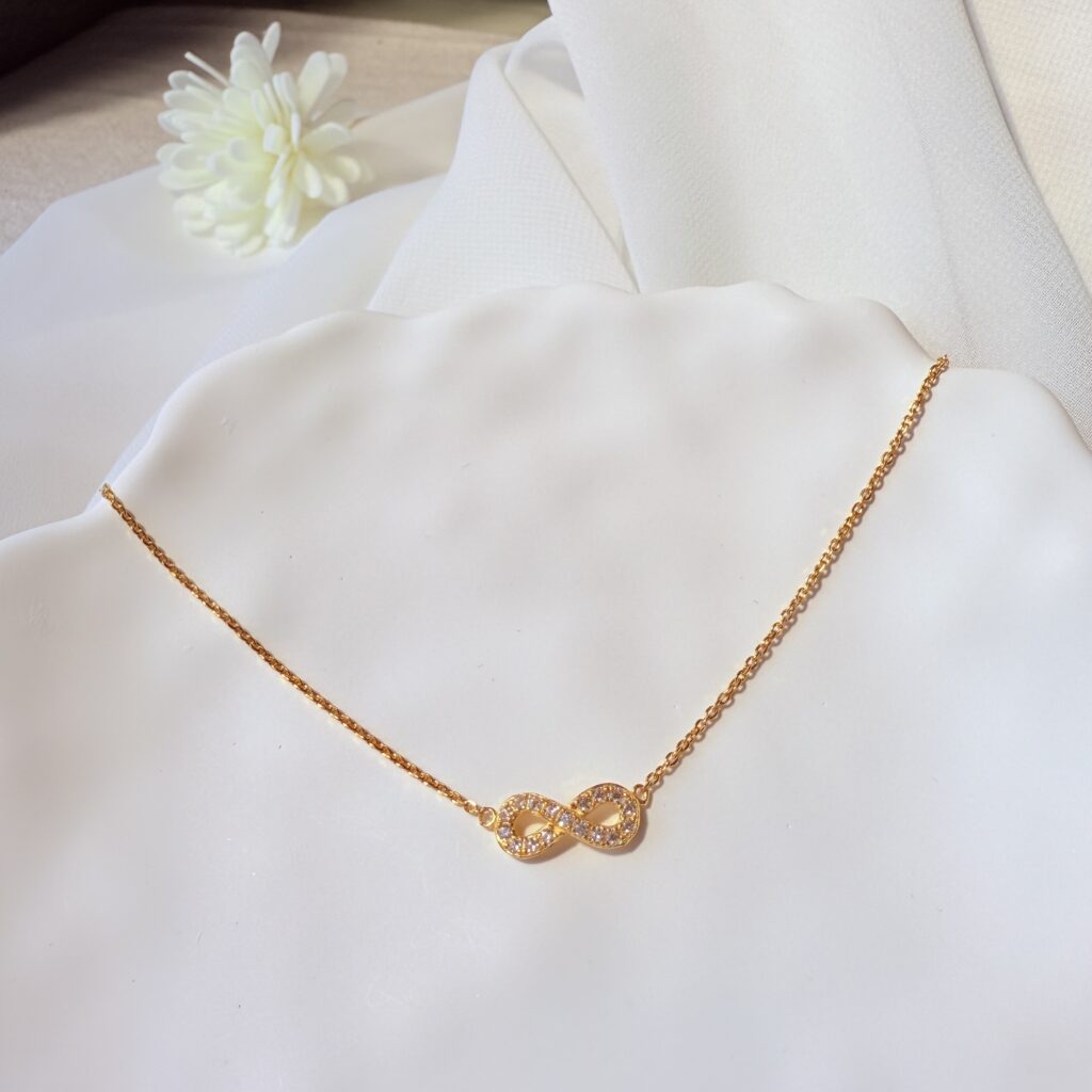 獨家設計 ∞ 無限符號黃金項鍊,象徵愛意與幸福無限綿延。細緻線條搭配金色光澤,簡約卻寓意深刻,適合日常佩戴或作為永恆承諾的禮物。