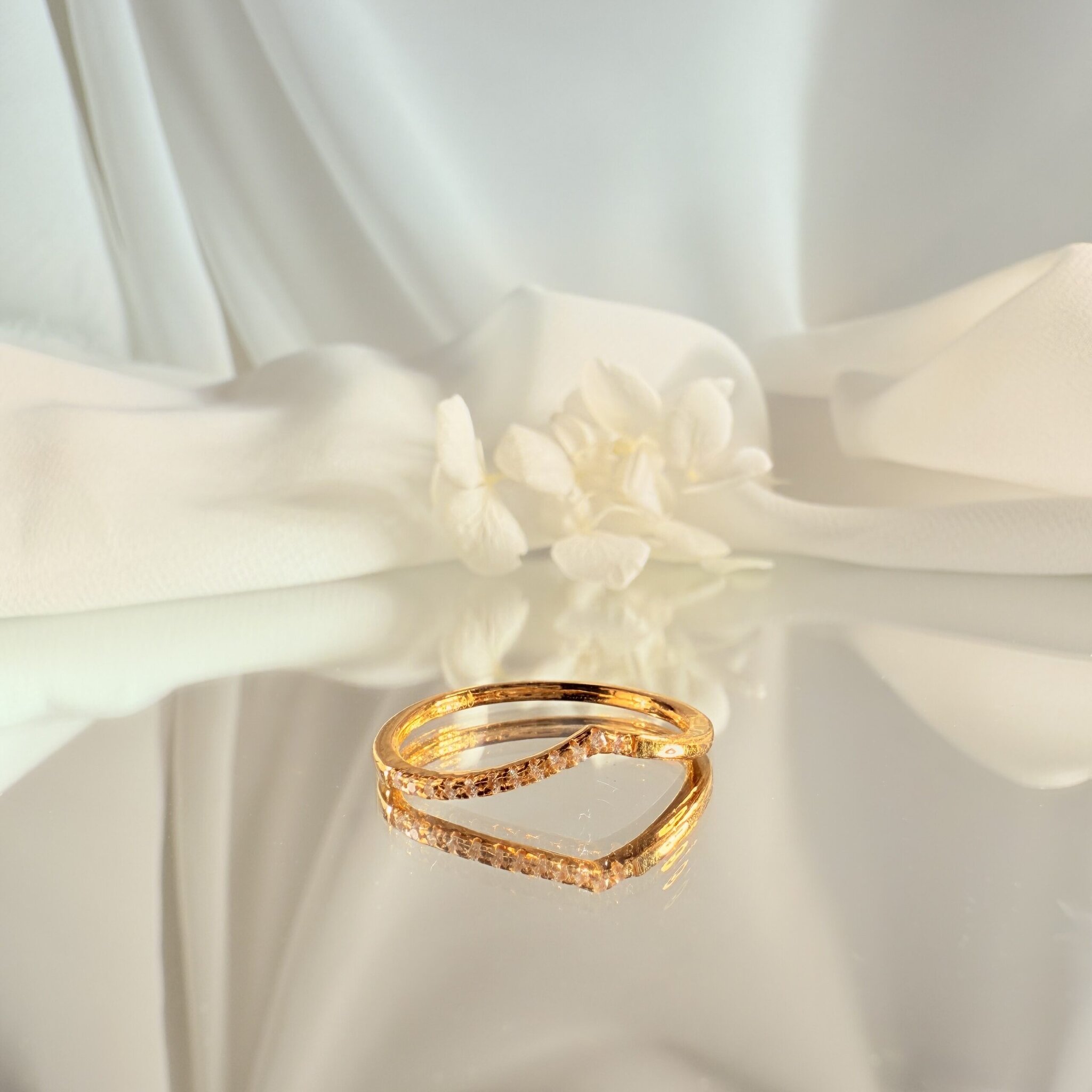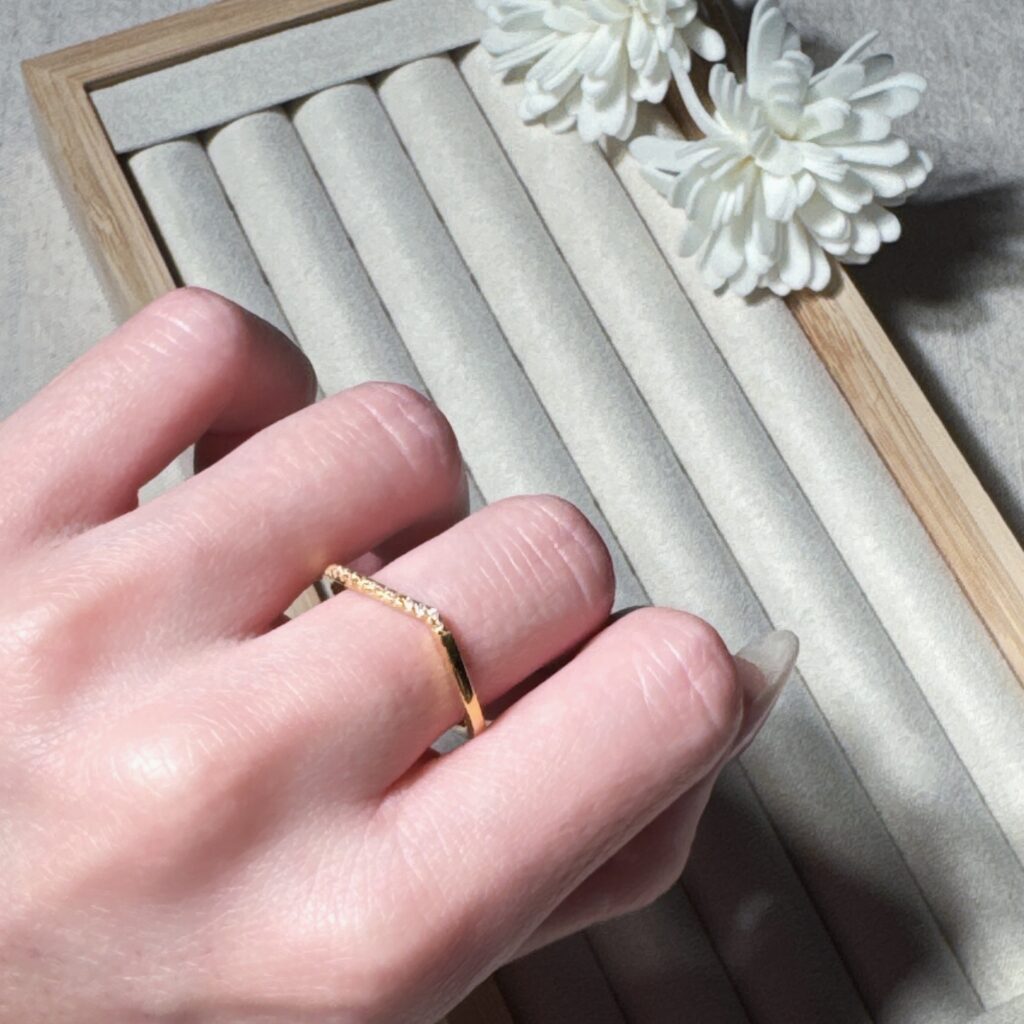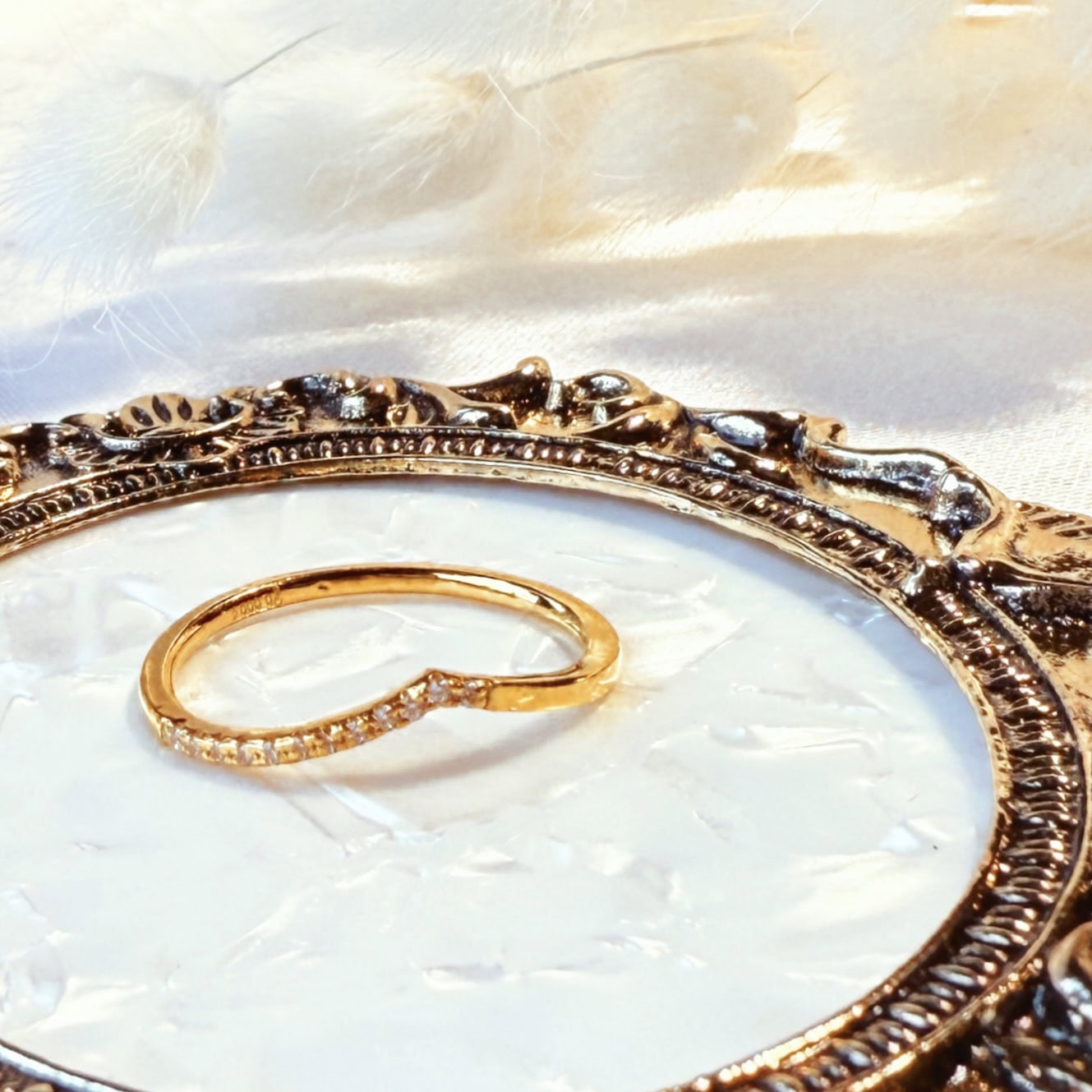 微彎的V字線條,勾勒出指間的溫柔弧度。極簡卻耐看,單戴優雅、疊戴更添光彩,是日常與儀式感兼具的黃金戒指選擇。
