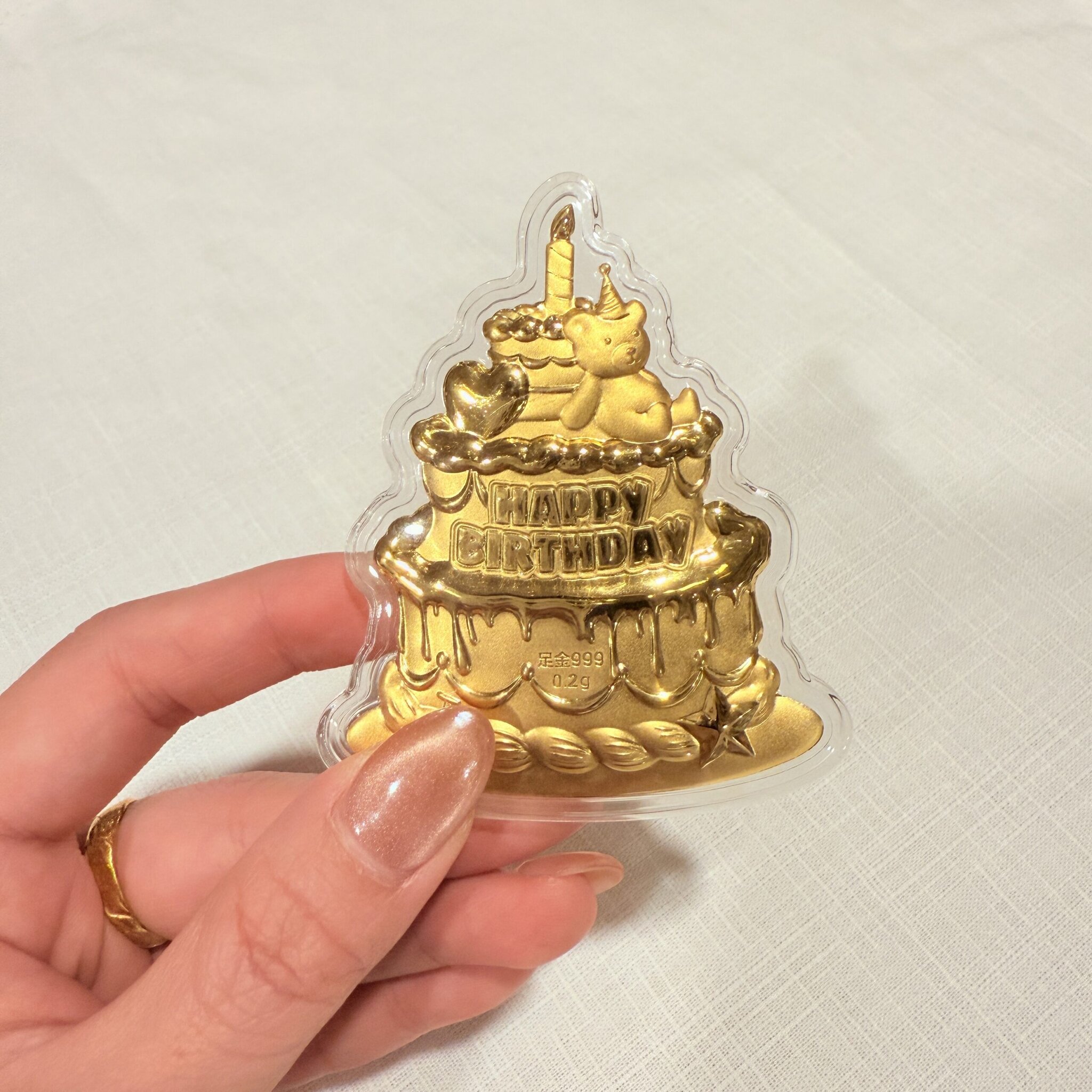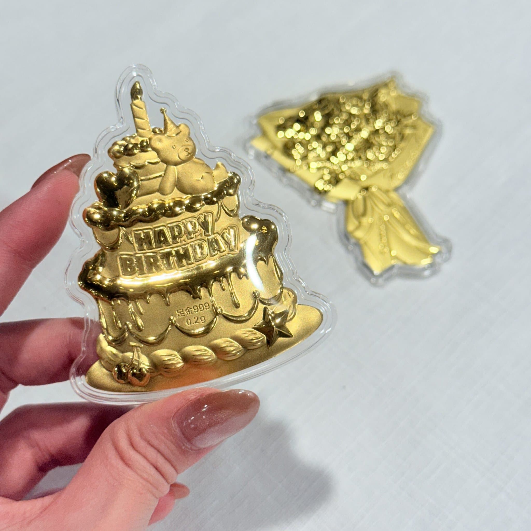 以 Au999 金箔立體工藝打造,蛋糕與花束雙款可選,象徵甜蜜與祝福。附透明保護殼,輕巧好擺放;慶生佈置、收藏或送給家人朋友與伴侶的生日禮物首選,為當天增添典雅光彩。