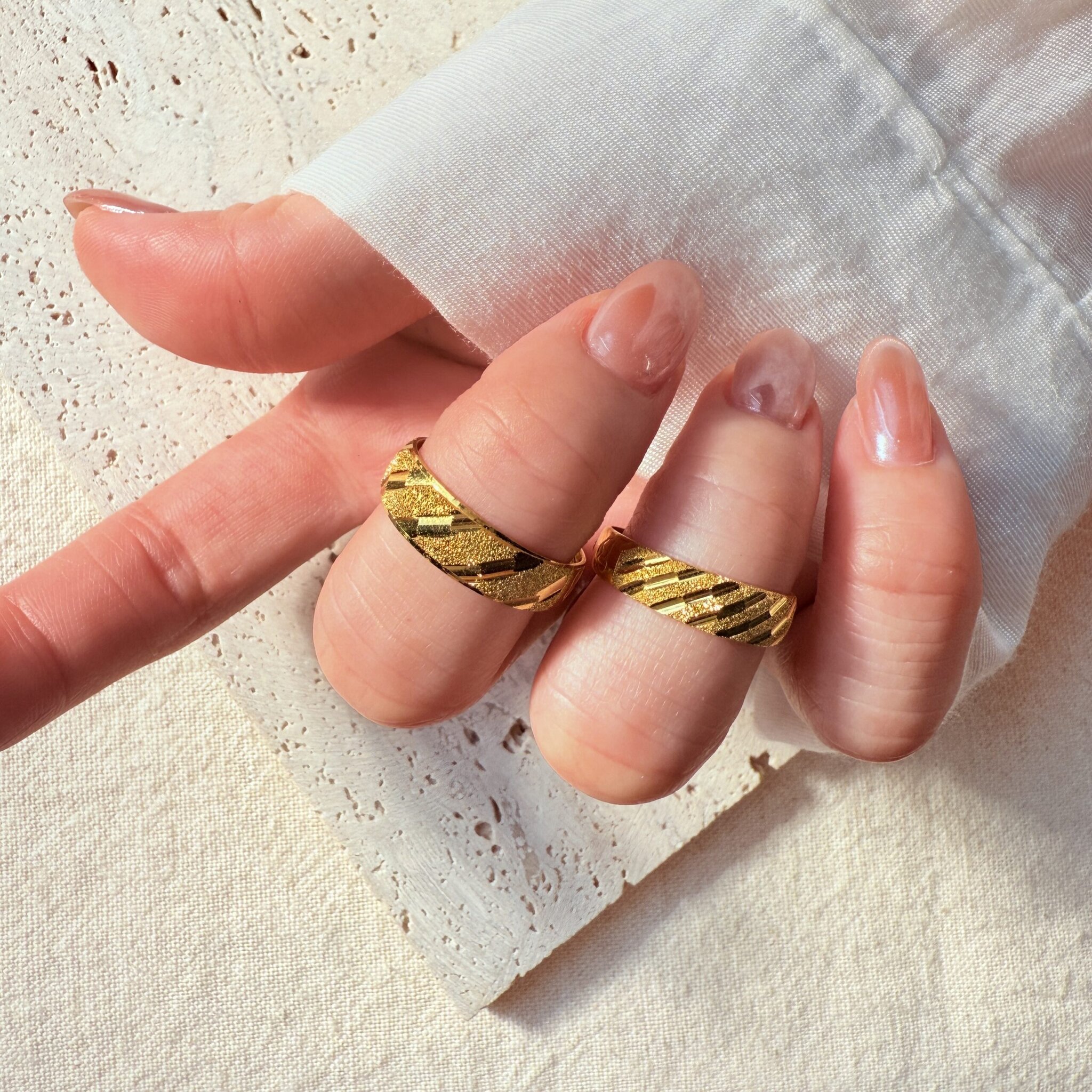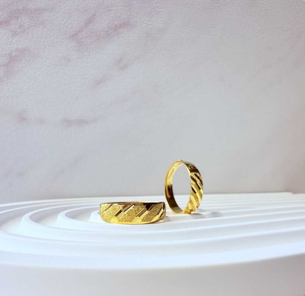 映光鑽砂斜紋戒指,俐落線條展現低調質感,男女皆可佩戴,象徵陪伴與承諾。簡約設計百搭日常,也是情侶戒、紀念日與婚禮的理想選擇。