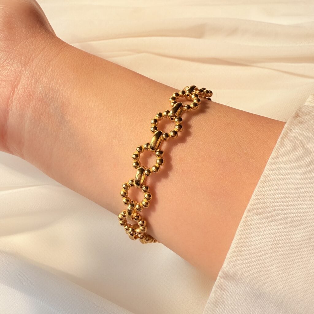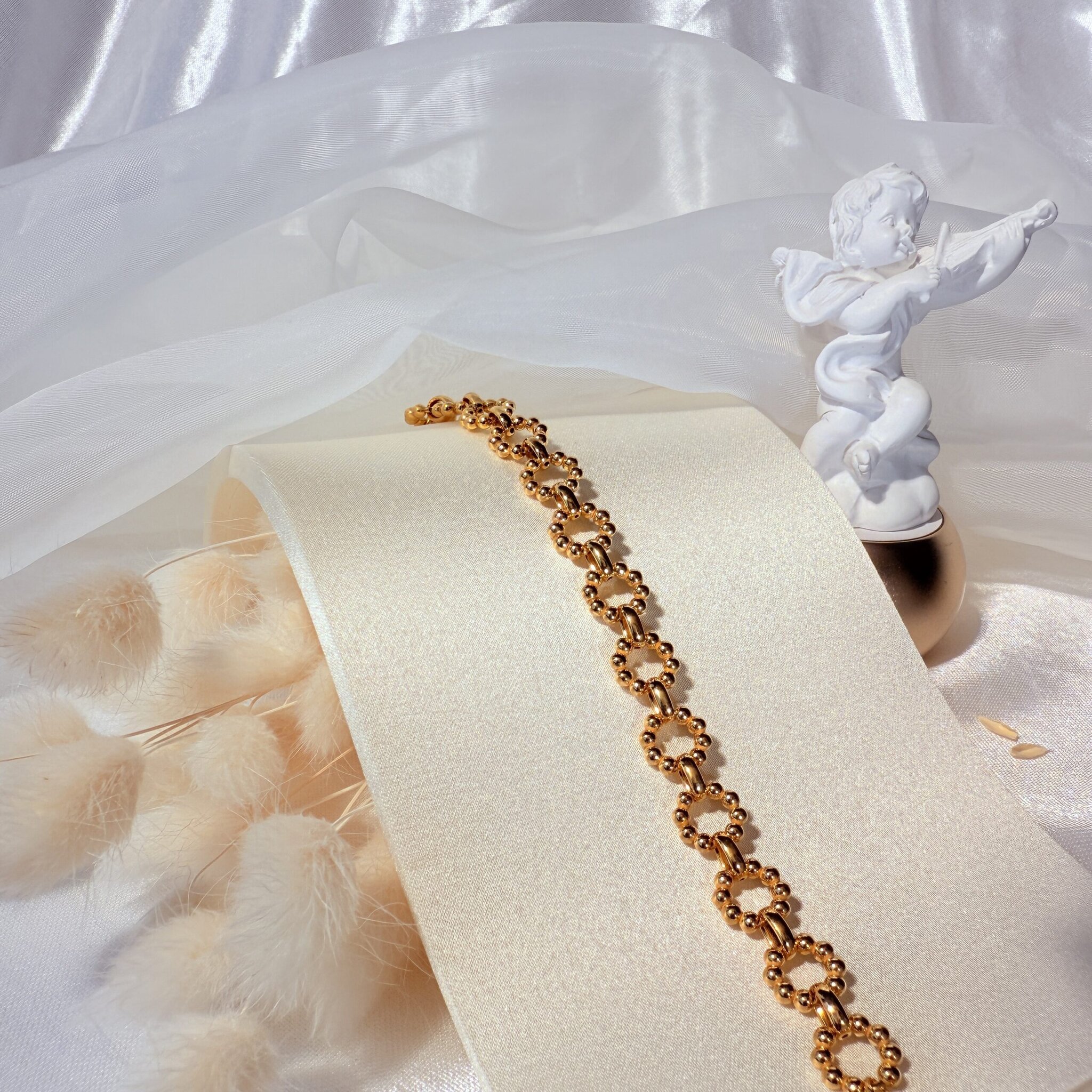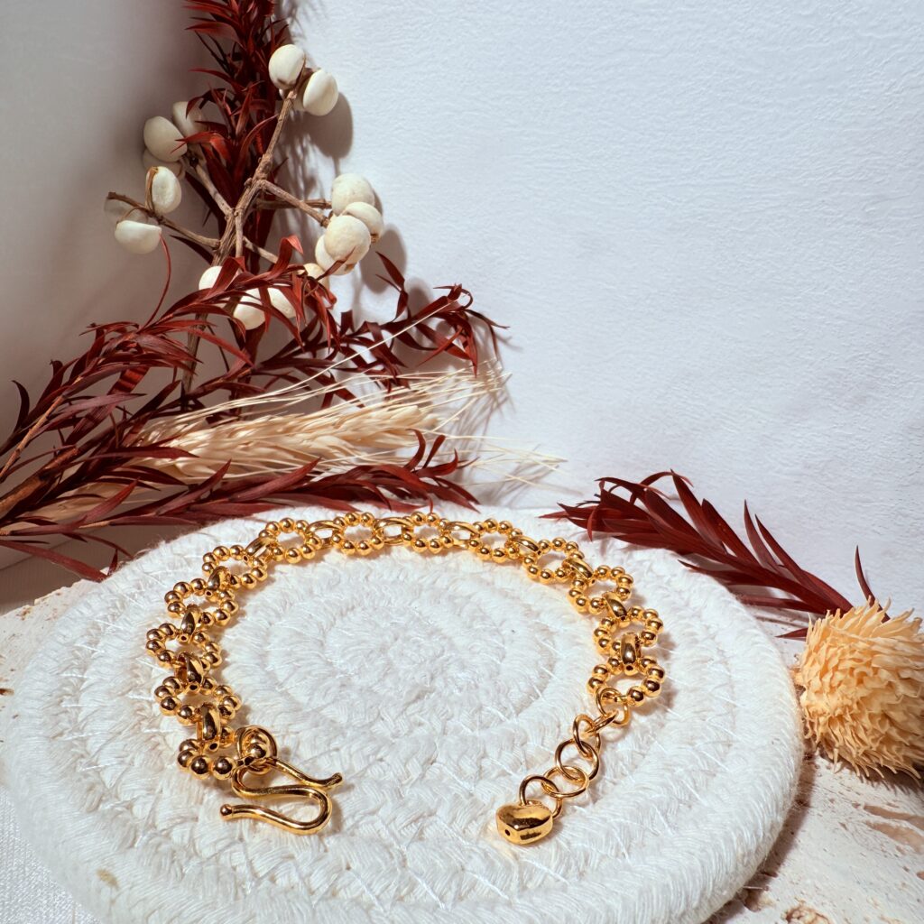 24K黃金精鑄,小金珠圓環與光澤鏈節交錯成列,層次細膩、配戴輕盈百搭;無論日常或儀式穿搭都能襯托手腕優雅光采。