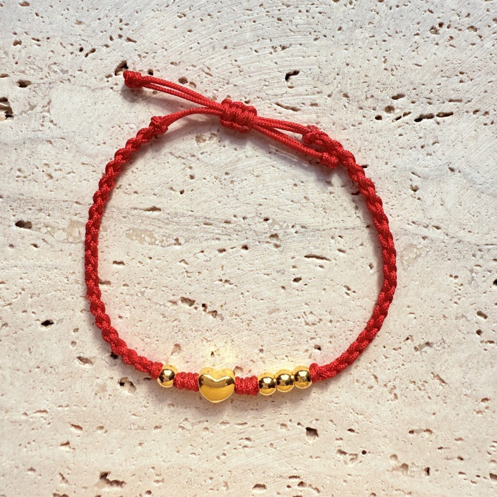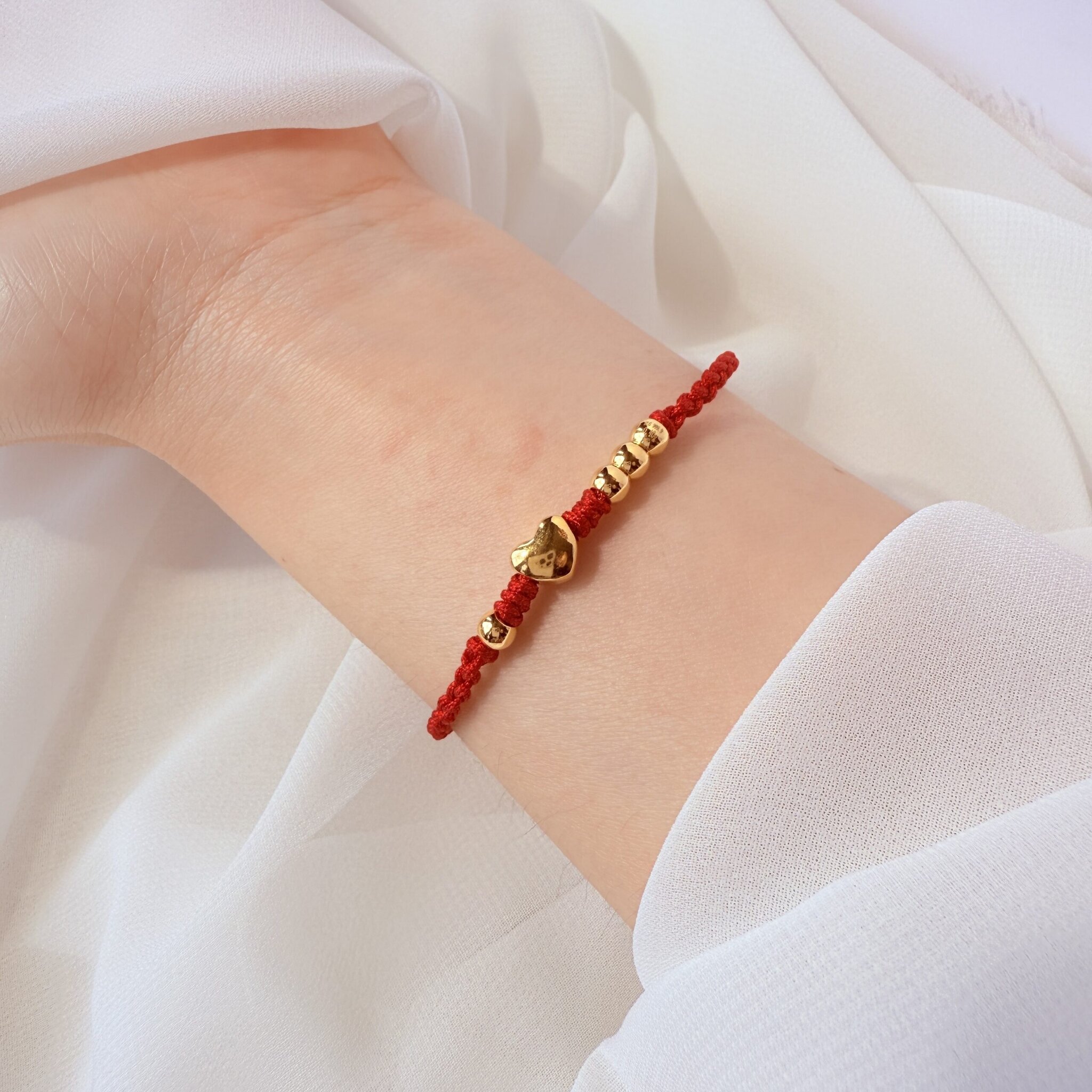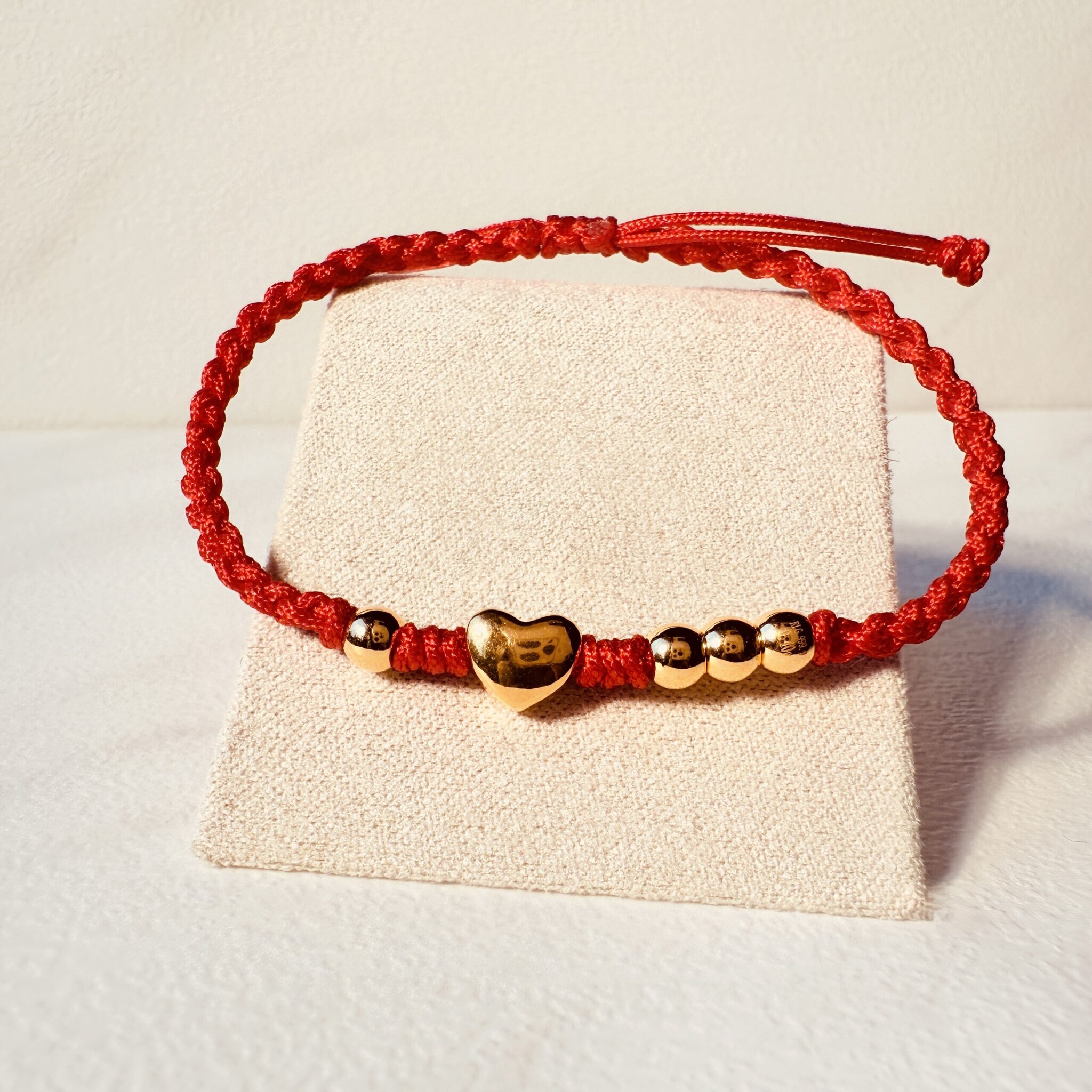 小巧金心點綴亮澄紅繩,三顆圓珠排比更顯精緻可愛;可調節結繩,配戴舒適不勒手。不挑膚色,單戴疊戴皆百搭;象徵心動與守護,約會、日常到送禮都合適,為妳的每一天添一抹溫柔小幸運。
