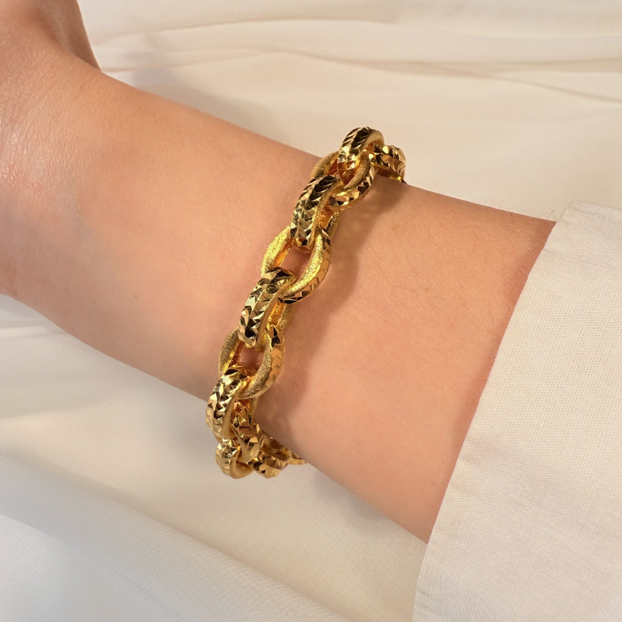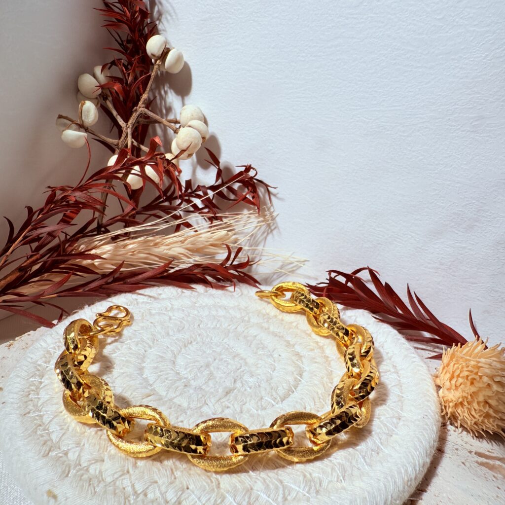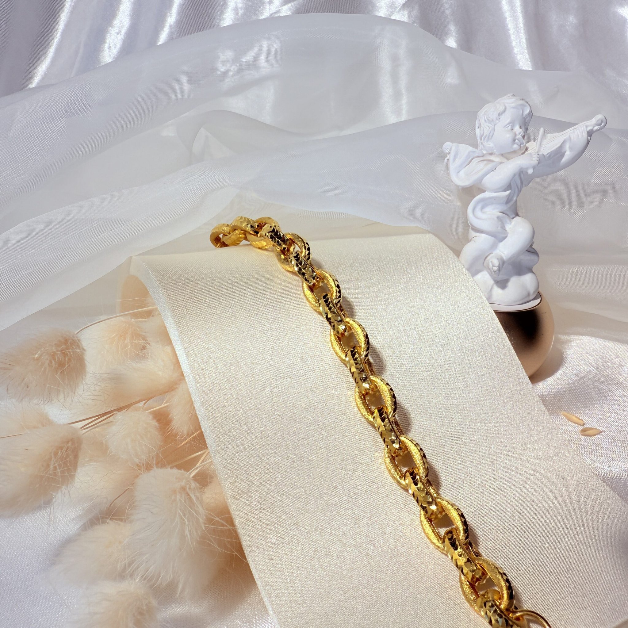 24K黃金精工打造,圓環鏈節以亮面與細緻霧面交錯,立體切割映出柔和光影;份量感俐落卻不失優雅,單戴疊搭皆百搭出眾。