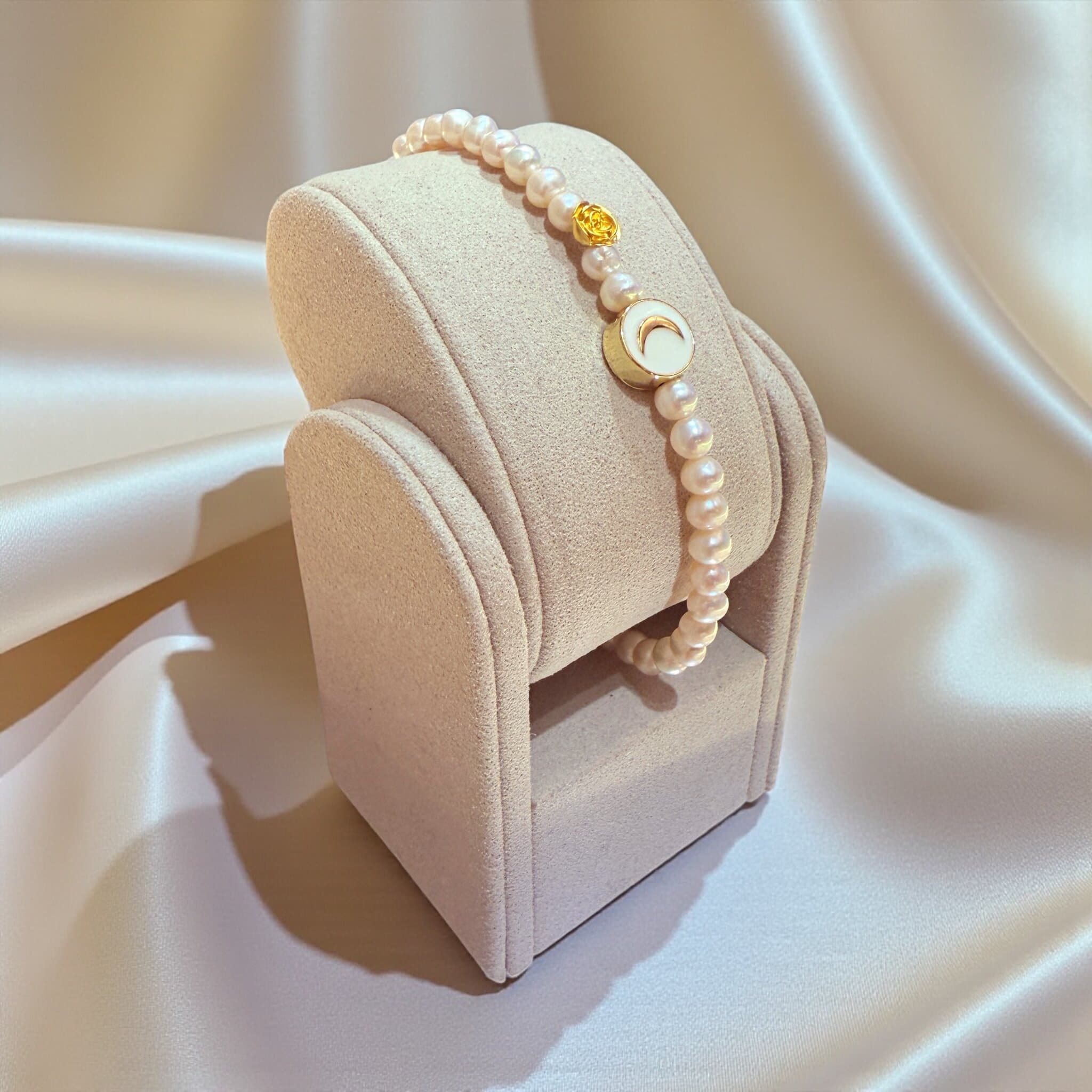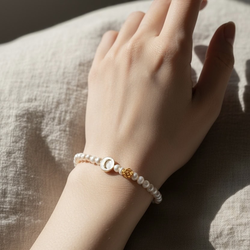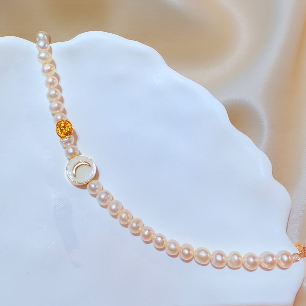 淡水珍珠搭配金色玫瑰珠與月亮母貝圓片,質感柔和細膩;微光在手腕間流動,呈現溫柔而乾淨的浪漫氛圍。