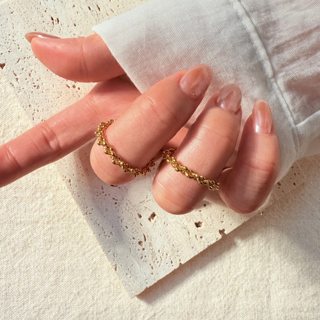 細緻桂花一朵朵簇成花環,亮面與立體紋理交錯,指間自帶溫柔濾鏡;單戴清新、疊戴更有層次,每個抬手瞬間都像落入淡淡桂香的浪漫。