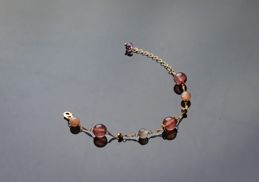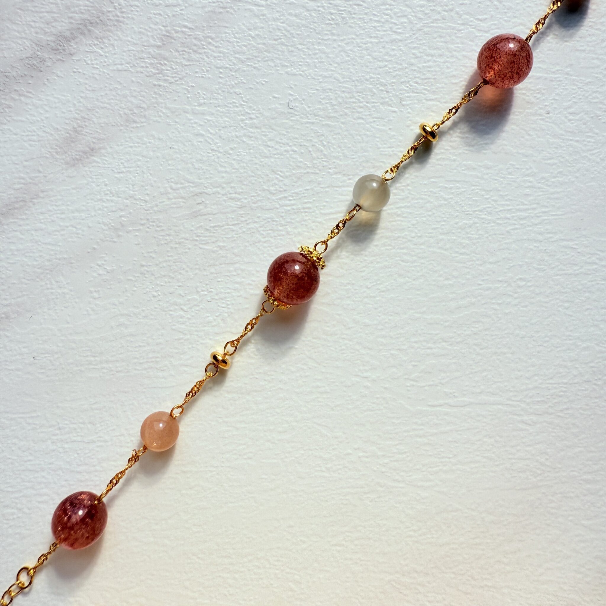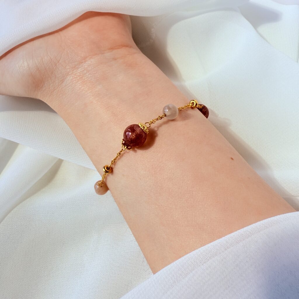 以紅晶石搭配金色鏈條設計,散發優雅浪漫氣息,適合日常配戴與約會穿搭,展現獨特溫柔與質感魅力。