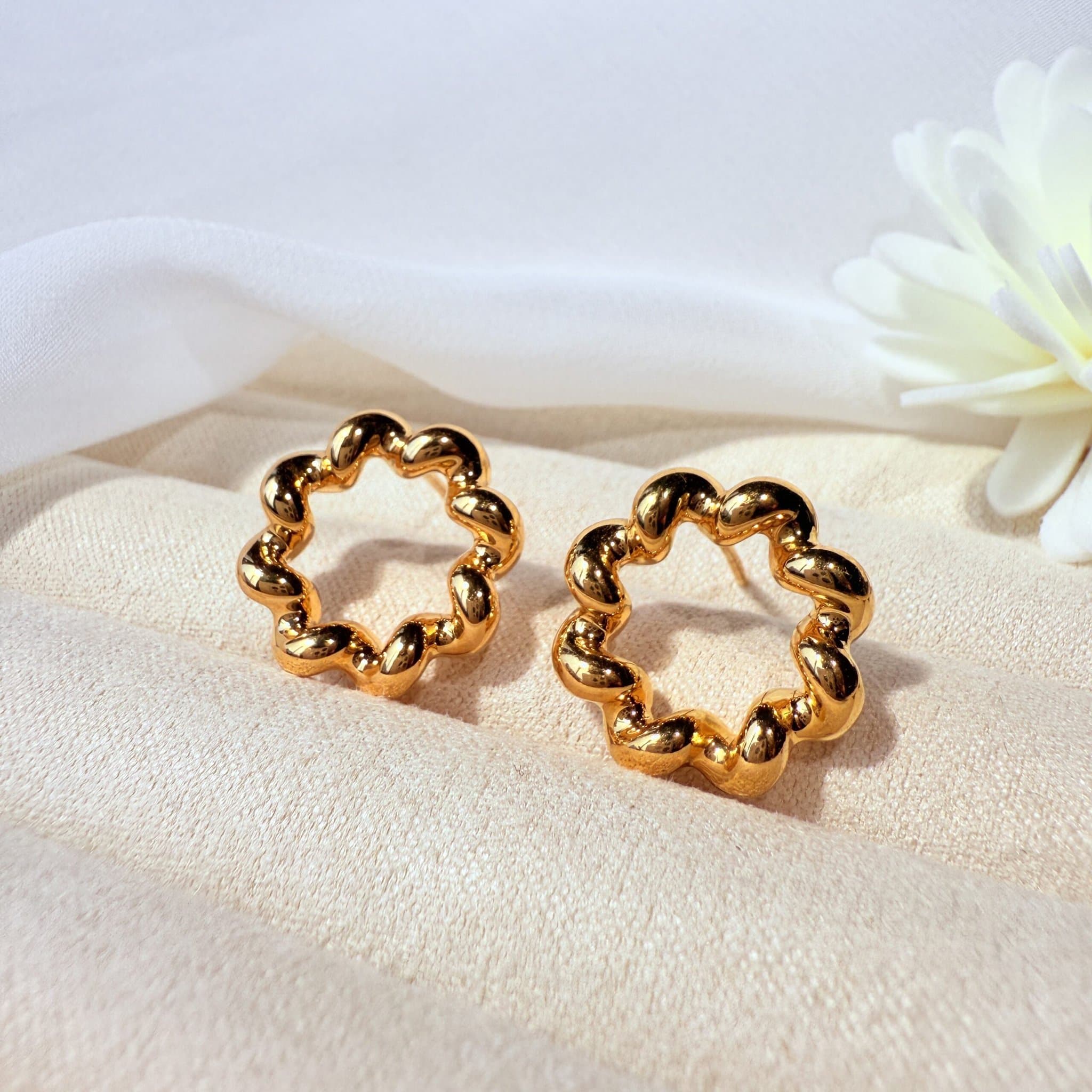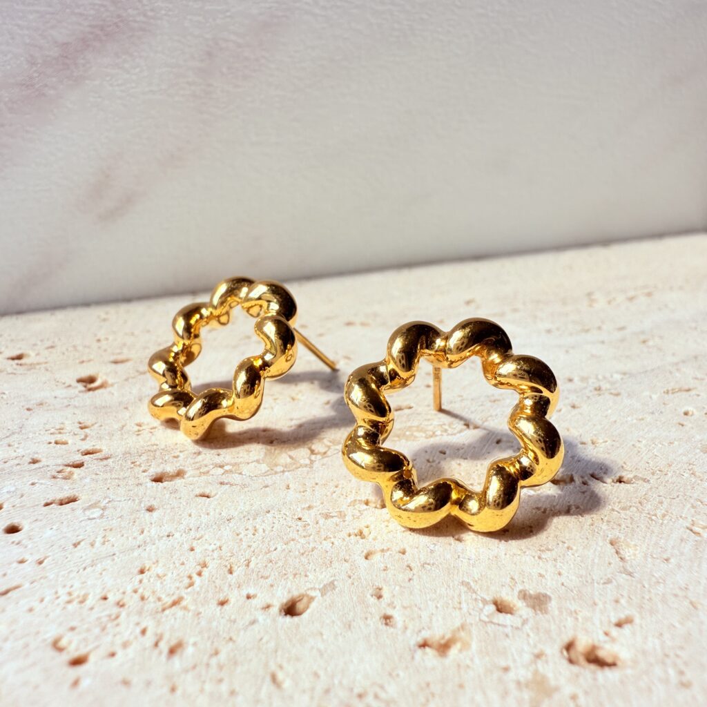 純金打造的立體圓花設計,圓潤可愛又帶有氣質光澤,適合日常穿搭或特別場合,讓妳舉手投足都綻放自信魅力。