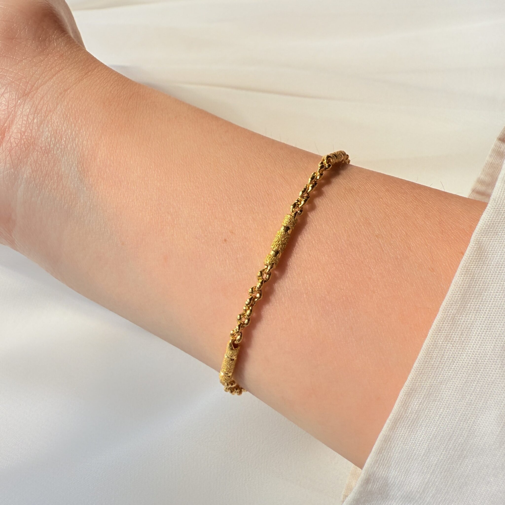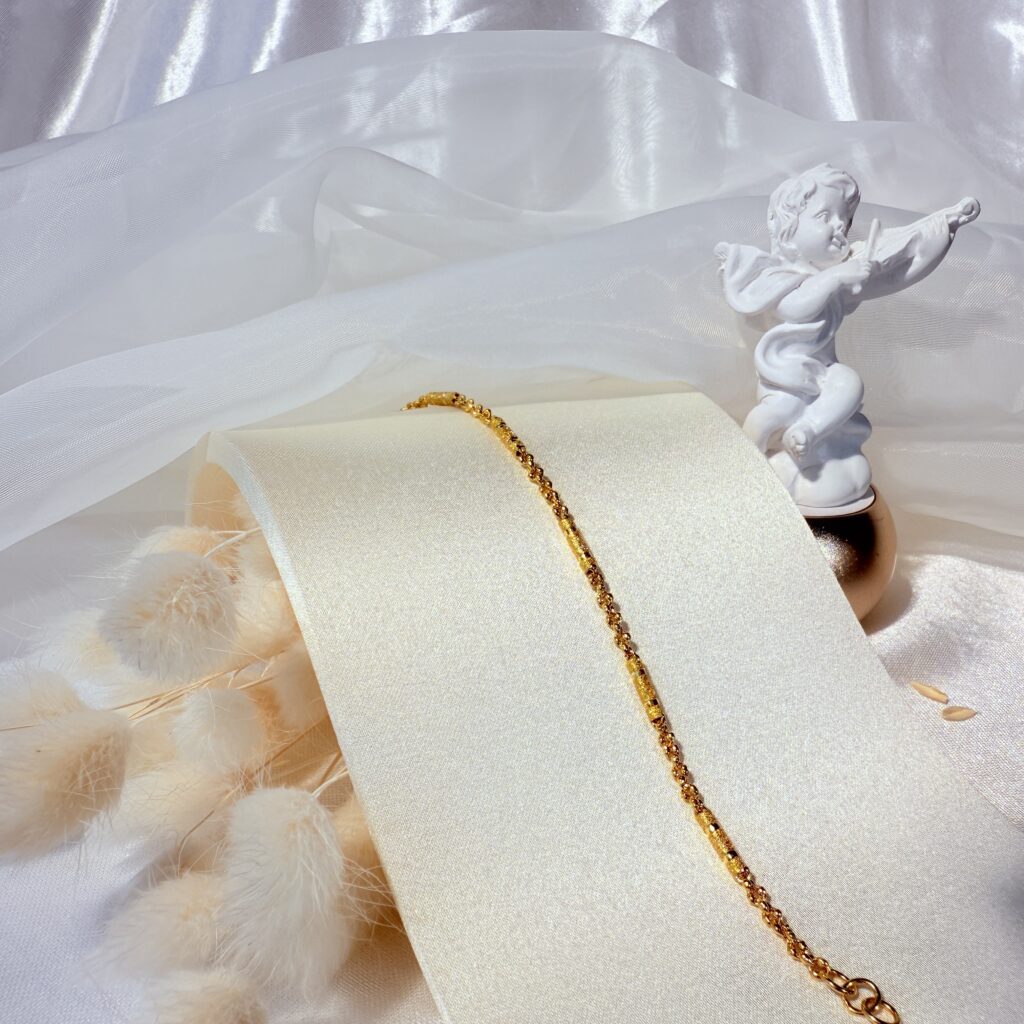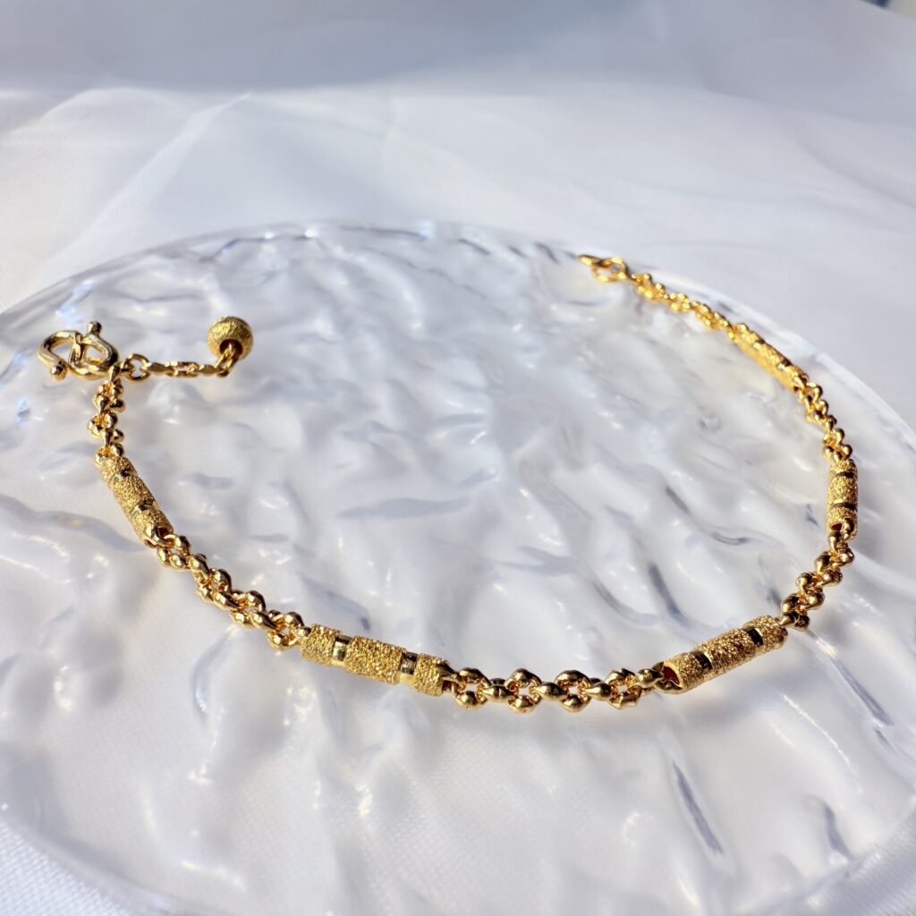 24K黃金結合砂面圓柱鏈節,質感細緻、低調卻閃耀;輕盈好配戴,單戴或疊戴都能呈現柔和微光,日常與小儀式造型皆百搭。