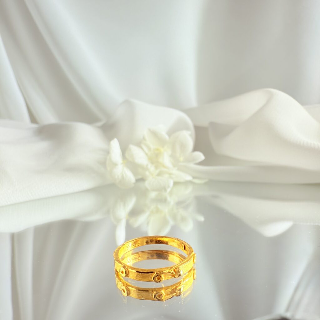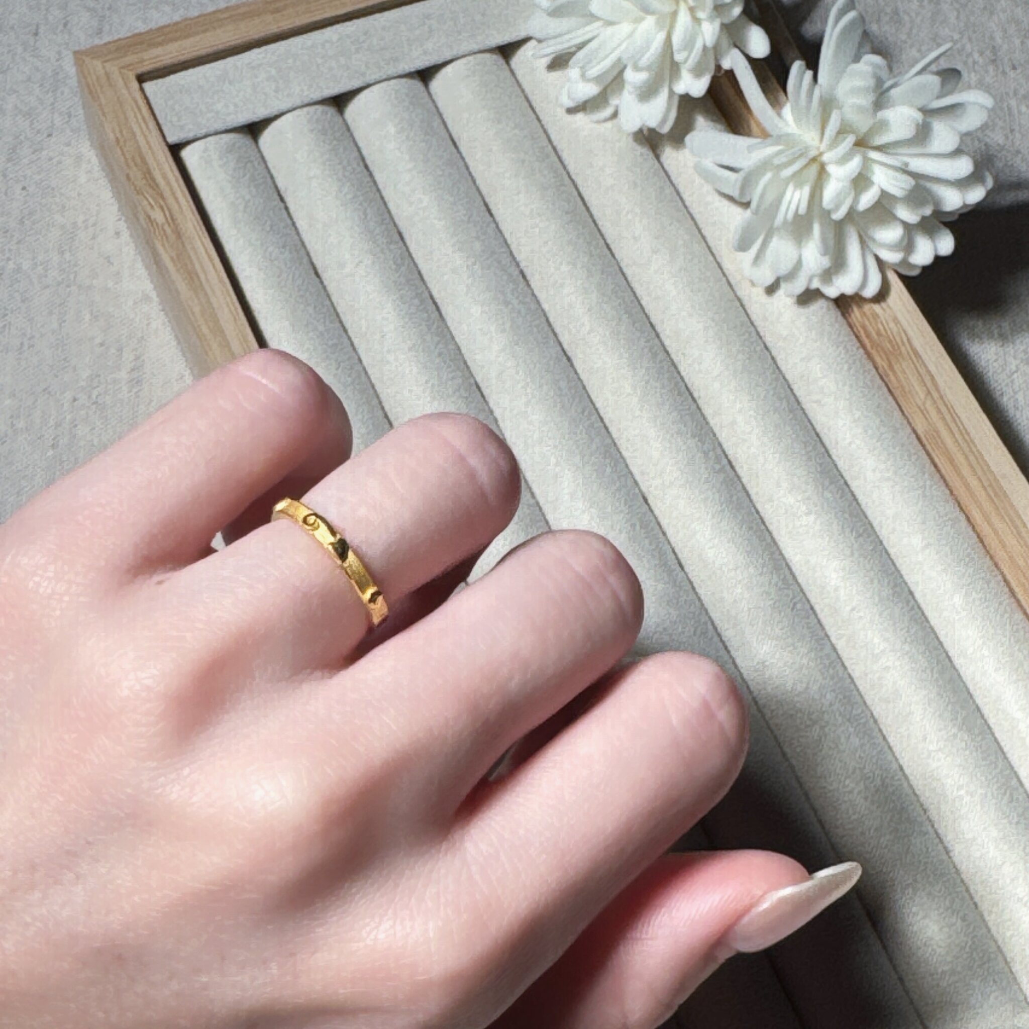 極簡設計中藏著細膩巧思,這款「浮雕點紋金戒」以圓點紋路點綴戒環,簡潔俐落卻不失質感,日常穿搭或疊戴都能輕鬆駕馭。