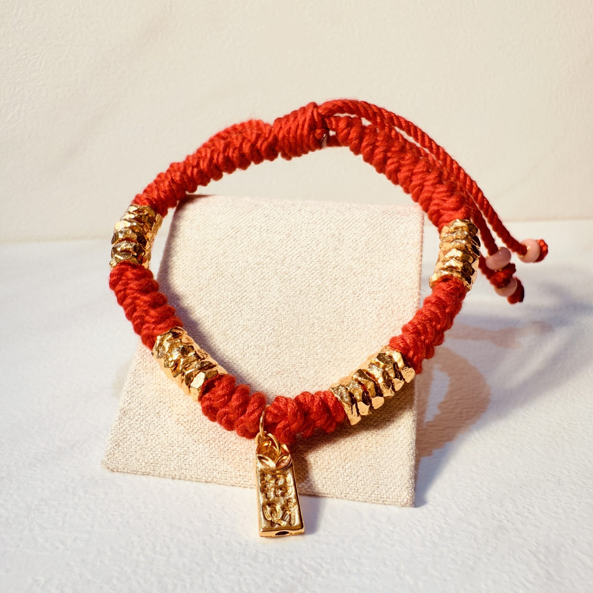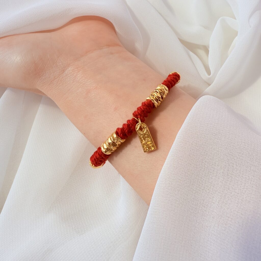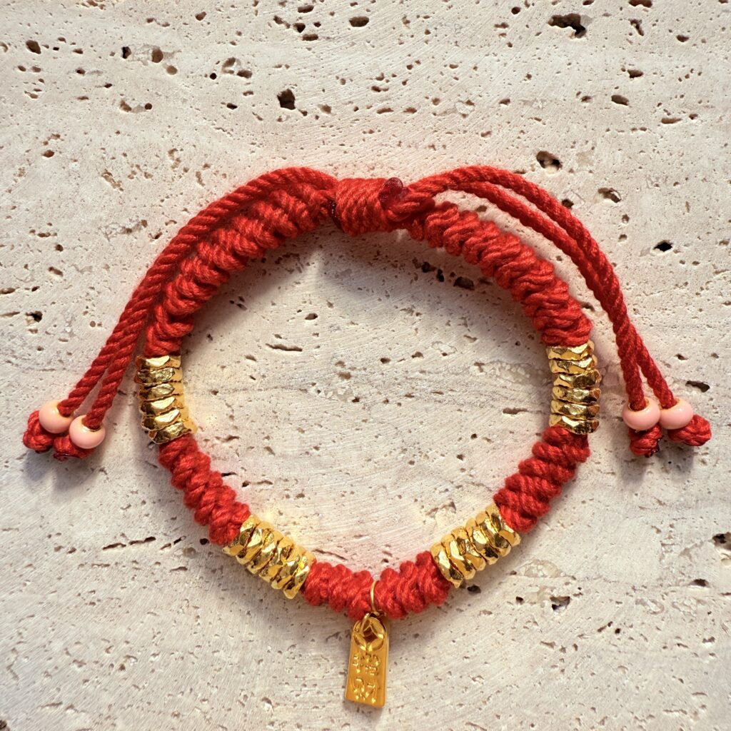 嬰幼兒專用紅繩手鍊,疊金亮片搭配小金牌點綴,寓意滿載福氣與守護。柔軟親膚、輕量不勒手,抽拉式可調節尺寸,滿月、收涎與周歲送禮都體面又實用。
