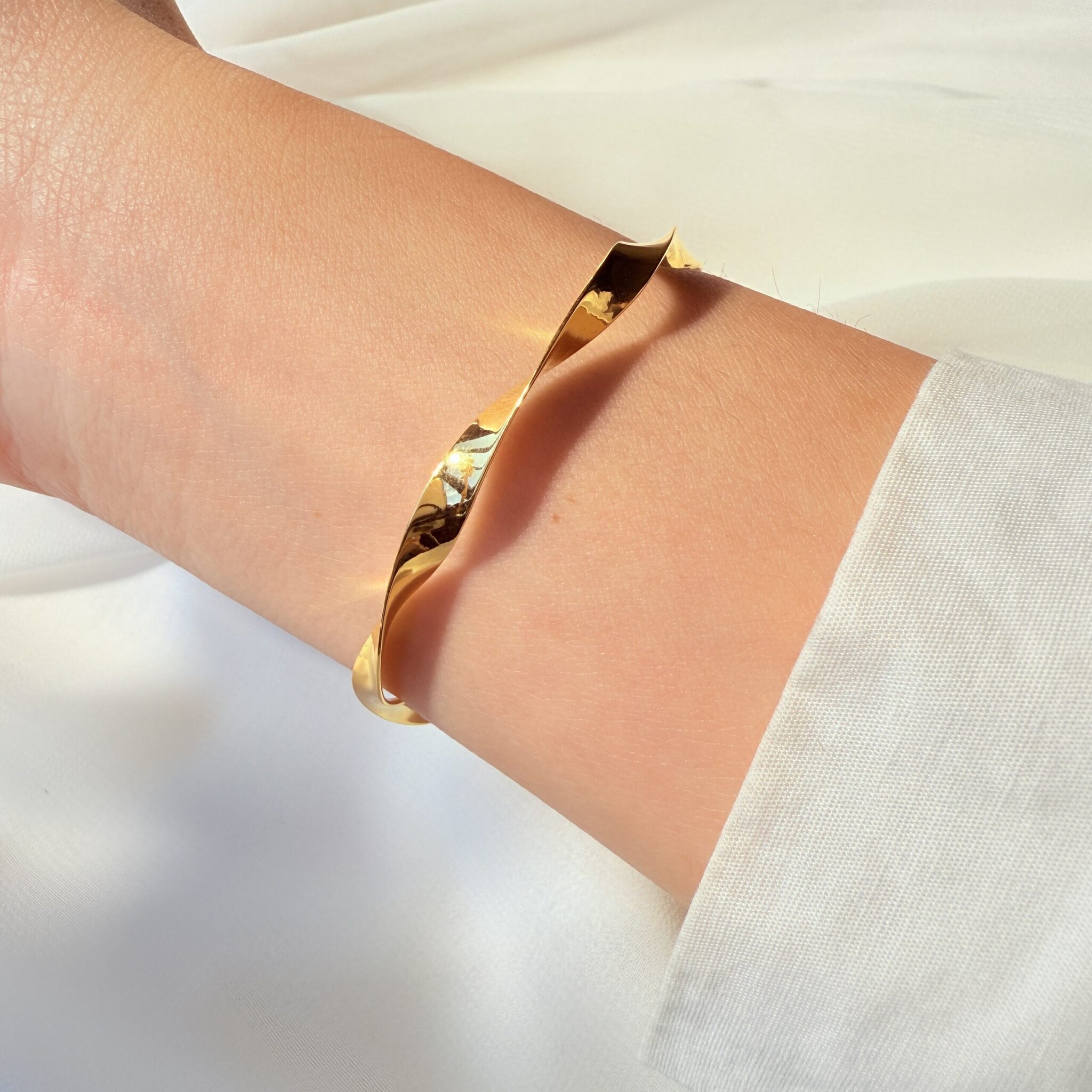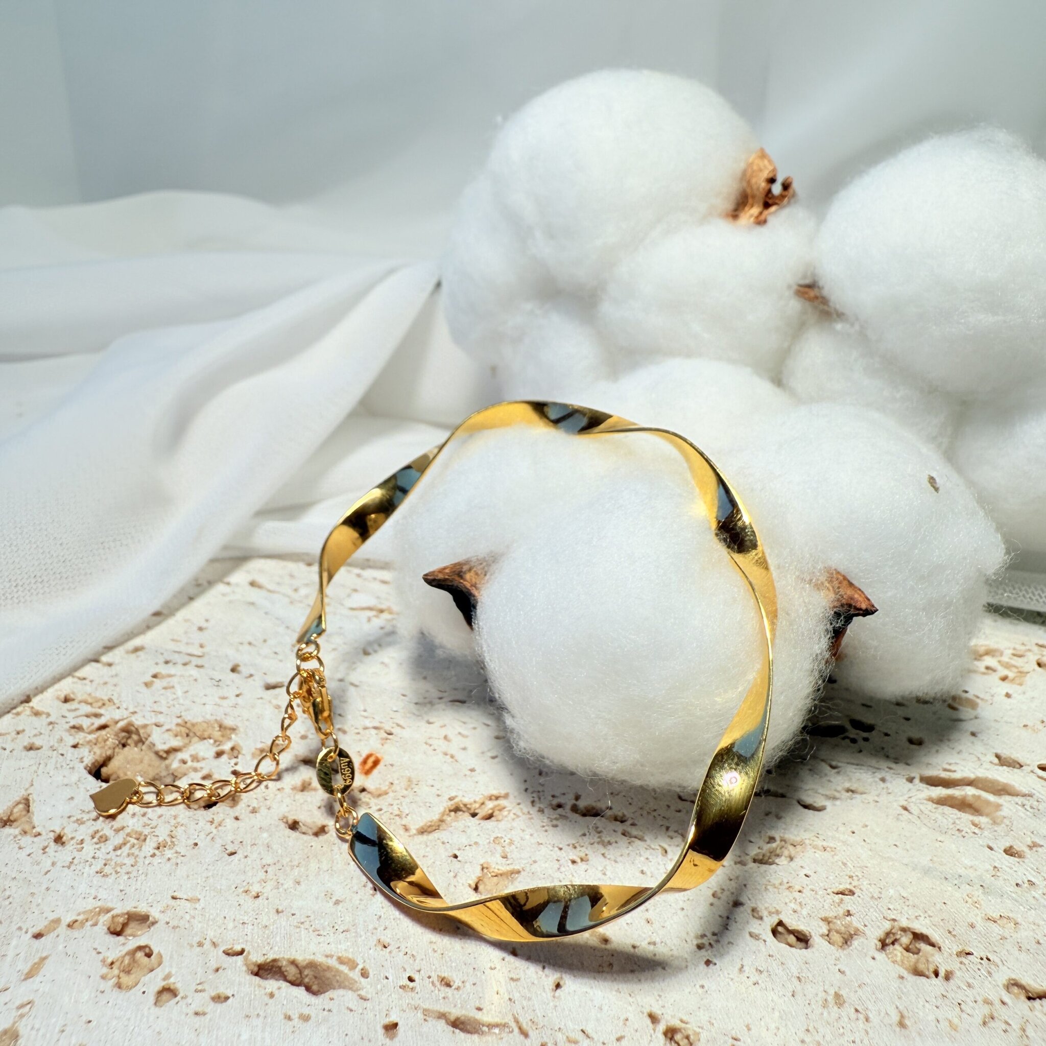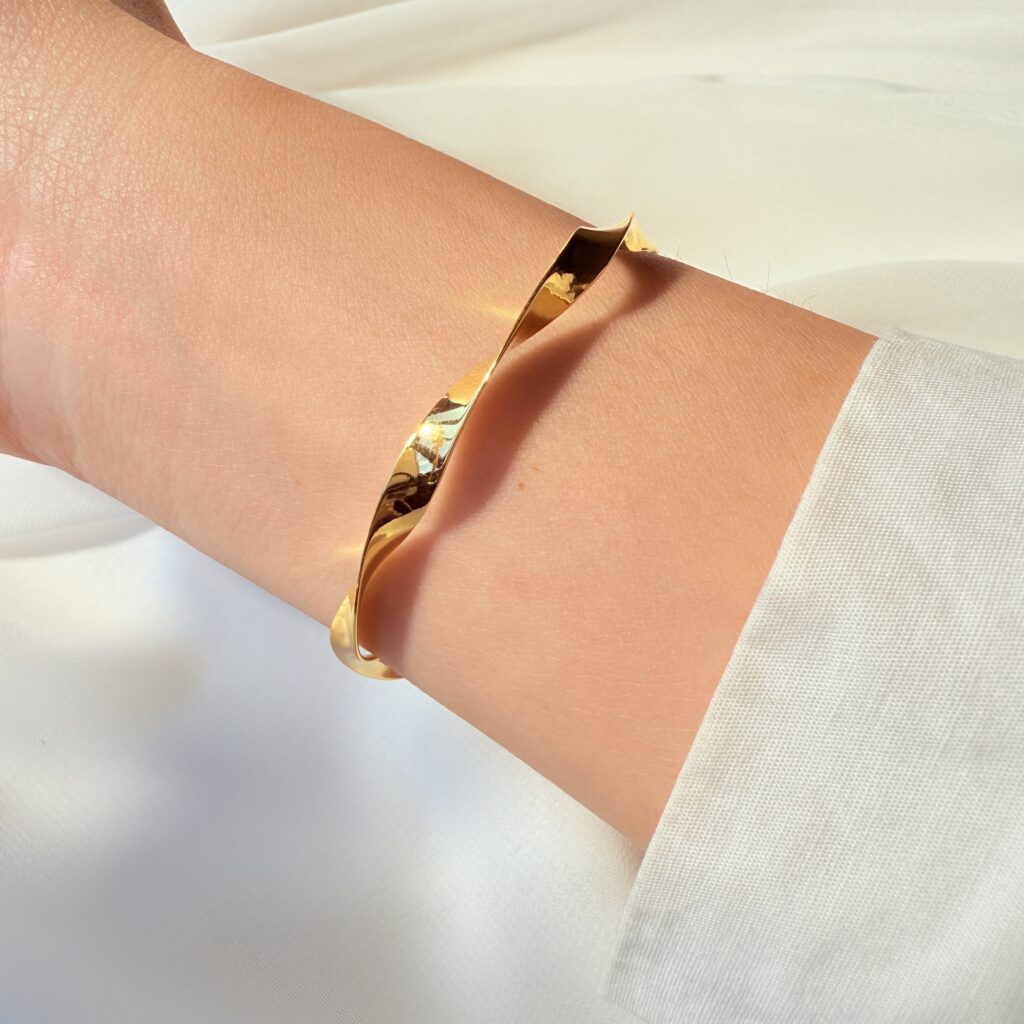 純金打造的扭轉設計手鍊,光澤隨手腕角度流轉閃耀,宛如光影漣漪般靈動優雅。極簡造型卻蘊含獨特韻味,日常穿搭、典雅宴會皆能展現不凡氣質,是送禮與自戴的經典選擇。