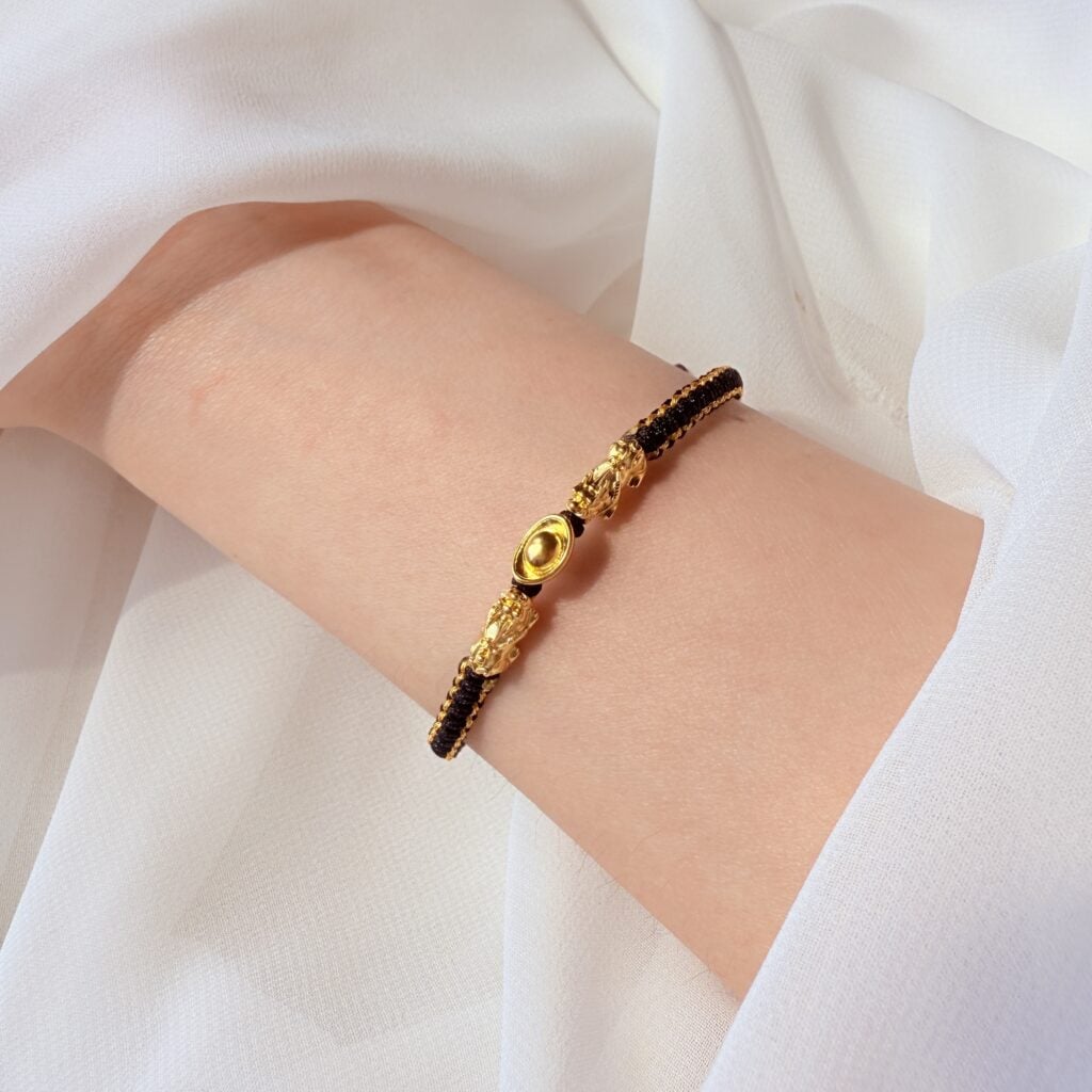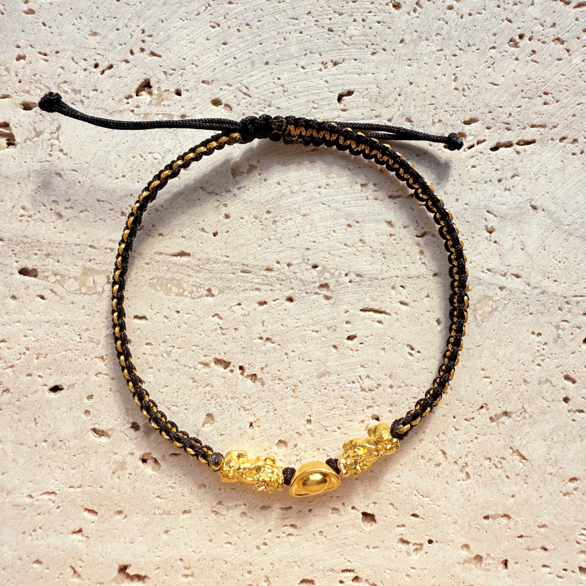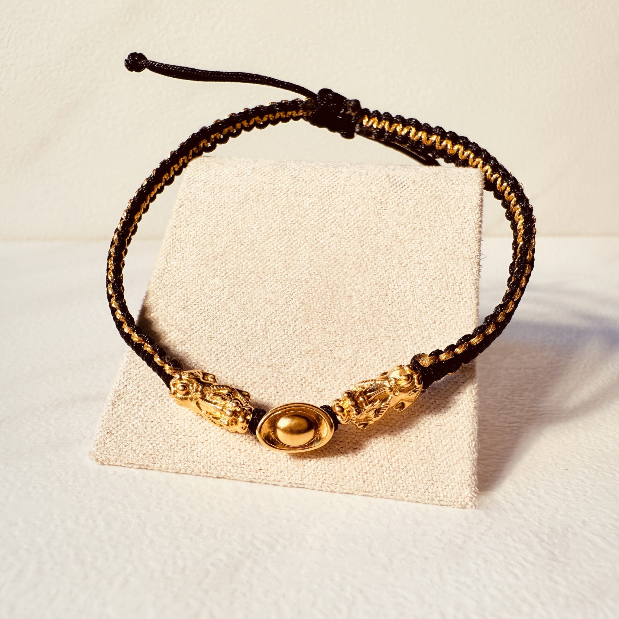 黑金編繩勾勒纖腕,雙貔貅環抱元寶,寓意聚財守護;手工編織、尺寸可調,日常配戴或年節送禮都體面又有儀式感。