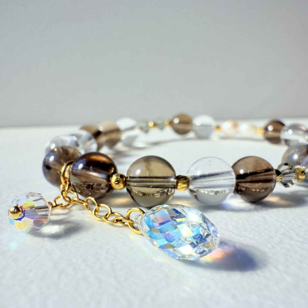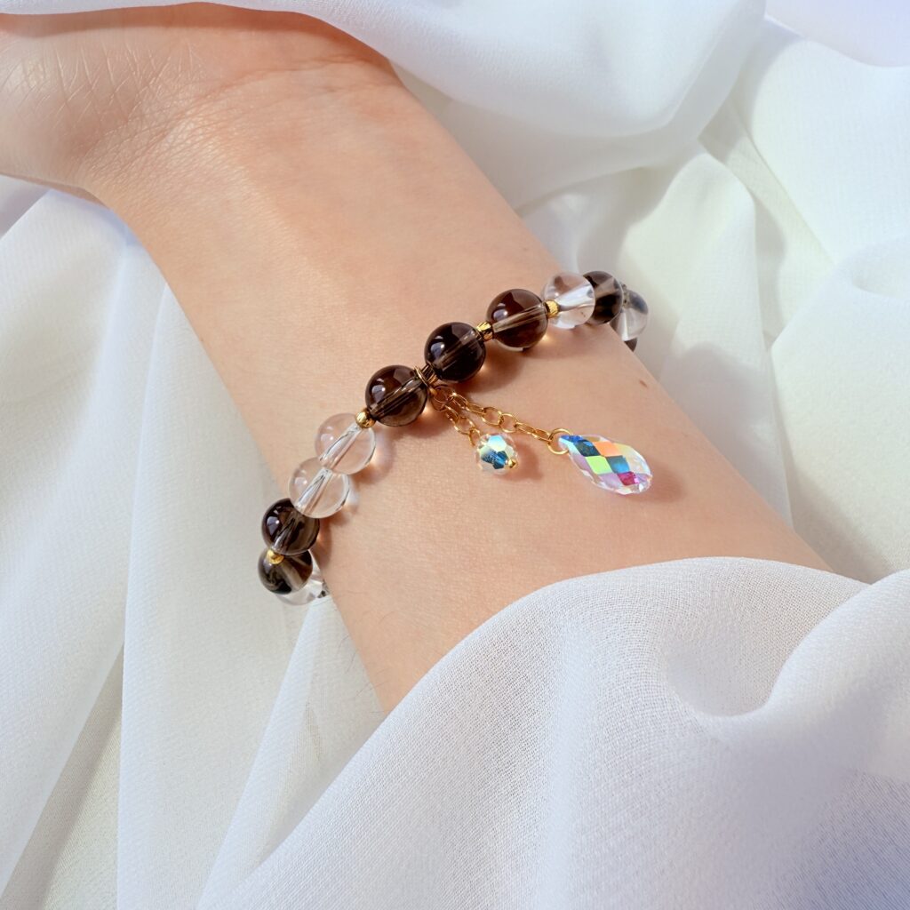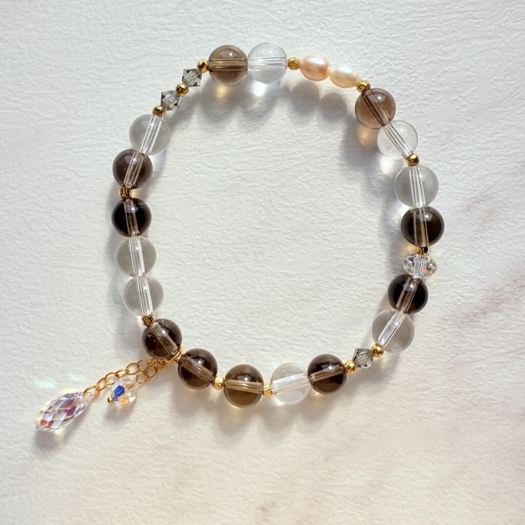 清透水晶搭配細緻金珠,展現純淨優雅的氣質。溫柔光澤在腕間流轉,讓每個舉手投足都散發低調奢華魅力。