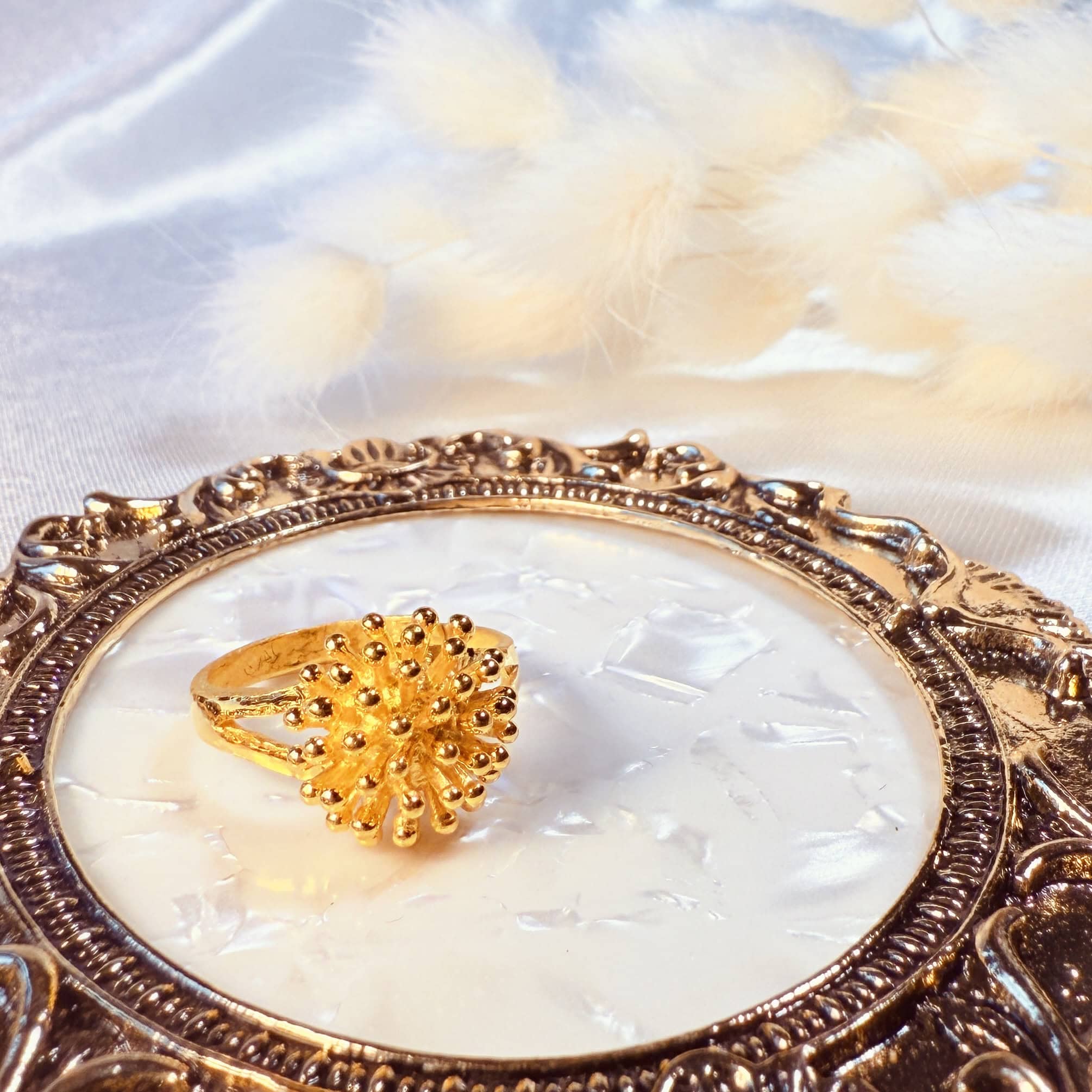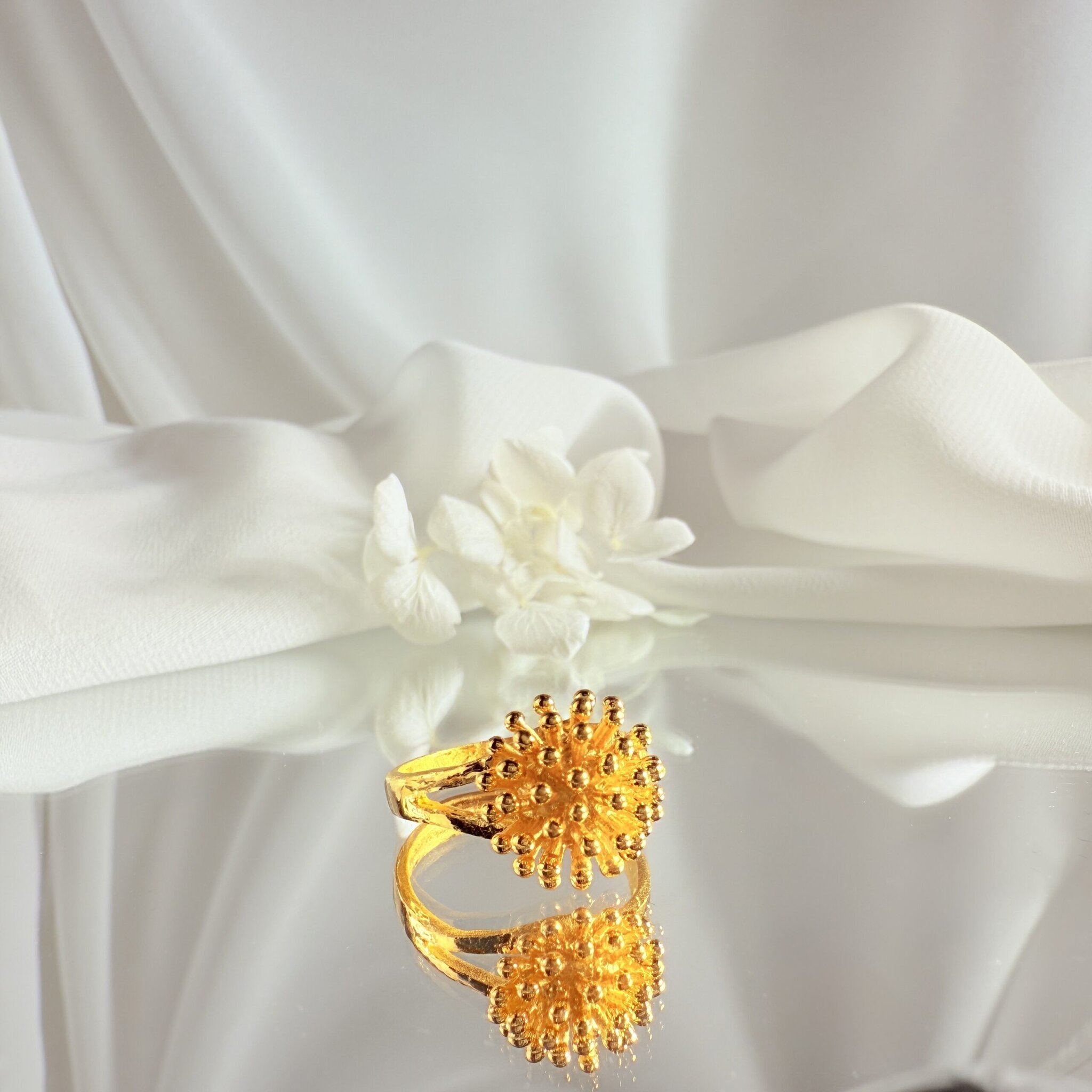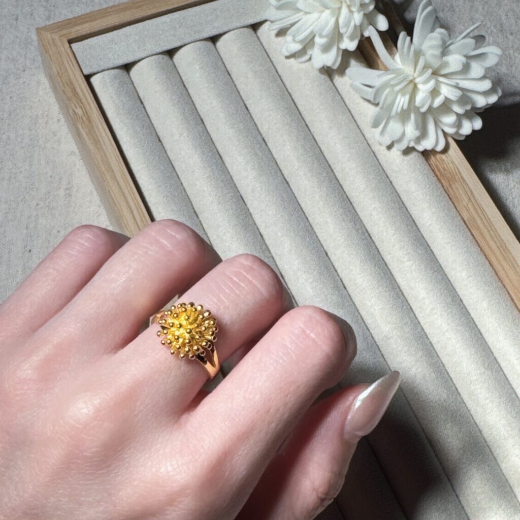 細緻黃金珠粒勾勒繁花姿態,宛如星蕊綻放在指尖,展現華麗卻不失柔美的氣質。無論日常搭配或宴會場合,都能綻放迷人光采,傳遞專屬的優雅浪漫。