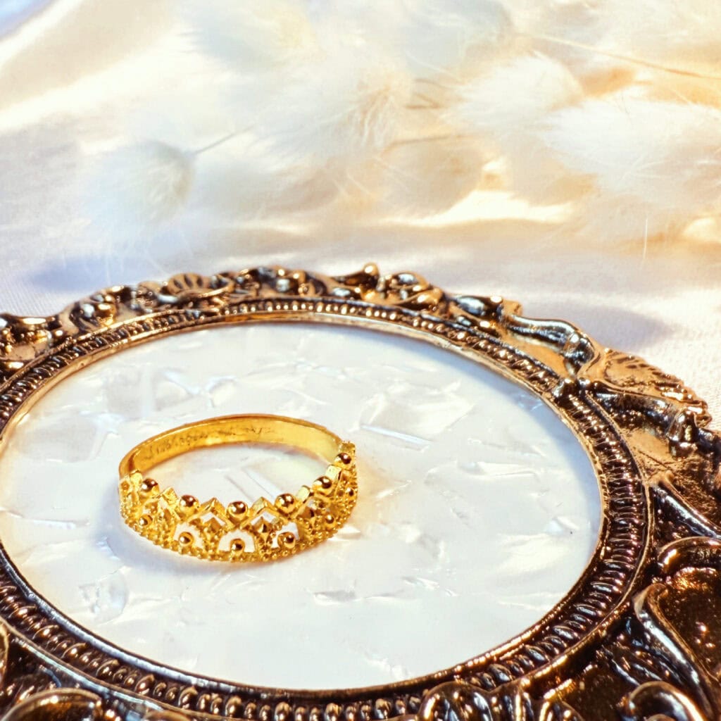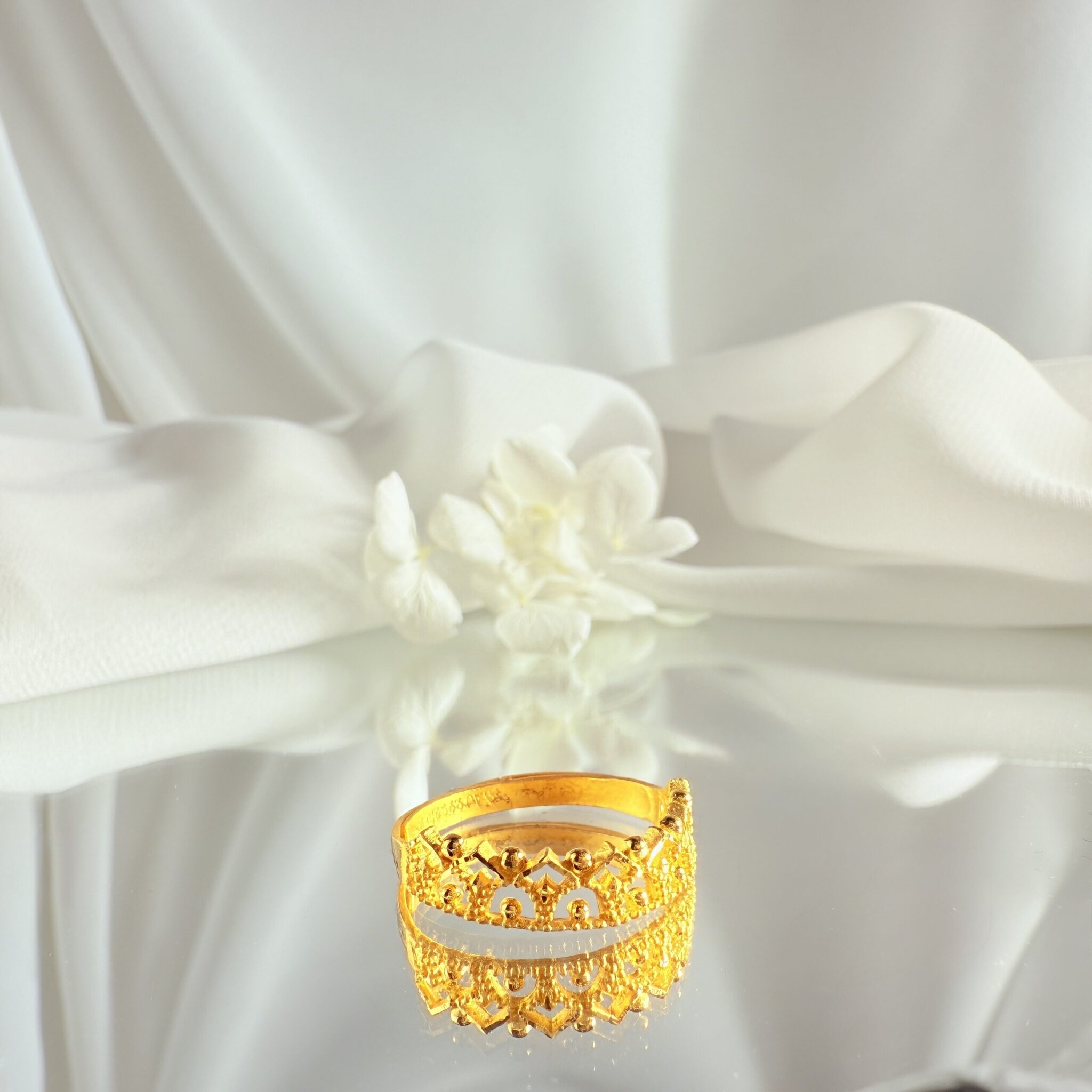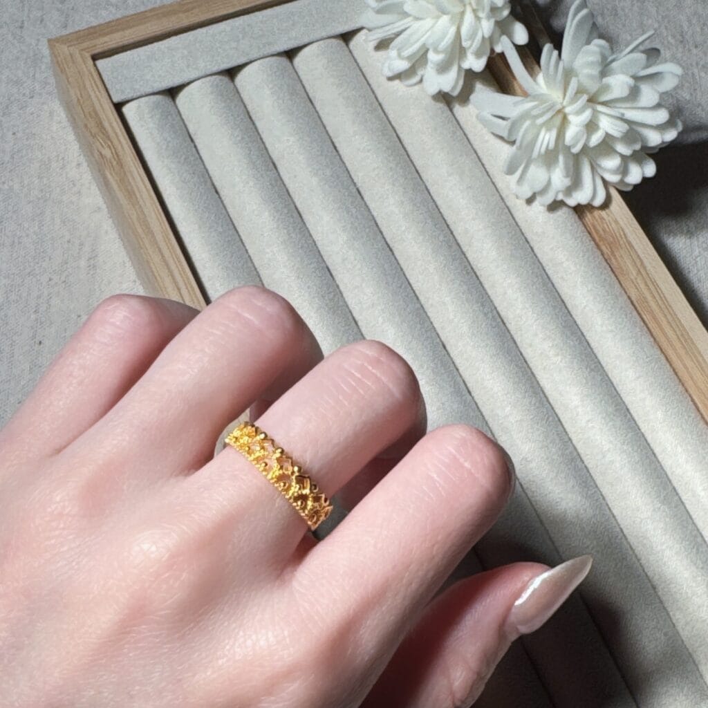 女王般的榮耀與自信,盡在這款華麗皇冠金戒。細緻鏤空設計,閃耀質感,象徵尊貴與榮耀,為你加冕專屬的氣場時刻。