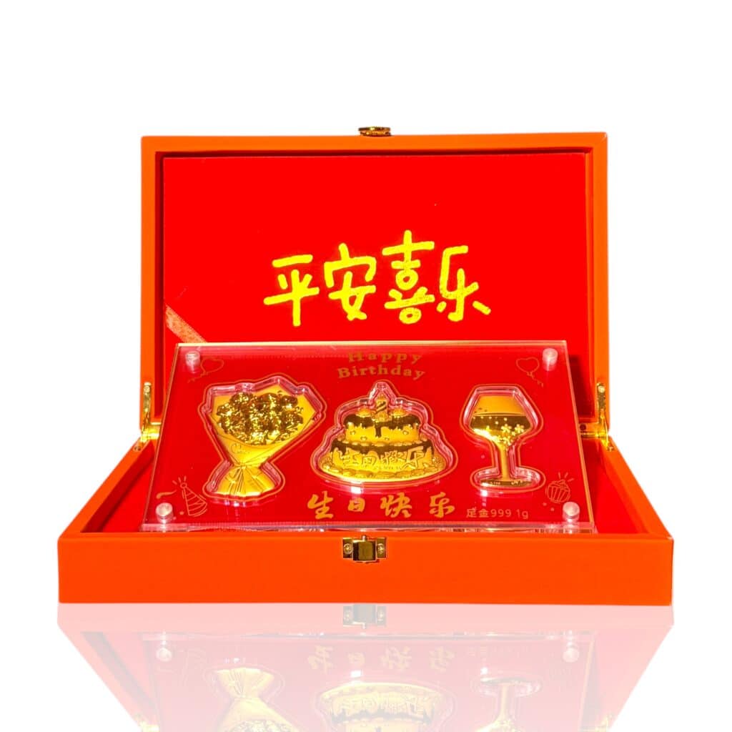 生日專屬的黃金祝福!花束、蛋糕與酒杯三件式擺件,收納於「平安喜樂」燙金禮盒中,閃耀質感、典藏、陳列或送禮皆適合,為壽星帶來滿滿儀式感與誠摯祝福。