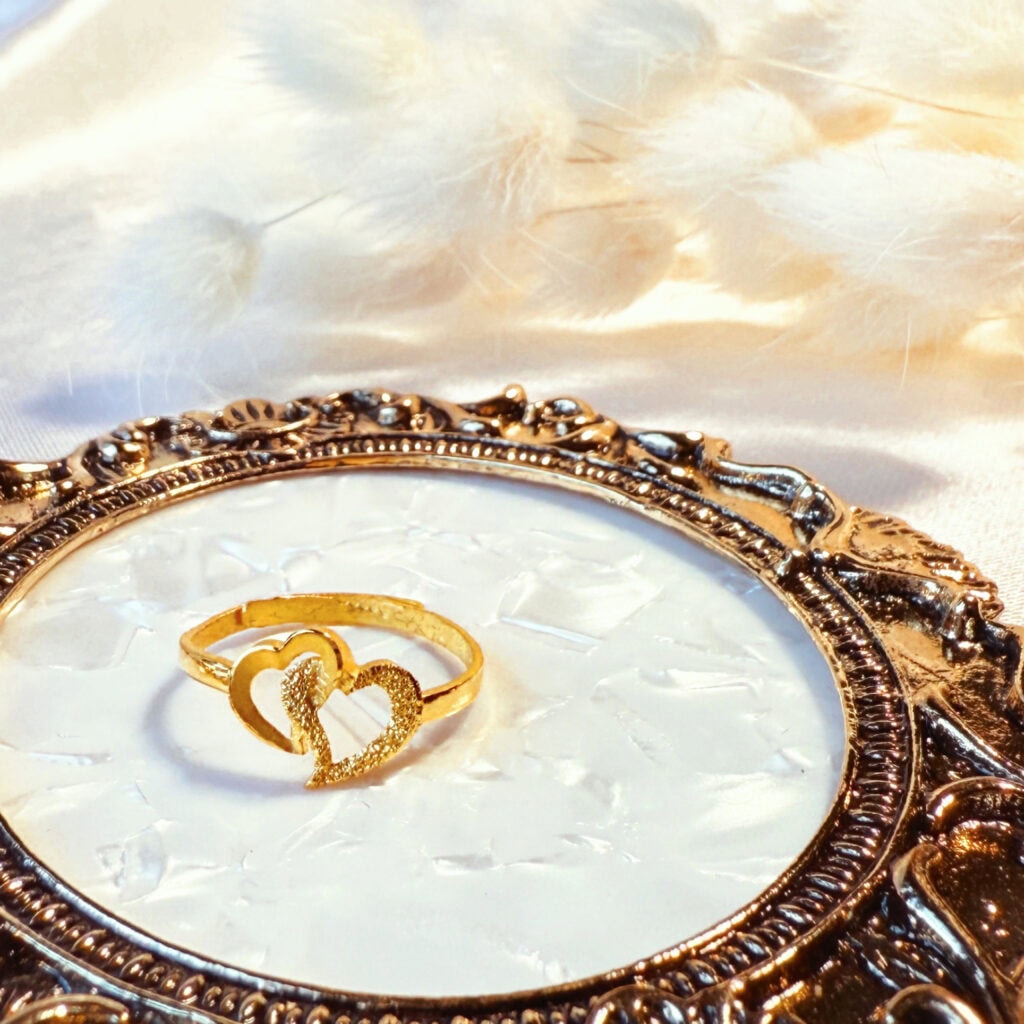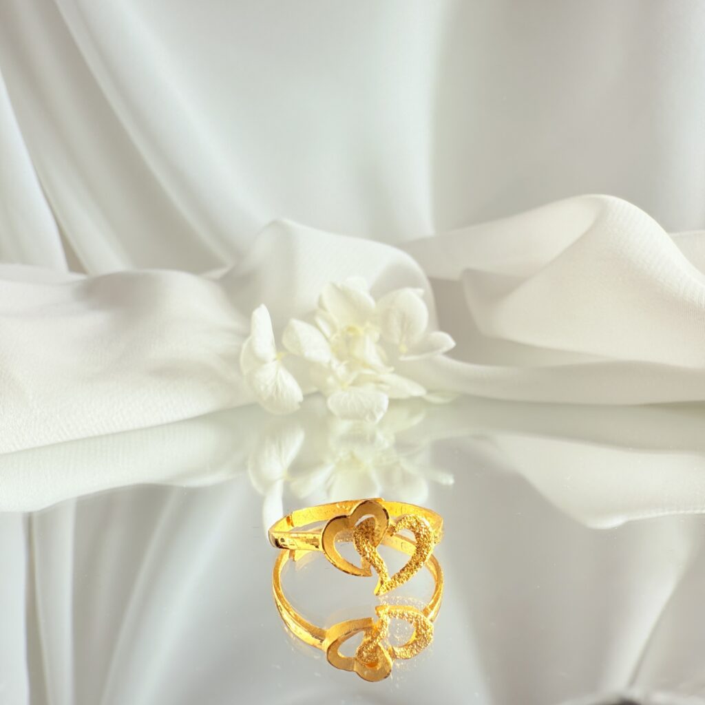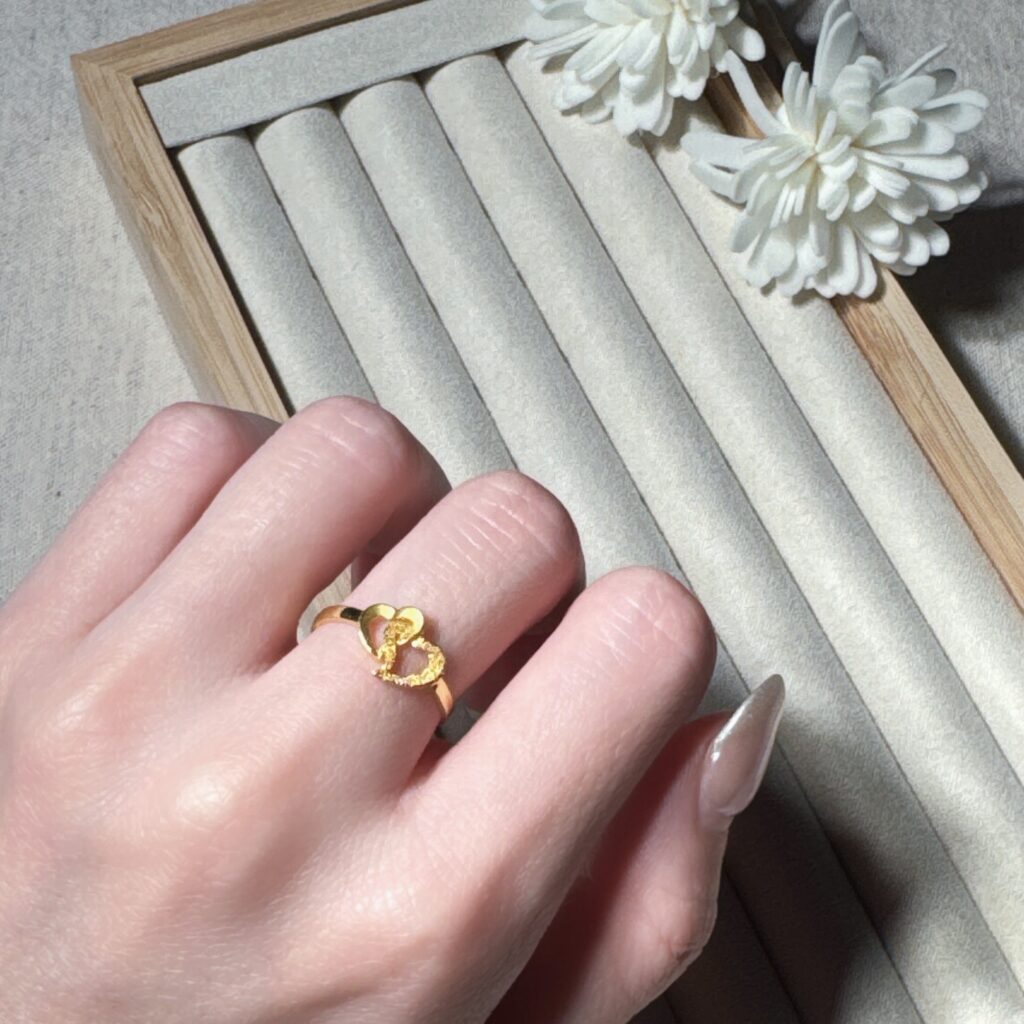 雙心相依,愛意恆久。浪漫設計的雙心純金戒指,象徵心心相印與永恆守護,送禮或自戴都展現幸福與溫暖。