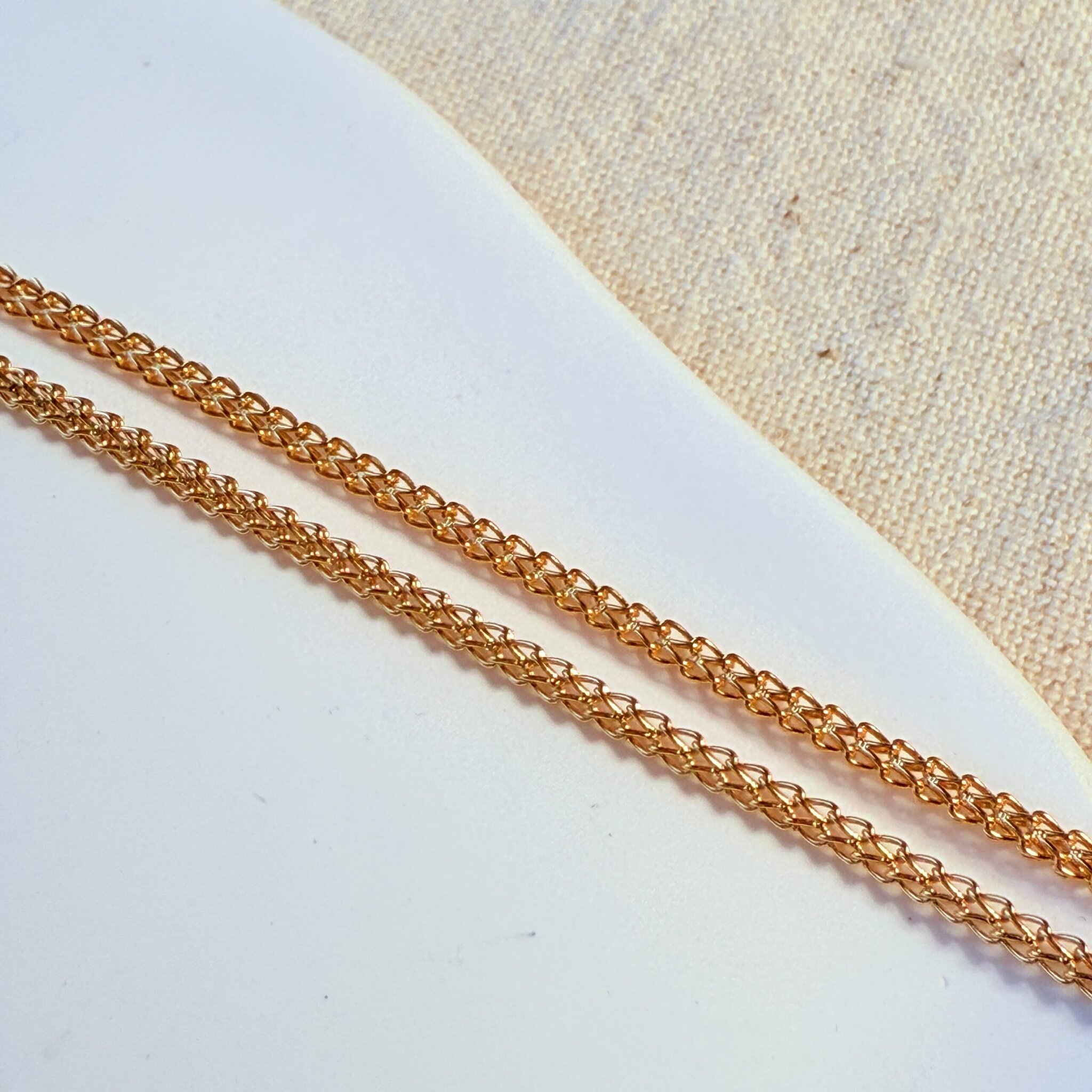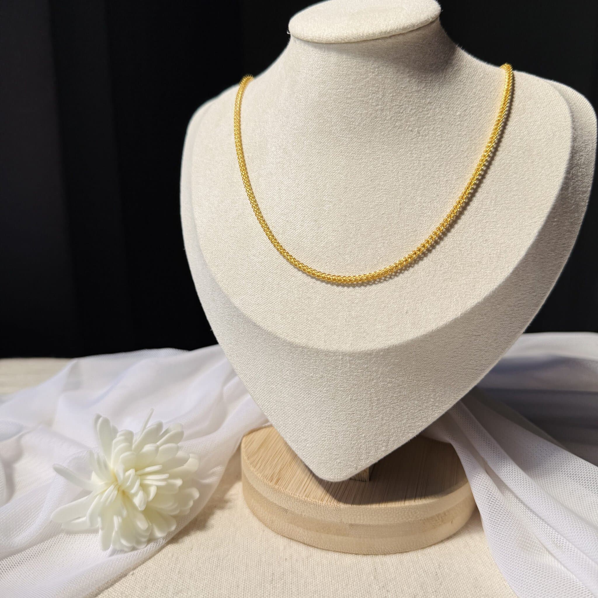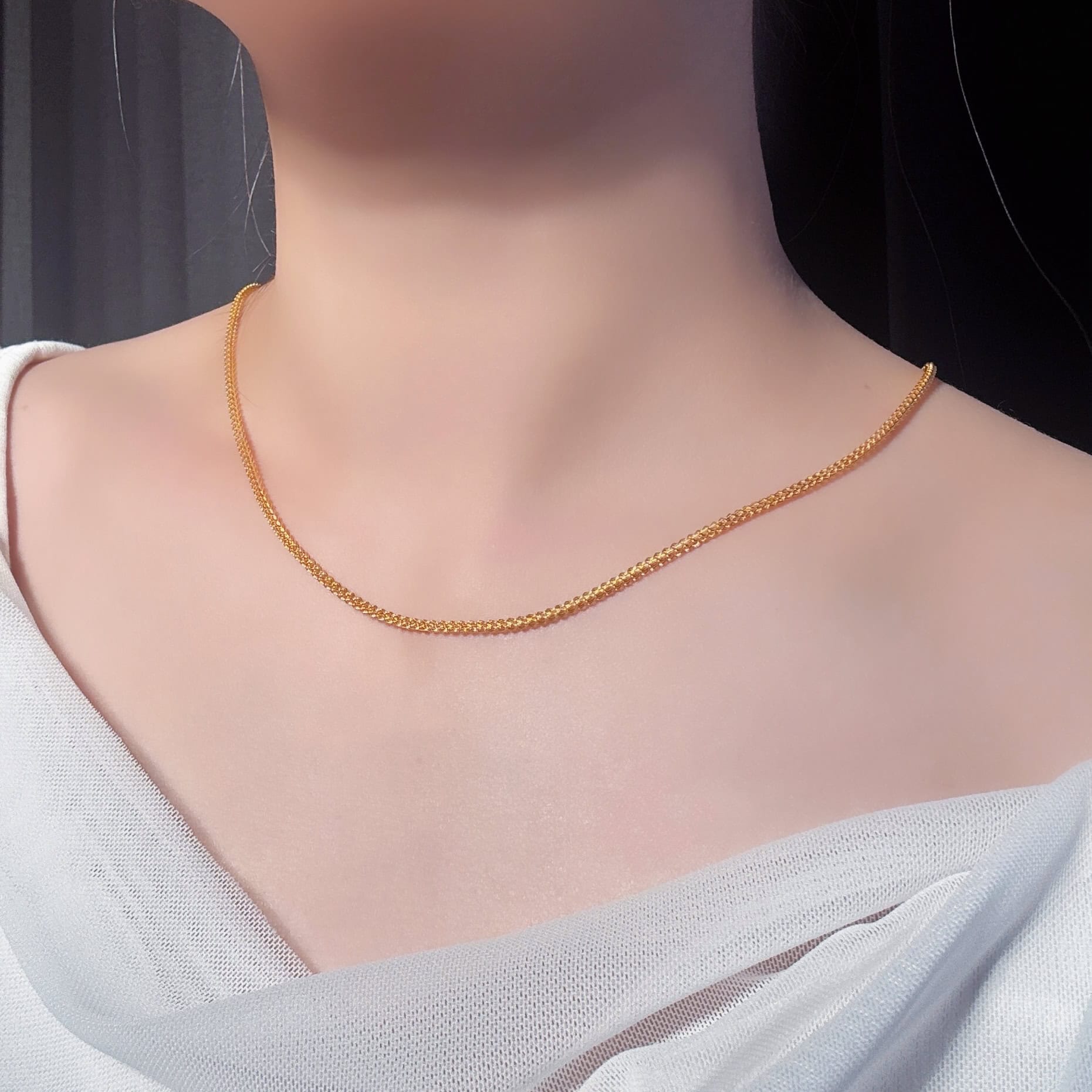 四股編織鏈節緊密排列,如麥穗般流暢,展現細膩工藝與優雅質感。無論單戴或搭配墜飾,都能完美襯托氣質,是日常與正式場合都百搭的純金項鍊。