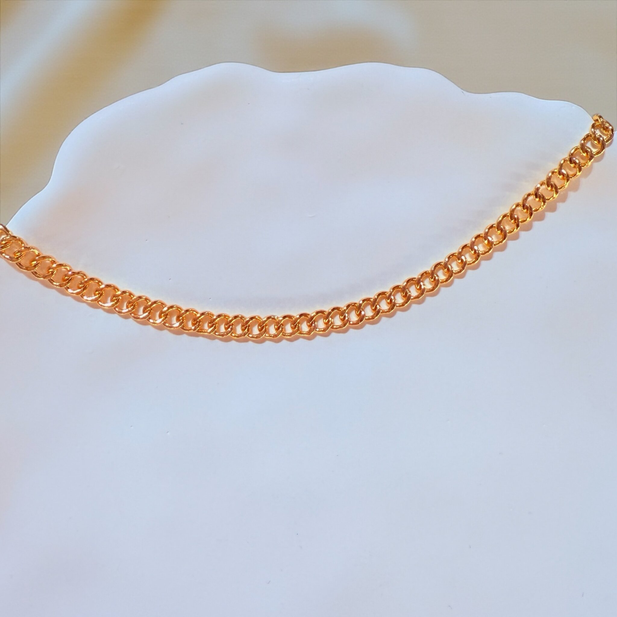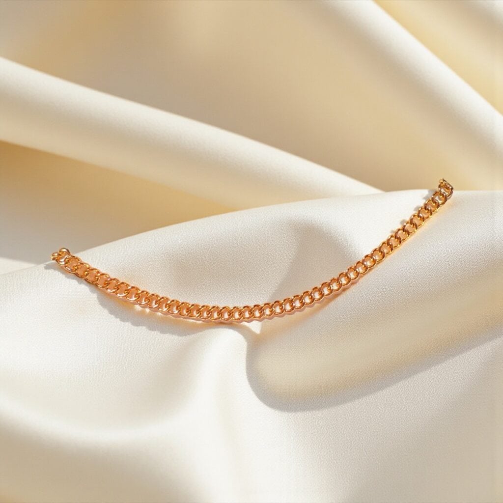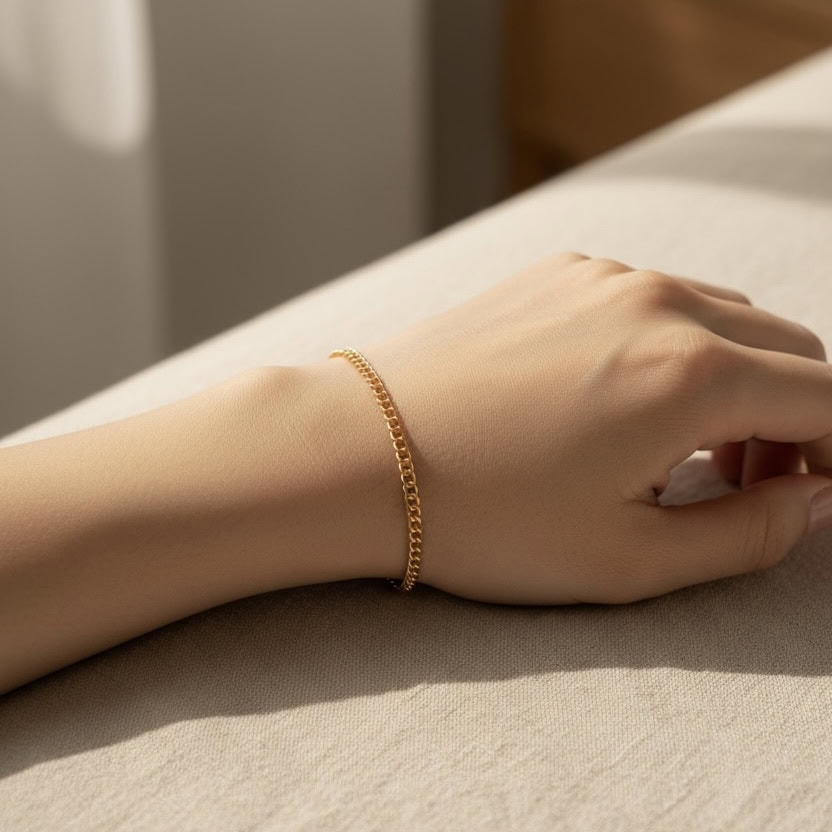 細版古巴鏈節緊密平滑,呈現柔亮光澤;貼合手腕的弧度讓整體更顯精緻輕盈,是日常佩戴也很耐看的質感款式。