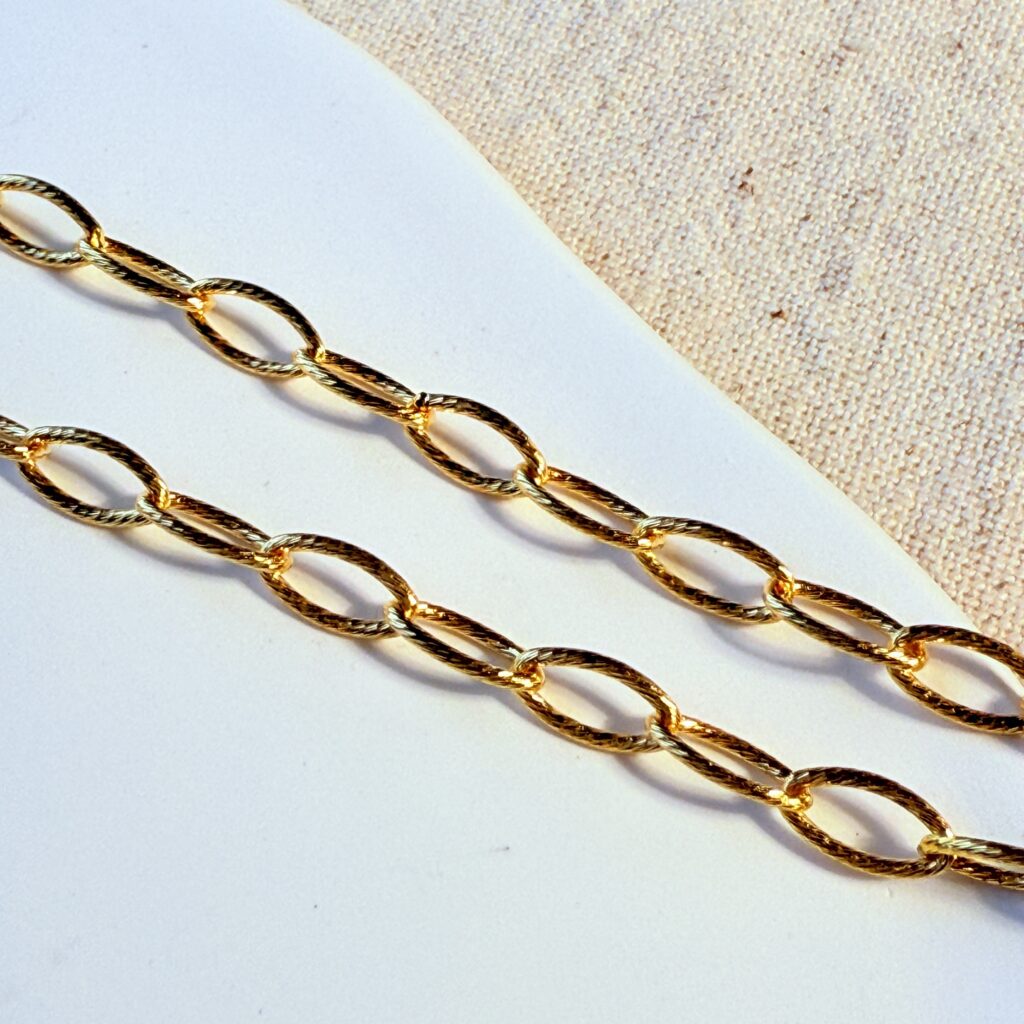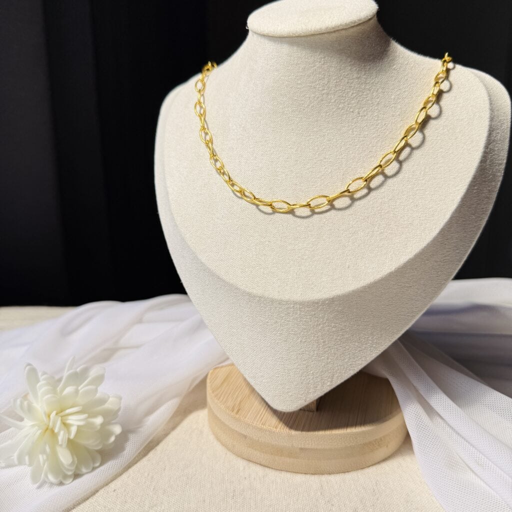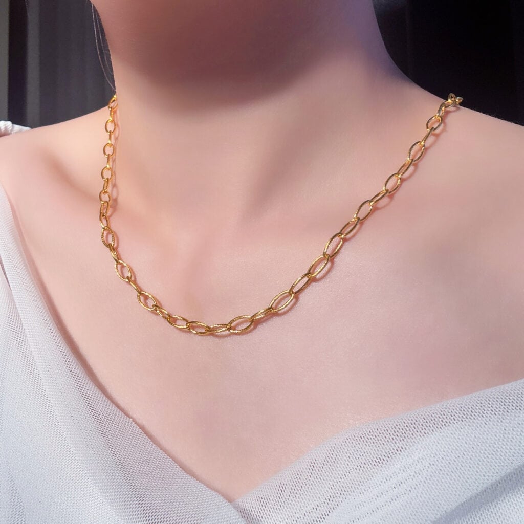 優雅的橢圓環金項鍊,斜紋刻面設計增添立體光澤,適合日常佩戴與正式場合,展現簡約又不失氣質的黃金魅力。