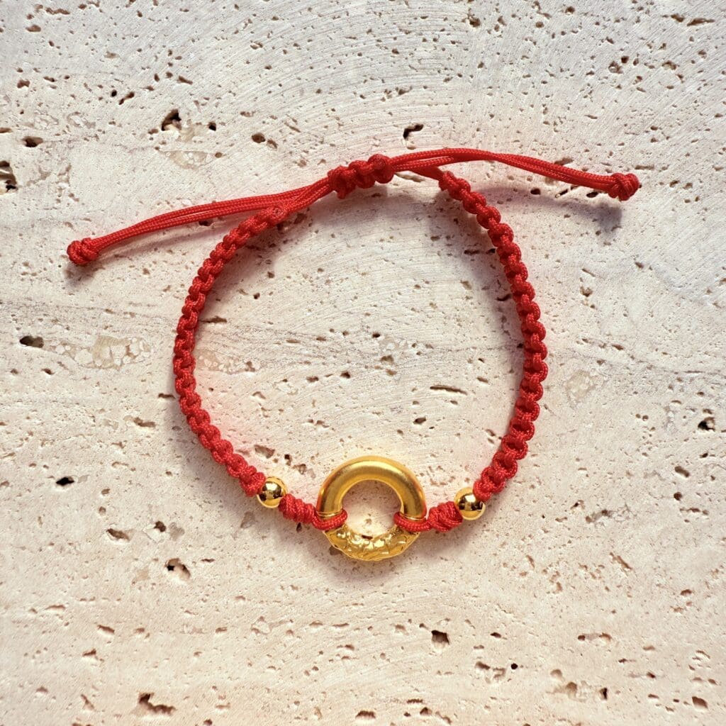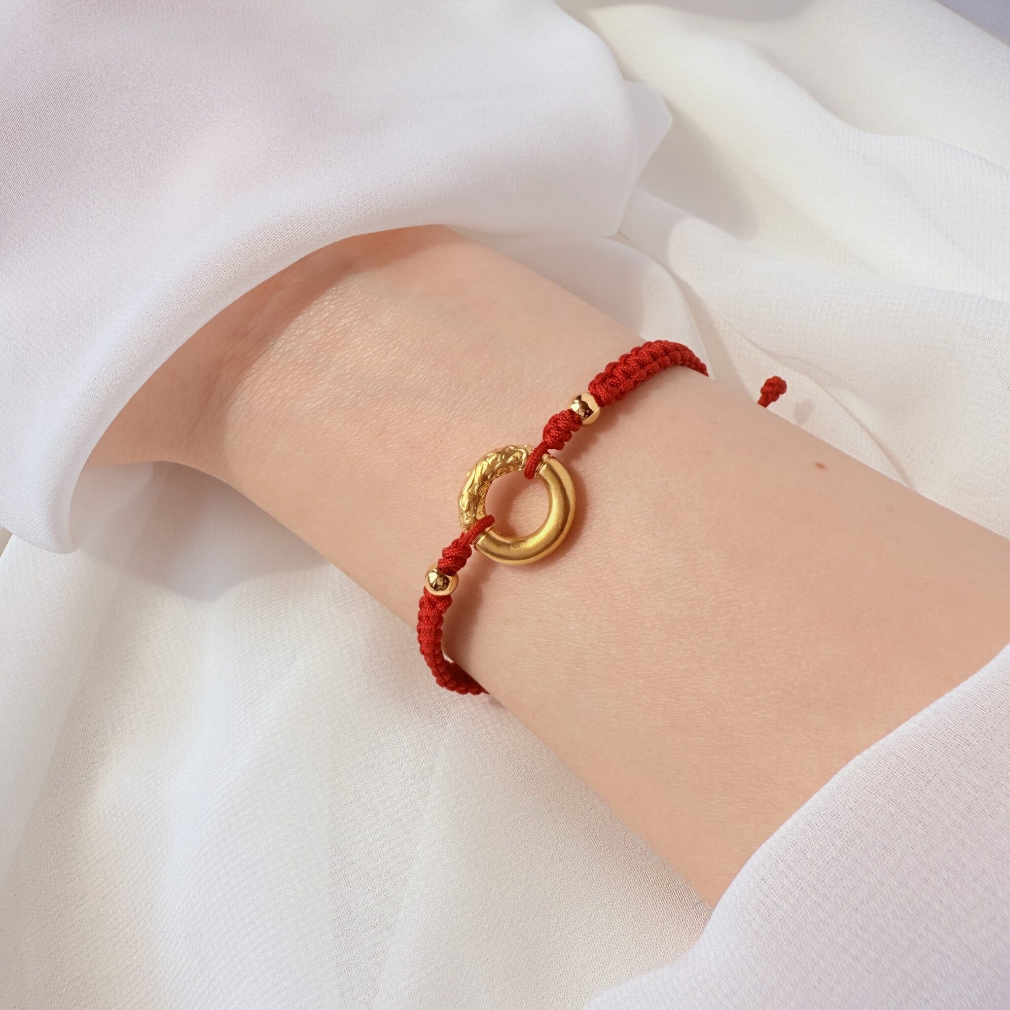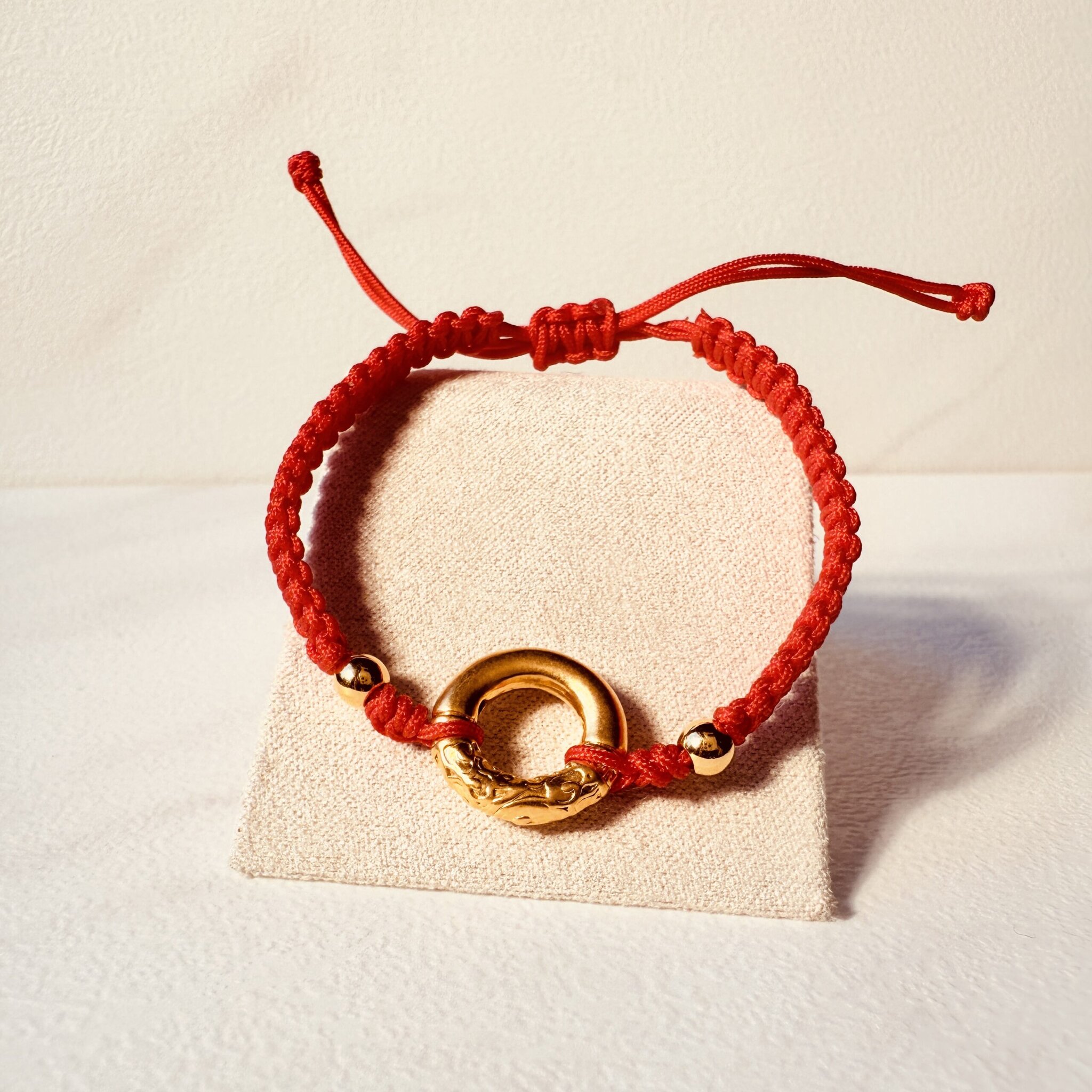 嬰幼兒專屬紅繩手鍊,中央金環配小金珠,象徵圓滿守護。柔軟親膚的細緻編織與滑結可調設計,配戴舒適不勒手;日常好戴、適合彌月與新生兒祝福禮。