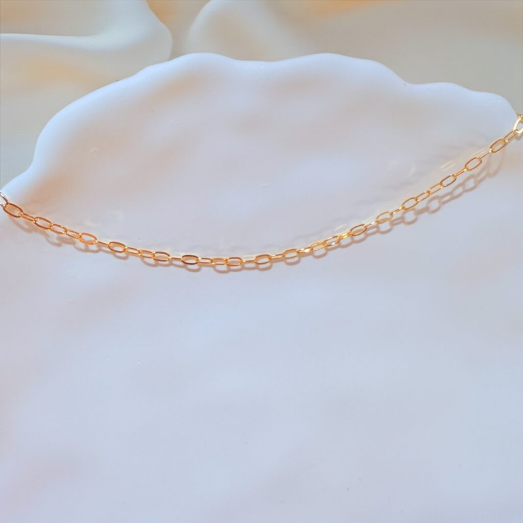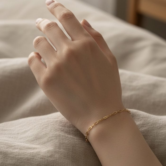 極細鏈節呈現柔和光影,線條輕盈乾淨,單戴即可展現低調質感;貼合手腕的弧度,使日常穿搭多一份優雅與精緻。