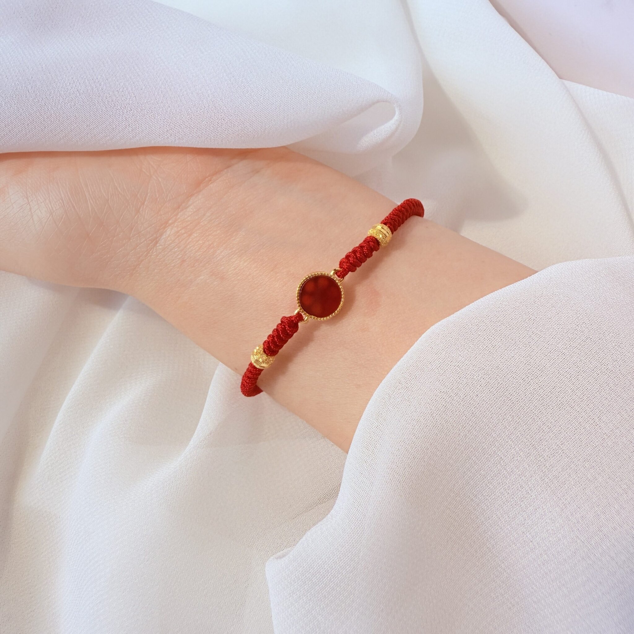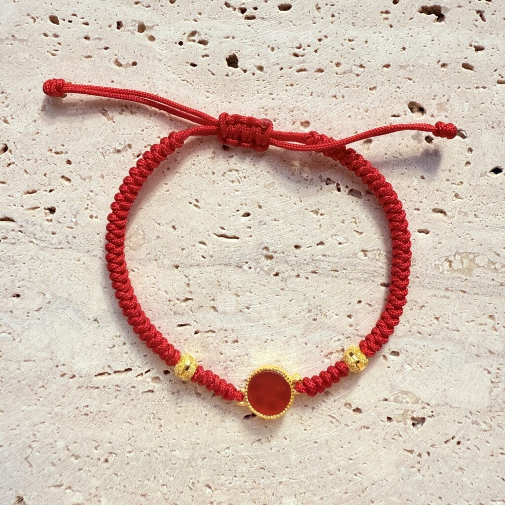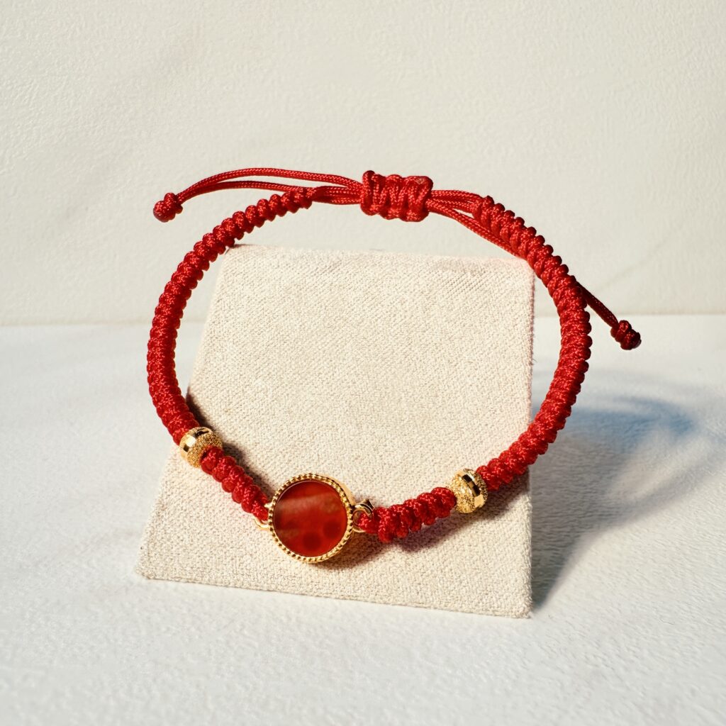 圓潤紅色主飾象徵心願守護,搭配編織紅繩與金色珠飾相映成趣;尺寸可調,單戴亮眼、疊戴更顯氣質,日常佩戴或送禮轉運都百搭。