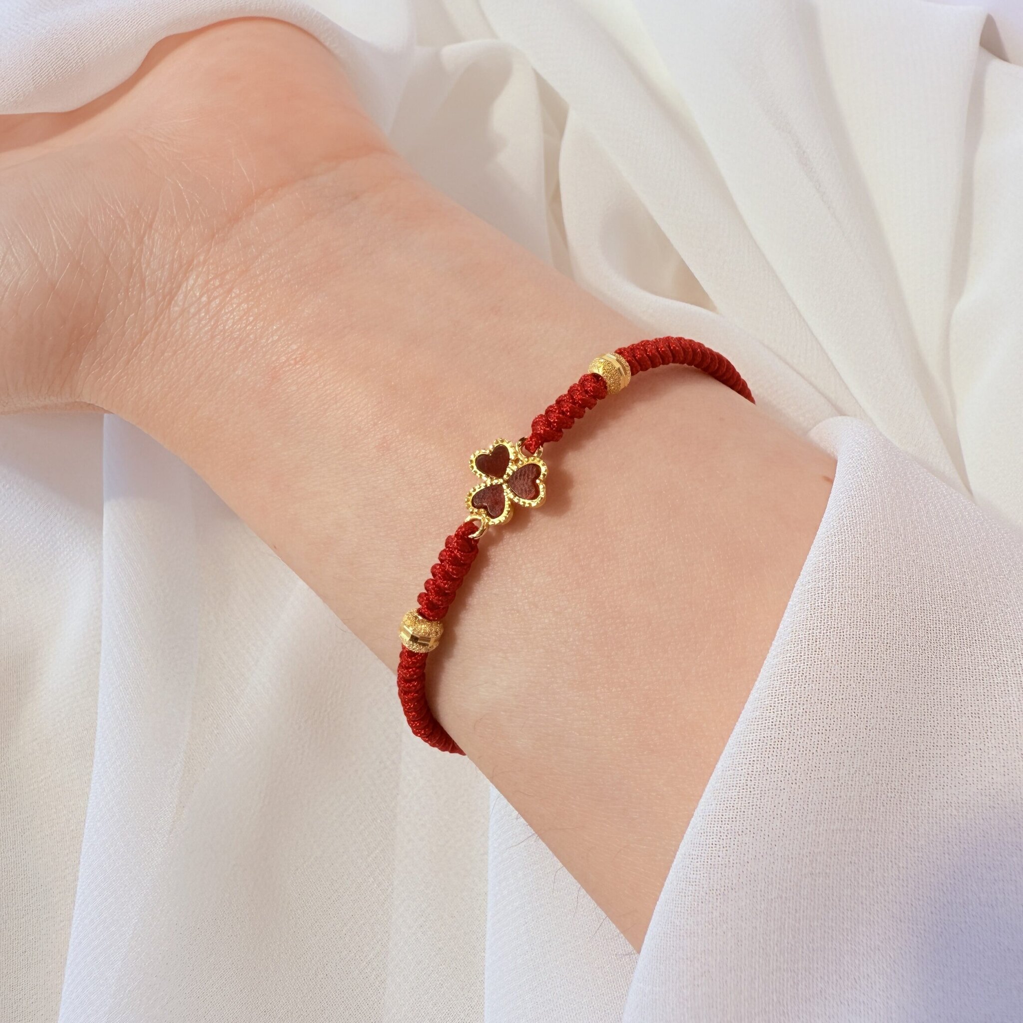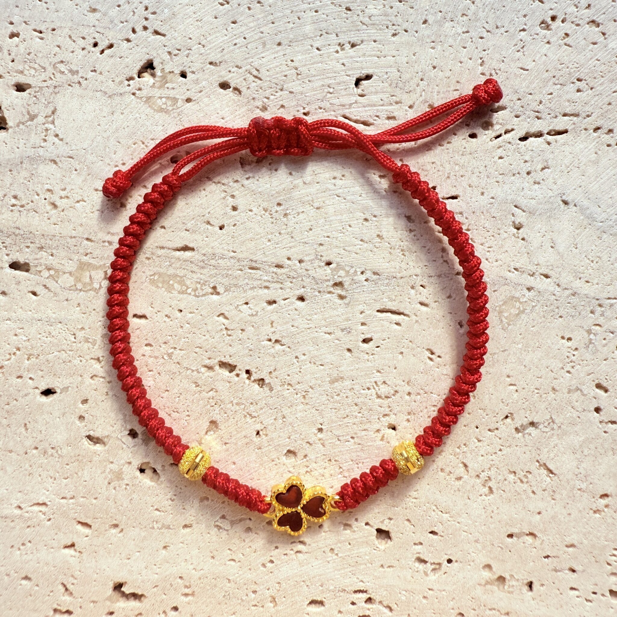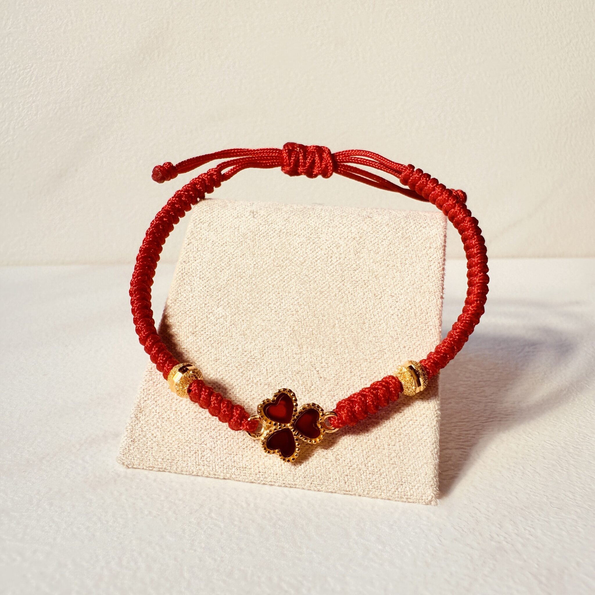 紅繩凝結愛與祝福,心形花瓣構成的幸運草象徵幸運相隨;金色微邊精緻閃耀、尺寸可調,日常百搭也適合送禮,為妳鎖住好運與甜蜜。