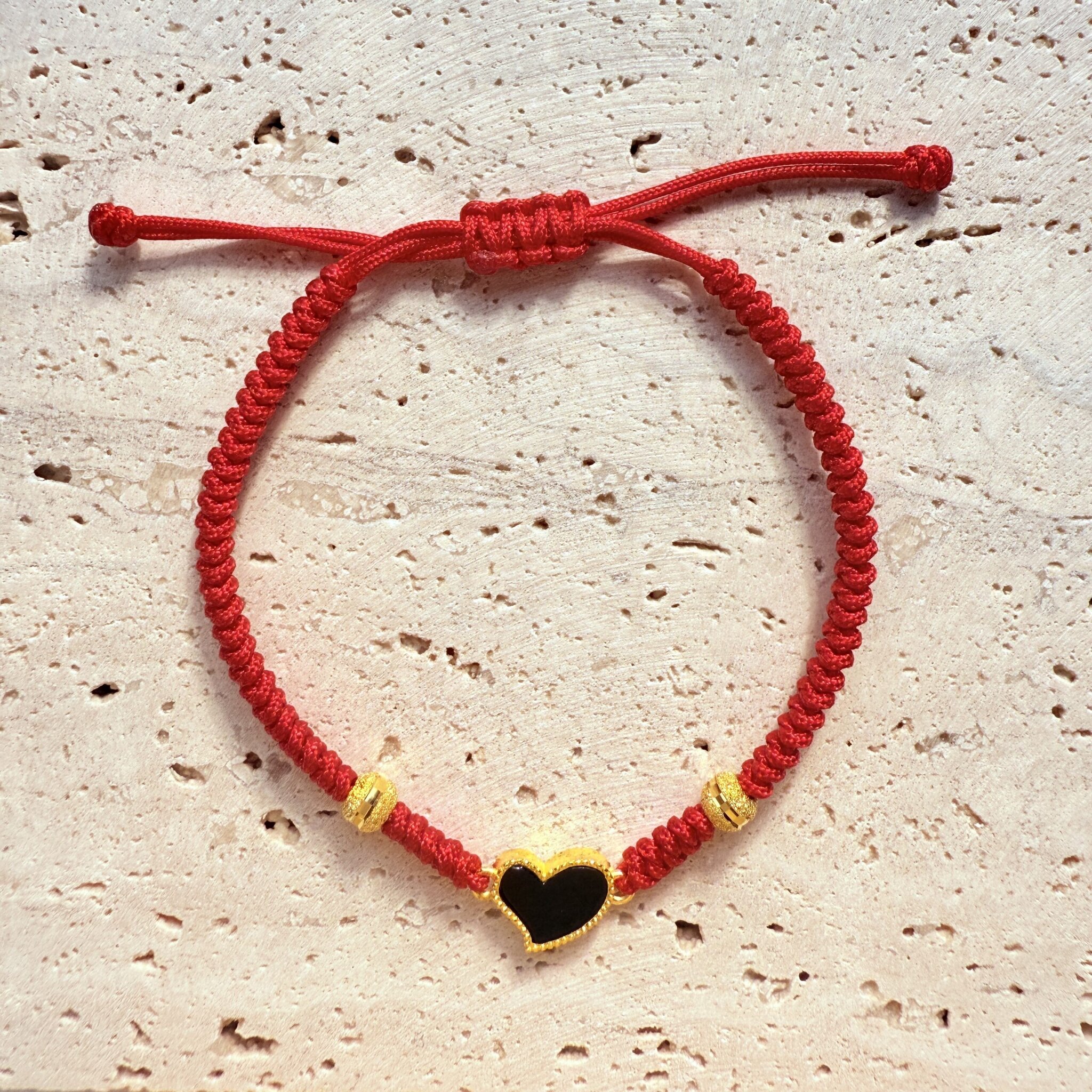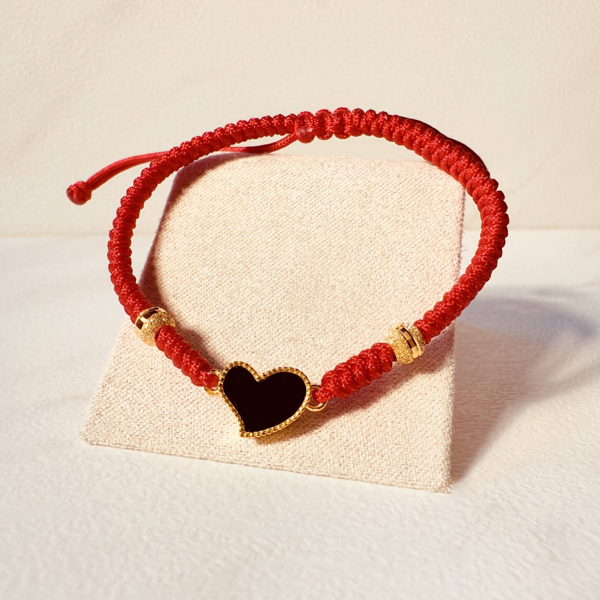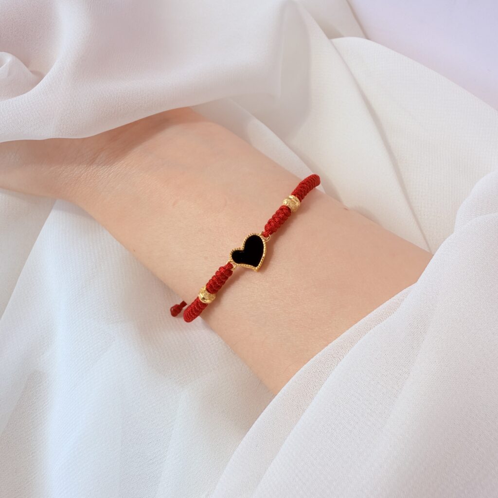 以幸運紅繩串起金色邊框黑心吊飾,顯白耐看;滑扣可調尺寸,單戴甜美、疊戴俐落。每天配戴或當告白、生日禮物都剛剛好。