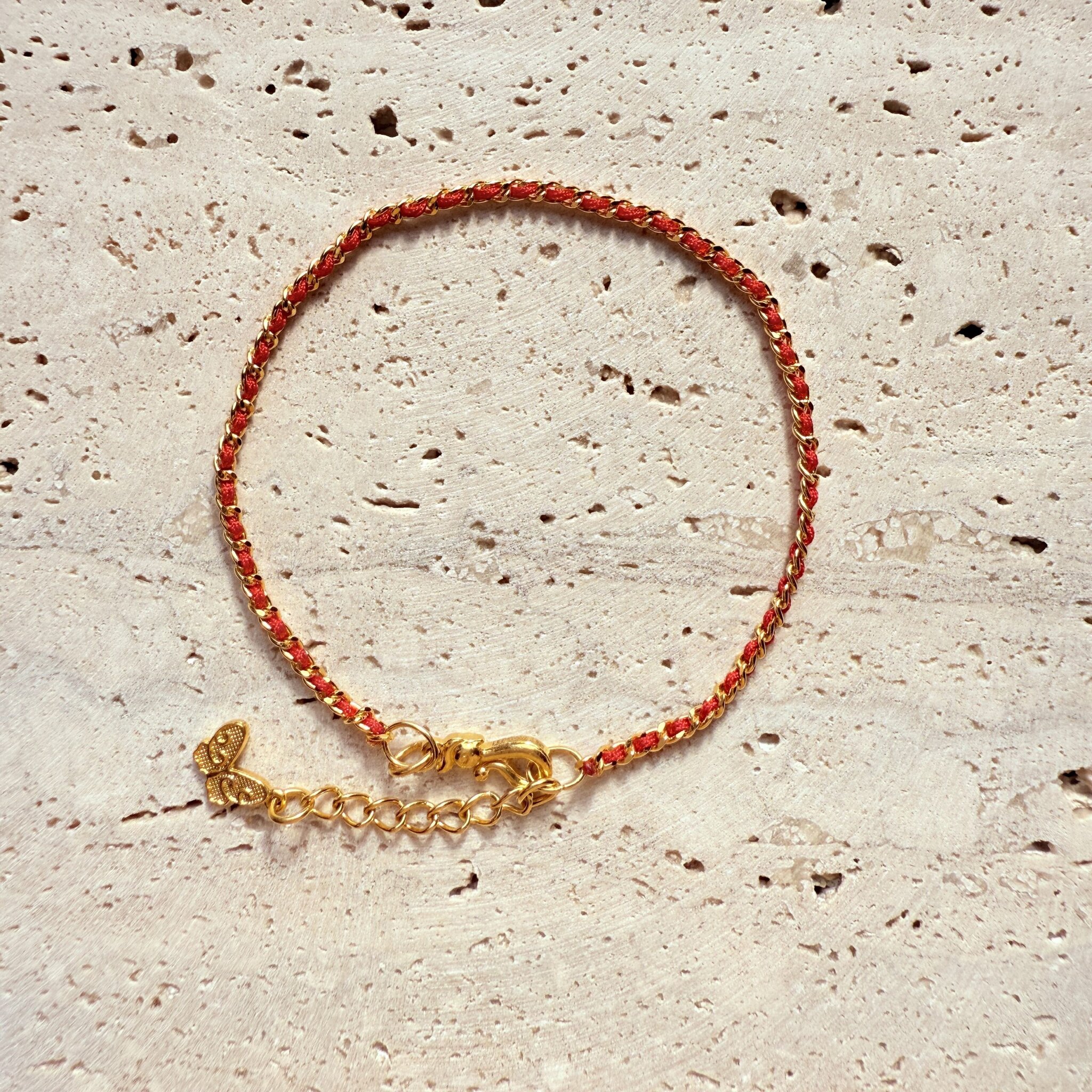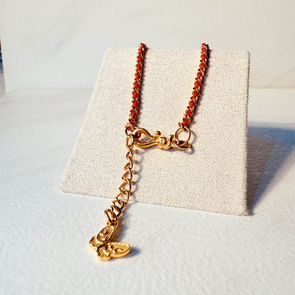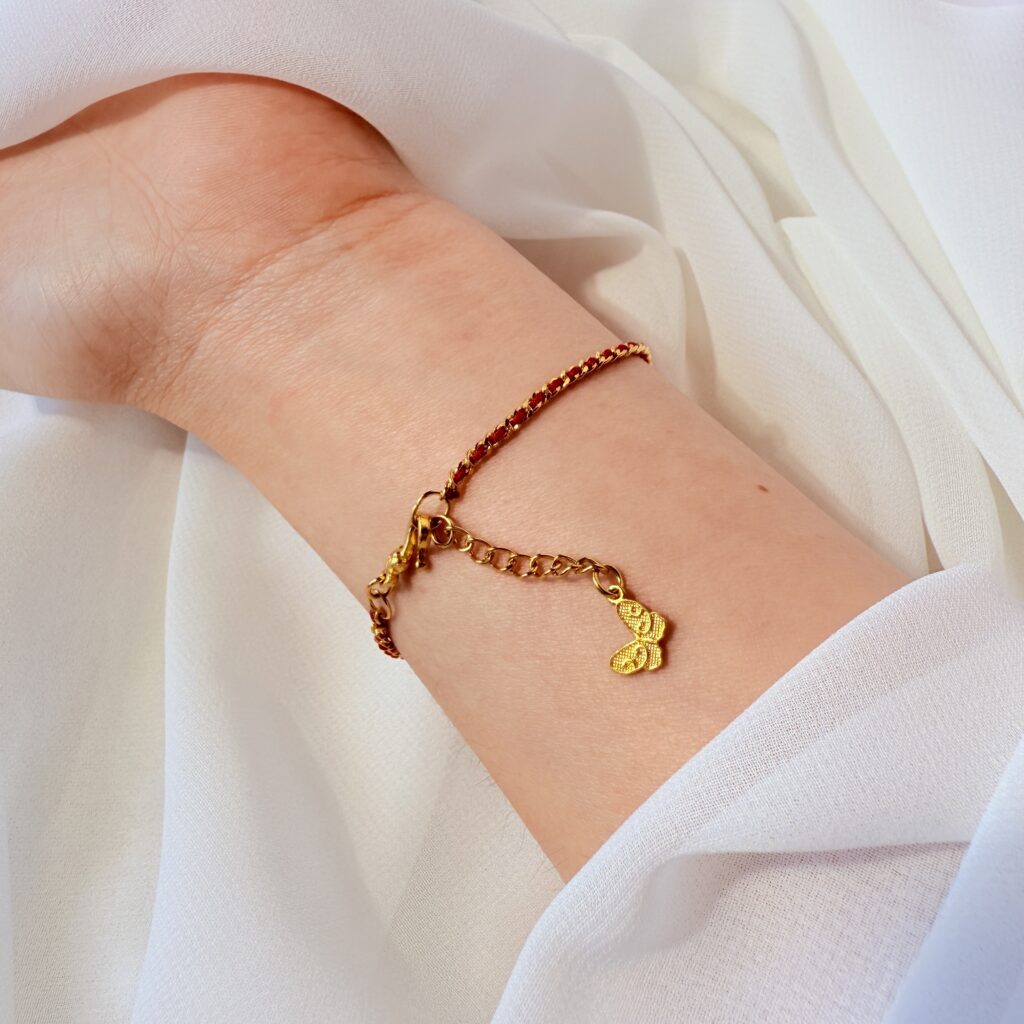 紅線交織金鍊,垂墜精緻小蝶,象徵幸運與新生。輕盈好戴,單戴疊搭皆亮眼,溫柔顯白的日常質感手鍊。