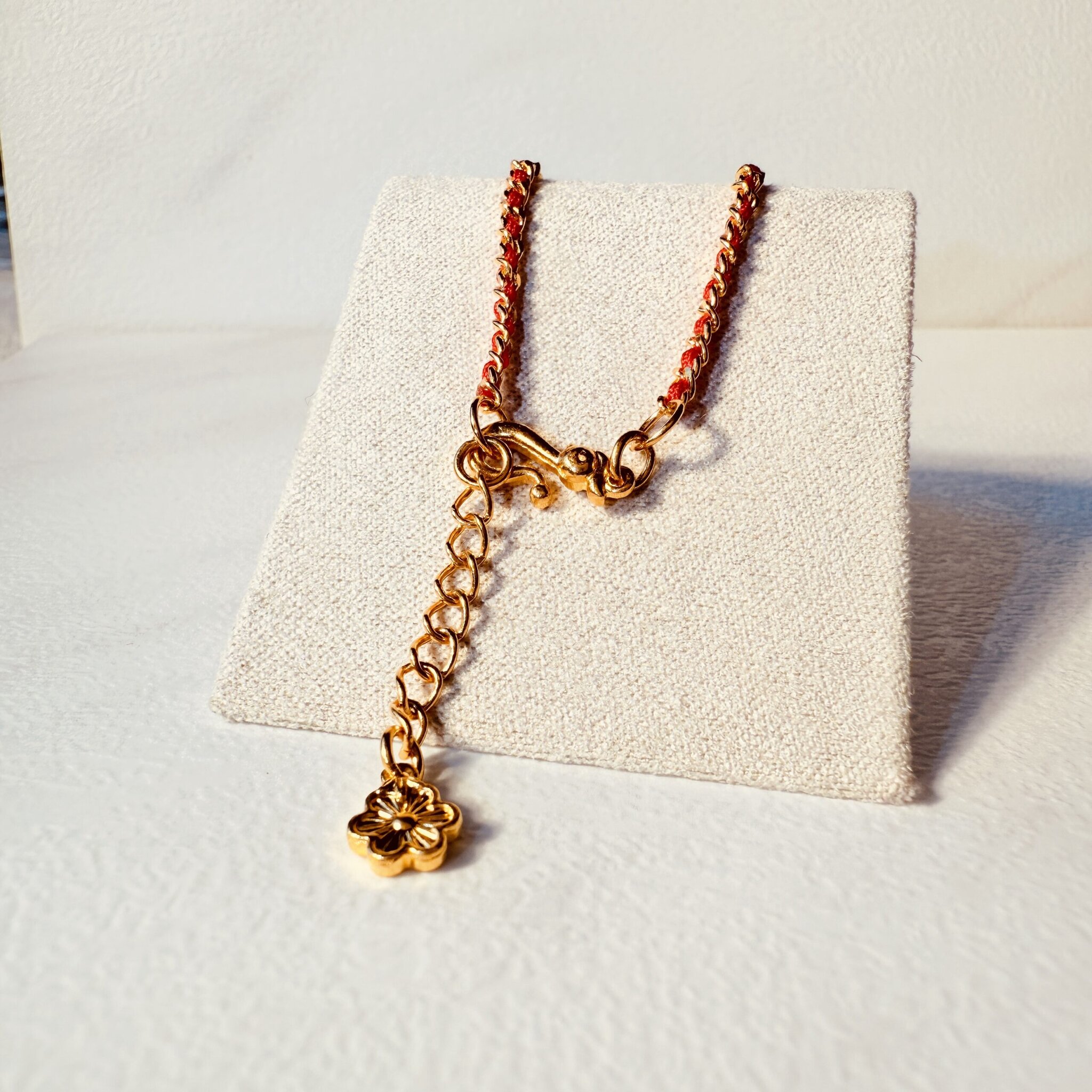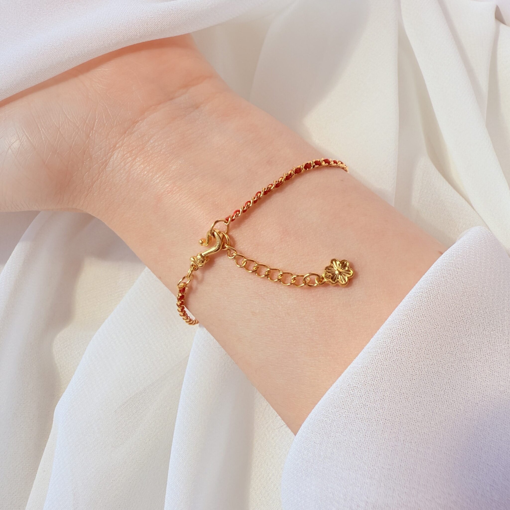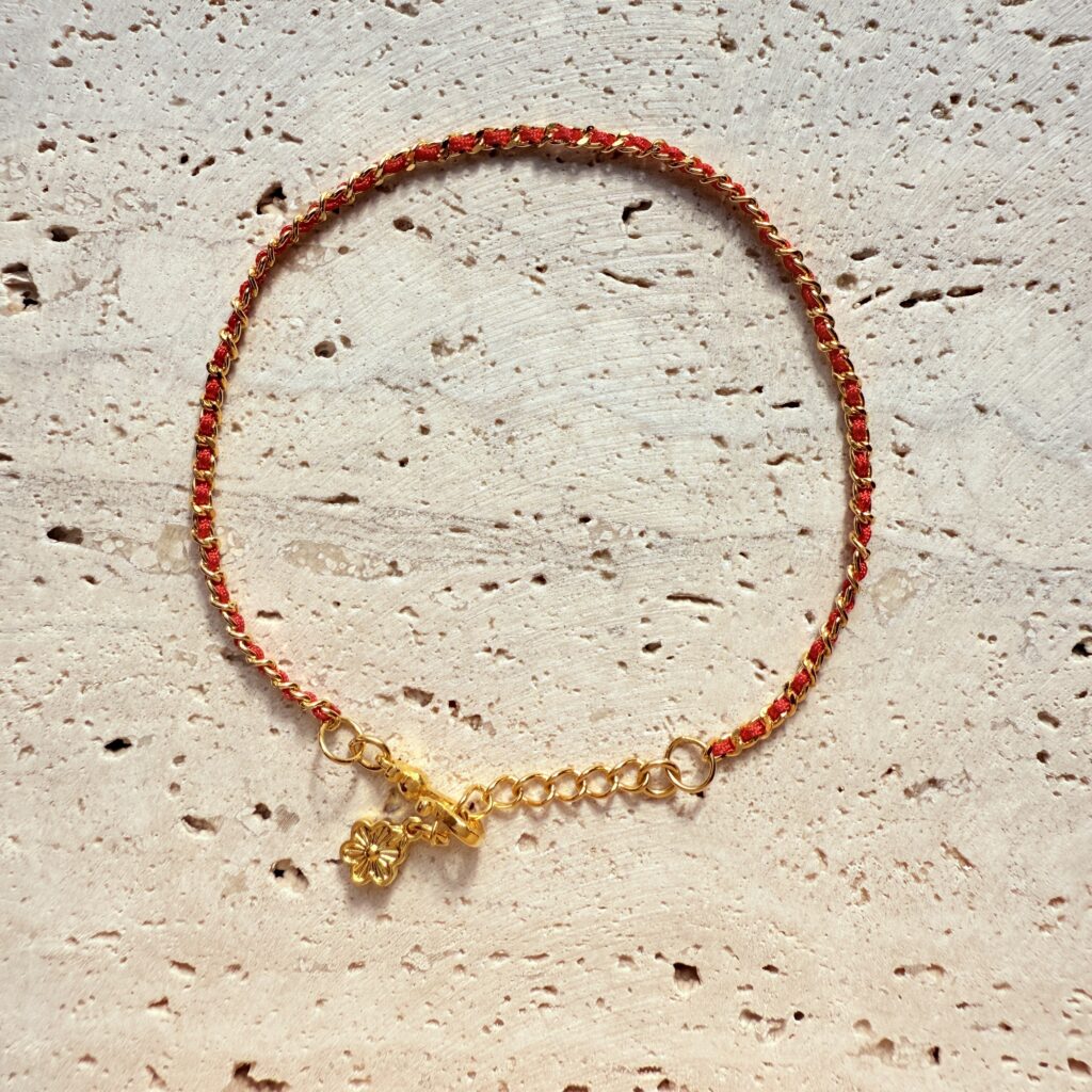 紅織線與金色鏈條的混搭設計,小花墜輕盈閃耀,附延長鍊好調整;日常、約會與送禮皆百搭,替手腕添上甜美幸運感。