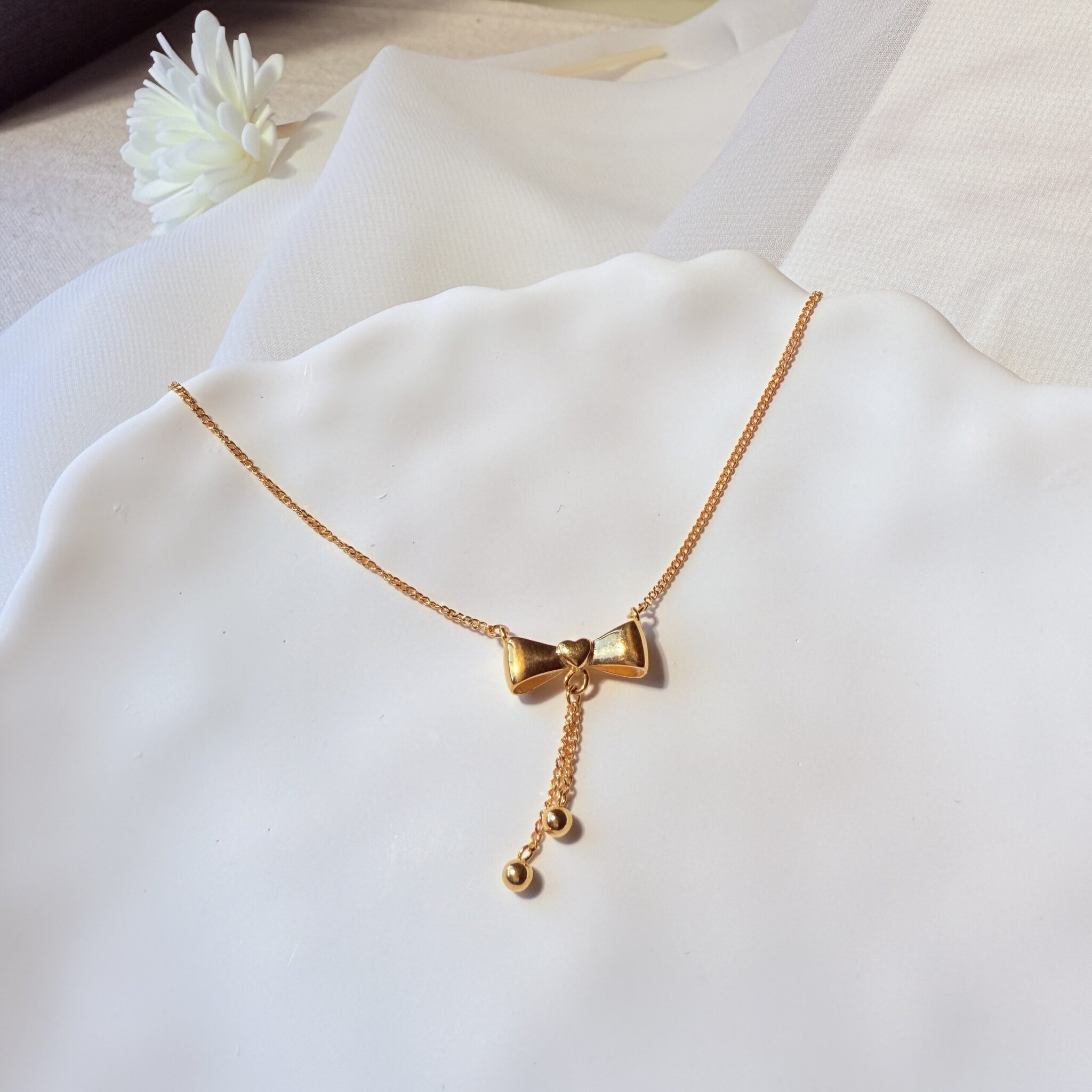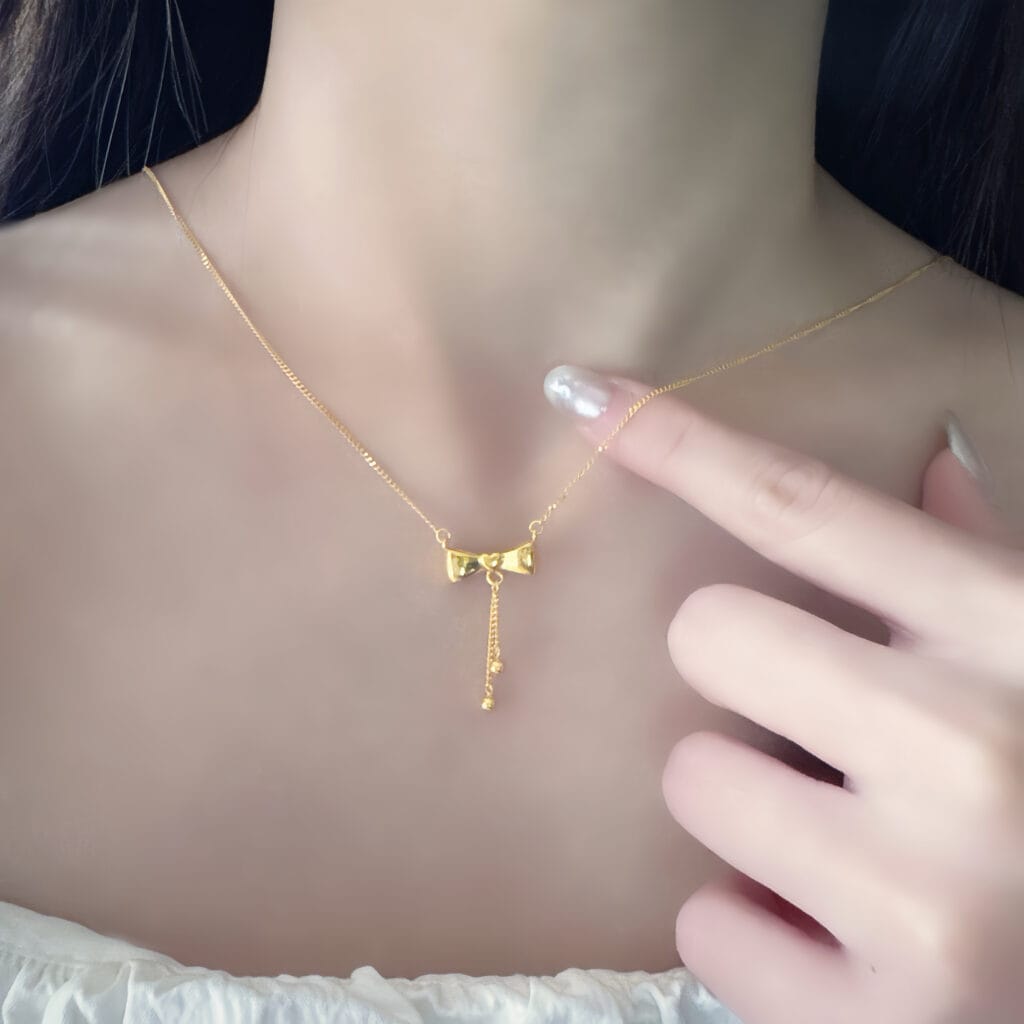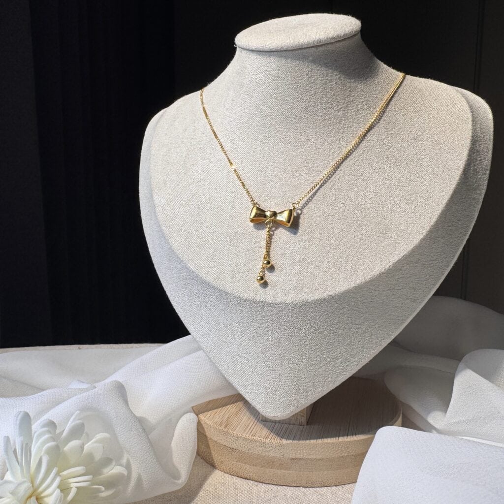 縈夢蝶舞項鍊,立體蝴蝶結設計搭配流蘇垂墜,金珠點綴間展現靈動光澤。浪漫優雅的氣質,讓妳在日常與約會中都能綻放甜美光彩。