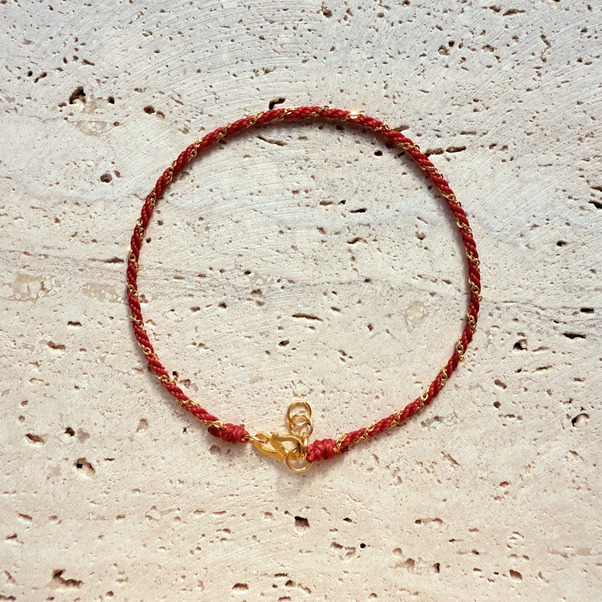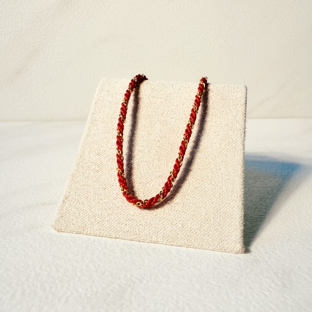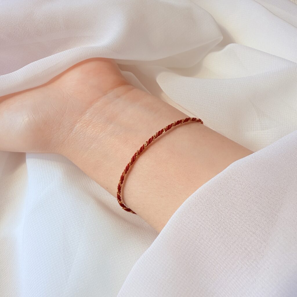 細緻紅繩交織金色亮線,纖細顯白又百搭;單戴清新、疊戴更有層次,象徵好運與守護。可日常配戴與送禮的質感選擇。